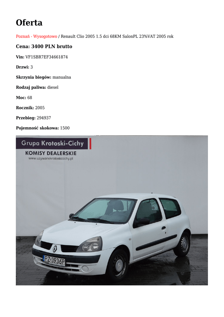 Oferta Poznań - Wysogotowo / Renault Clio 2005 1.5 dci 68KM SalonPL 23%VAT 2005 rok Cena: 3400 PLN brutto Vin: VF1SBR7EF34661874 Drzwi: 3 Skrzynia biegów: manualna Rodzaj paliwa: diesel Moc: 68 Rocznik: 2005 Przebieg: 294937 Pojemność skokowa: 1500 Opis: Auto-Handel-Centrum Krotoski-Cichy Autoryzowany Dealer VW Audi Seat Skoda GWARANCJA POCHODZENIA MOŻLIWOŚĆ SPRAWDZENIA POJAZDU W STACJI OBSŁUGI. MOŻLIWOŚĆ POZOSTAWIENIA SWOJEGO SAMOCHODU UŻYWANEGO W ROZLICZENIU Uwaga: Miejsce ekspozycji pojazdu - Grupa Krotoski-Cichy Salon Pojazdów Używanych Wysogotowo, ul. Skórzewska 8 Osoba kontaktowa tel: Maximilian Gera - 609 790 272 Przemysław Mantaj - 601 750 883 Mariusz Kowalewski - 609 795 053 Możliwa jazda próbna po wcześniejszym uzgodnieniu terminu Renault Clio Societte - wersja Van - 2 osobowy Silnik: 1.5 DCI 64KM Pojazd zakupiony w Polskim Salonie Rok produkcji: 2005 Przebieg: 294 937 km Wyposażenie: Elektryczne szyby przednie Centralny zamek Immobiliser Podgrzewana szyba tylna Wspomaganie układu kierowniczego i inne Oferujemy kompleksową obsługę sprzedaży ratalnej na bardzo dogodnych warunkach - w celu bliższego zapoznania się z aktualną ofertą finansowania prosimy o kontakt : Katarzyna Świątkiewicz - 661 617 974 Oferujemy ubezpieczenia samochodowe z wiodących na rynku ubezpieczalni - możliwość zakupu pakietu ubezpieczeniowego na miejscu. Oferujemy możliwość jazdy próbnej przed zakupem oraz usługę inspekcji pojazdu. Przyjmujemy również w rozliczeniu każdy pojazd. Ogłoszenie ma charakter informacyjny i stanowi zaproszenie do zawarcia umowy (art. 71 Kodeksu cywilnego); nie stanowi natomiast oferty handlowej w rozumieniu art. 66 § 1 Kodeksu cywilnego. W celu sprawdzenia zgodności oferty oraz uzyskania wszelkich informacji prosimy kontaktować się z handlowcem d.s. samochodów używanych i540180252i Auto możesz zobaczyć: ul. Skórzewska 8 62-081 Wysogotowo tel: 61 816 38 06 Maximilian Gera GSM: 609 790 272 e-mail: [email protected] Przemysław Mantaj GSM: 601 750 883 e-mail: [email protected] Mariusz Kowalewski GSM: 609 795 053 e-mail: [email protected]