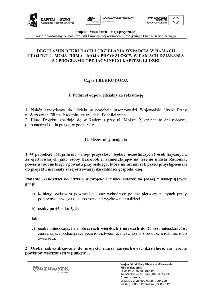 Projekt ,,Moja firma – moja przyszłość” współfinansowany ze środków Unii Europejskiej w ramach Europejskiego Funduszu Społecznego REGULAMIN REKRUTACJI I UDZIELANIA WSPARCIA W RAMACH PROJEKTU „MOJA FIRMA – MOJA PRZYSZŁOŚĆ”, W RAMACH DZIAŁANIA 6.2 PROGRAMU OPERACYJNEGO KAPITAŁ LUDZKI Część 1 REKRUTACJA I. Podmiot odpowiedzialny za rekrutację 1. Nabór kandydatów do udziału w projekcie przeprowadzi Wojewódzki Urząd Pracy w Warszawie Filia w Radomiu, zwany dalej Beneficjentem. 2. Biuro Projektu znajduje się w Radomiu przy ul. Mokrej 2, czynne w dni robocze, od poniedziałku do piątku, w godz. 8-16. II. Uczestnicy projektu 1. W projekcie „Moja firma – moja przyszłość” będzie uczestniczyć 36 osób fizycznych, zarejestrowanych jako osoby bezrobotne, zamieszkujące na terenie miasta Radomia, powiatu radomskiego i powiatu przysuskiego, które minimum rok przed przystąpieniem do projektu nie miały zarejestrowanej działalności gospodarczej. Ponadto, kandydaci do udziału w projekcie muszą należeć do jednej z następujących grup: a) kobiety, zwłaszcza powracające oraz wchodzące po raz pierwszy na rynek pracy po przerwie związanej z urodzeniem i wychowaniem dzieci, b) osoby po 45 roku życia, lub c) osoby mieszkające na obszarach wiejskich i miastach do 25 tys. mieszkańców, zamierzające podjąć pracę poza rolnictwem, tj. niezwiązaną z produkcją roślinną i/lub zwierzęcą. 2. Osoby zakwalifikowane do projektu muszą zarejestrować działalność na terenie powiatów wskazanych w punkcie 1. Wojewódzki Urząd Pracy w Warszawie Filia w Radomiu ul.Mokra 2, 26-600 Radom, Tel(48) 368 97 00, faks (48) 368 97 01 Biuro projektu: ul. Mokra 2, 26-600 Radom, pok 209 tel. (48) 368 97 12, faks (48) 368 97 12 Projekt ,, ,,Moja firma – moja przyszłość”” współfinansowany ze środków Unii Europejskiej w ramach Europejskiego Funduszu Społecznego III. Przebieg rekrutacji uczestników projektu „Moja firma – moja przyszłość” I etap – zgłoszenie o przystąpieniu do rekrutacji 1. Zgłoszenie o przystąpieniu do rekrutacji należy złożyć w siedzibie Wojewódzkiego Urzędu Pracy w Warszawie Filii w Radomiu, ul. Mokra 2, pok. 208, 209, I p., w terminie od 28 czerwca 2010 r. do 16 lipca 2010 r., w godz. 9-15. Zgłoszenie powinno zawierać: a) formularz rekrutacyjny (załącznik nr 1 do regulaminu rekrutacji), w którym znajduje się m.in.: • oświadczenie o spełnieniu jednego z kryteriów grupy docelowej (tj. kobieta, zwłaszcza powracająca oraz wchodząca po raz pierwszy na rynek pracy po przerwie związanej z urodzeniem i wychowaniem dzieci, osoba po 45 roku życia lub osoba zamieszkująca na terenach wiejskich i w miastach do 25 tys. mieszkańców), • oświadczenie o wyrażeniu zgody na przetwarzanie danych osobowych do celów realizacji projektu „Moja firma – moja przyszłość”, • oświadczenie, że działalność gospodarcza w ramach projektu zostanie zarejestrowana na terenie Radomia, powiatu radomskiego lub powiatu przysuskiego, • oświadczenie o nieposiadaniu zarejestrowanej działalności w okresie co najmniej 12 miesięcy przed przystąpieniem do projektu, • oświadczenie, że kandydat akceptuje Regulamin uczestnictwa w projekcie „Moja firma – moja przyszłość”, • oświadczenie, że wsparcie otrzymane w ramach projektu nie będzie przeznaczone na działalność gospodarczą wyłączoną z przepisów pomocy publicznej – pomocy de minimis, • oświadczenie o prawdziwości danych zawartych w formularzu rekrutacyjnym. oraz b) zaświadczenie z PUP o posiadaniu statusu osoby zarejestrowanej jako bezrobotna, Osoby zainteresowane powinny zgłosić się do Filii WUP w Radomiu z dokumentem ze zdjęciem potwierdzającym tożsamość. 2. Wpis na listę kandydatów chętnych do udziału w projekcie będzie poprzedzony weryfikacją formularza rekrutacyjnego przeprowadzoną przez pracowników Filii WUP w Radomiu, zgodnie z kartą oceny formularza rekrutacyjnego (załącznik nr 2 do regulaminu rekrutacji) Na tym etapie odbędzie się weryfikacja spełnienia przez kandydatów kryteriów formalnych, w tym grupy docelowej. 2 Projekt ,, ,,Moja firma – moja przyszłość”” współfinansowany ze środków Unii Europejskiej w ramach Europejskiego Funduszu Społecznego 3. Kandydat powinien wypełnić wszystkie pola formularza rekrutacyjnego, w przeciwnym razie nie zostanie dopuszczony do dalszego etapu rekrutacji. Formularz ze wszystkimi wypełnionymi polami zostanie także oceniony pod względem merytorycznym. Ocenie będzie podlegać krótki opis planowanej działalności oraz to, czy kandydat uruchomi działalność gospodarczą, jeżeli nie otrzyma wsparcia finansowego w ramach projektu. 4. Podczas oceny merytorycznej formularza rekrutacyjnego można otrzymać następującą liczbę punktów: a) 5 pkt – za krótki opis planowanej działalności, b) 5 pkt – jeśli kandydat nie uruchomi działalności gospodarczej bez wsparcia finansowego w ramach projektu, c) 0 pkt – jeśli kandydat uruchomi działalność gospodarczą bez wsparcia finansowego w ramach projektu. 5. W sumie w I etapie rekrutacji kandydat może otrzymać maksymalnie 10 pkt. 6. Wpis na listę kandydatów jest warunkiem dopuszczenia zainteresowanej osoby do II etapu rekrutacji. II etap – badania testowe 1. Badania testowe mają na celu weryfikację kompetencji przedsiębiorczych kandydatów. Testy zostaną ocenione przez zewnętrznych doradców zawodowych i psychologów. 2. Każdy uczestnik otrzyma zakodowany test, który należy wypełnić niebieskim atramentem (długopisem lub piórem). Na wypełnienie testu przewidziane jest 45 minut. 3. W II etapie kandydat może otrzymać maksymalnie 260 punktów. 4. W przypadku uzyskania równej liczby punktów przeprowadzone zostanie dodatkowe badanie testowe kompetencji przedsiębiorczych. O zakwalifikowaniu kandydata zdecyduje większa liczba punktów uzyskanych w tym badaniu. 5. W oparciu o lic