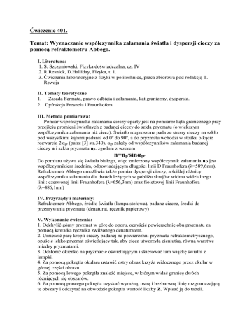Ćwiczenie 401. Temat: Wyznaczanie współczynnika załamania światła i dyspersji cieczy za pomocą refraktometru Abbego. I. Literatura: 1. S. Szczeniowski, Fizyka doświadczalna, cz. IV 2. R.Resnick, D.Halliday, Fizyka, t. 1. 3. Ćwiczenia laboratoryjne z fizyki w politechnice, praca zbiorowa pod redakcją T. Rewaja II. Tematy teoretyczne 1. Zasada Fermata, prawo odbicia i załamania, kąt graniczny, dyspersja. 2. Dyfrakcja Fresnela i Fraunhofera. III. Metoda pomiarowa: Pomiar współczynnika załamania cieczy oparty jest na pomiarze kąta granicznego przy przejściu promieni świetlnych z badanej cieczy do szkła pryzmatu (o większym współczynniku załamania niż ciecz). Światło rozproszone pada ze strony cieczy na szkło pod wszystkimi kątami padania od 0o do 90o, a do pryzmatu wchodzi w stożku o kącie rozwarcia 2.αgr (patrz [3] str.340). αgr zależy od współczynników załamania badanej cieczy n i szkła pryzmatu np. zgodnie z wzorem n=np.sinαgr Do pomiaru używa się światła białego, więc zmierzony współczynnik załamania nD jest współczynnikiem średnim, odpowiadającym długości linii D Fraunhofera (λ=589,6nm). Refraktometr Abbego umożliwia także pomiar dyspersji cieczy, a ściślej różnicy współczynnika załamania dla dwóch leżących w pobliżu skrajów widma widzialnego linii: czerwonej linii Fraunhofera (λ=656,3nm) oraz fioletowej linii Fraunhofera (λ=486,1nm) IV. Przyrządy i materiały: Refraktometr Abbego, źródło światła (lampa stołowa), badane ciecze, środki do przemywania pryzmatu (denaturat, ręcznik papierowy) V. Wykonanie ćwiczenia: 1. Odchylić górny pryzmat w górę do oporu, oczyścić powierzchnię obu pryzmatu za pomocą kawałka ręcznika zwilżonego denaturatem. 2. Umieścić parę kropli cieczy badanej na powierzchni pryzmatu refraktometrycznego, opuścić lekko pryzmat oświetlający tak, aby ciecz utworzyła cieniutką, równą warstwę miedzy pryzmatami. 3. Odsłonić okienko na pryzmacie oświetlającym i skierować tam wiązkę światła z lampki. 4. Za pomocą pokrętła okularu ustawić ostry obraz krzyża widocznego przez okular w górnej części obrazu. 5. Za pomocą lewego pokrętła znaleźć miejsce, w którym widać granicę dwóch różniących się obszarów. 6. Za pomocą prawego pokrętła uzyskać wyraźną, ostrą i bezbarwną linię rozgraniczającą te obszary i odczytać na obwodzie pokrętła wartość liczby Z. Wpisać ją do tabeli. 7. Za pomocą lewego pokrętła ustawić linię rozgraniczającą widoczne obszary dokładnie na przecięciu widocznych w okularze linii. 8. Za pomocą lusterka znajdującego się obok lewego pokrętła oświetlić widoczną przez okular zieloną skalę tak, aby były widoczne wyraźnie podziałki skali. 9. Z górnej części skali odczytać wartość współczynnika załamania cieczy z dokładnością do 0,0005 i wpisać ją do tabeli. 10. Jeszcze dwukrotnie powtórzyć dla tej cieczy pomiary opisane w punktach 6-7-9 (nie wymieniając cieczy). 11. Opisane wyżej czynności powtórzyć dla pozostałych cieczy badanych, pamiętając, aby za każdym razem dokładnie oczyścić obie powierzchnie pryzmatów. 12. Wyniki umieścić w tabeli 1: Tabela1 Nr cieczy POMIAR nD 1 2 POMIAR Z u( nD ) nD 3 1 2 Z u( Z 3 1 2 3 4 5 ua( nD ) oraz ua( Z ) obliczyć jako odchylenia standardowe od wartości średniej. 3 u a (n D ) 2 nD ni i 1 3 2 (n D ) u (n D ) u (n D ) 3 2 2 a Z Z 3 u a (Z ) 2 i i 1 3 2 2 ( Z ) u(Z ) u (Z ) 3 2 a W tej instrukcji użyłem oznaczeń: ua - niepewność typu A, (n D ), ( Z ) - niepewności maksymalne typu B, u (bez indeksu)niepewność całkowita W dalszej części dla uproszczenia zapisu oznaczyłem nD jako n (czyli n ≡ nD ), Z jako Z (czyli Z≡ Z ) oraz Δn=nF-nc. 13.Aby wyznaczyć dyspersję Δn i jej niepewność u(Δn) uzupełnij tabelę 2. Skorzystaj z następujących wzorów: 0,16 Z 3 16,60 Z 2 17,20 Z 9981,10 10 4 2 ( Z ) u ( ) 0,48 Z 33,20 Z 17,20 10 u ( Z ) 3 2 4 2 a A 0,112 n 4 0,638 n 3 1,367 n 2 1,312 n 0,501 gdzie ( Z ) 0,5 ) u ( A) 0,448 n 3 1,914 n 2 2,734 n 1,312 u a2 (n) 2 (n) 3 gdzie (n) 0,0005 B 0,1583 n 3 0,6008 n 2 0,7788 n 0,3778 u ( B) 0,4749 n 2 1,2016 n 0,7788 u a2 (n) n A B 2 (n) 3 gdzie (n) 0,0005 u (n) u 2 ( A) 2 u 2 ( B) B 2 u 2 ( ) Tabela2 Nr cieczy 1 2 3 4 5 u() A u(A) B u(B) Δn u(Δn) 14. Wyjaśnij jakich informacji dostarcza znajomość współczynnika dyspersji n (*). 15. Wśród badanych cieczy znajdują się woda i alkohol etylowy (denaturat) i gliceryna. Porównaj uzyskane dla tych cieczy wyniki z danymi tablicowymi (Tab. XXV, Lit.[3], str. 504) i określ, które ciecze są tymi wymienionymi. Uwaga: Na stanowisku znajduje się rysunek widma Fraunhofera. Proszę zapoznać się z nim, zwracając szczególnie uwagę na linie C, D i F (zapisać ich długości fal i barwę). (*)