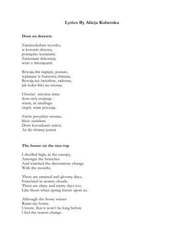 Lyrics By Alicja Kuberska Dom na drzewie Zamieszkałam wysoko, w koronie drzewa, pomiędzy konarami. Zmieniam dekoracje wraz z miesiącami. Bywają dni napięte, ponure, wplątane w burzową chmurę. Bywają też świetliste, radosne, jak kolor liści na wiosnę. Chociaż mroźna zima dom mój zrujnuje wiem, że niedługo ciepły wiatr poczuję. Znów przyjdzie wiosna, liście zazieleni. Dom koronkami ustroi, Aż do słotnej jesieni The house on the tree-top I dwelled high, in the canopy, Amongst the branches And watched the decorations change With the months. There are strained and gloomy days, Entwined in stormy clouds. There are shiny and merry days too, Like those when spring bursts upon us. Although the frosty winter Ruins my home. I know, that it won’t be long before l feel the season change. The spring will come again And paint my home in green. It will trim it with interlaced branches And leaves until the rainy autumn