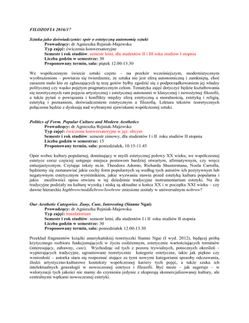 FILOZOFIA 2016/17 Sztuka jako doświadczenie: spór o estetyczną autonomię sztuki Prowadzący: dr Agnieszka Rejniak-Majewska Typ zajęć: ćwiczenia konwersatoryjne Semestr i rok studiów: semestr letni, dla studentów II i III roku studiów I stopnia Liczba godzin w semestrze: 30 Proponowany termin, sala: piątek 12.00-13.30 We współczesnym świecie sztuki często – na przekór wcześniejszym, modernistycznym wyobrażeniom – powtarza się twierdzenie, że sztuka nie jest sferą autonomiczną i zamkniętą, choć zarazem mało kto ze zgłaszających tę tezę gotów byłby zgodzić się z podporządkowaniem jej władzy politycznej czy wąsko pojętym pragmatycznym celom. Tematyka zajęć dotyczyć będzie kształtowania się teoretycznych ram pojęcia artystycznej i estetycznej autonomii w klasycznej i nowożytnej filozofii, a także pytań o powiązania i konflikty między sferą estetyczną a moralnością, estetyką i religią, estetyką i poznaniem, doświadczeniem estetycznym a filozofią. Lektura tekstów teoretycznych połączona będzie z dyskusją nad wybranymi zjawiskami współczesnej sztuki. Politics of Form. Popular Culture and Modern Aesthetics Prowadzący: dr Agnieszka Rejniak-Majewska Typ zajęć: ćwiczenia konwersatoryjne w jęz. obcym Semestr i rok studiów: semestr zimowy, dla studentów I i II roku studiów II stopnia Liczba godzin w semestrze: 15 Proponowany termin, sala: poniedziałek, 10.15-11.45 Opór wobec kultury popularnej, dominujący w myśli estetycznej połowy XX wieku, we współczesnej estetyce coraz częściej ustępuje miejsca postawom bardziej otwartym, afirmatywnym, czy wręcz entuzjastycznym. Czytając teksty m.in. Theodora Adorno, Richarda Shustermana, Noela Carrolla, będziemy się zastanawiać jakie cechy form popularnych są według tych autorów ich pozytywnym lub negatywnym estetycznym wyróżnikiem, jakie wyzwania stawia przed estetyką kultura popularna i jakie możliwości opisu otwiera w tej dziedzinie tradycyjne instrumentarium estetyki. Na ile tradycyjne podziały na kulturę wysoką i niską są aktualne u końca XX i w początku XXI wieku – czy dawne hierarchie highbrow/middlebrow/lowbrow zniesione zostały w uniwersalnym nobrow? Our Aesthetic Categories. Zany, Cute, Interesting (Sianne Ngai) Prowadzący: dr Agnieszka Rejniak-Majewska Typ zajęć: translatorium Semestr i rok studiów: semestr letni, dla studentów I i II roku studiów II stopnia Liczba godzin w semestrze: 30 Proponowany termin, sala: poniedziałek 12.00-13.30 Przekład fragmentów książki amerykańskiej teoretyczki Sianne Ngai (I wyd. 2012), będącej próbą krytycznego rozbioru funkcjonujących w życiu codziennym, estetycznie wartościujących terminów (interesujący, zabawny, cute). Wychodząc od tych z pozoru trywialnych, potocznych określeń – wypierających tradycyjne, ugruntowane teoretycznie kategorie estetyczne, takie jak piękno czy wzniosłość – autorka stara się rozpoznać stojące za tymi nowymi kategoriami sposoby odczuwania, śledzi artystyczno-kulturowe konteksty współczesnej kariery tych pojęć, a także szuka ich intelektualnych genealogii w nowoczesnej estetyce i filozofii. Być może – jak sugeruje – w waloryzacji tych jakości nie mamy do czynienia jedynie z ekspresją skomercjalizowanej kultury, ale centralnymi wątkami nowoczesnej estetyki.