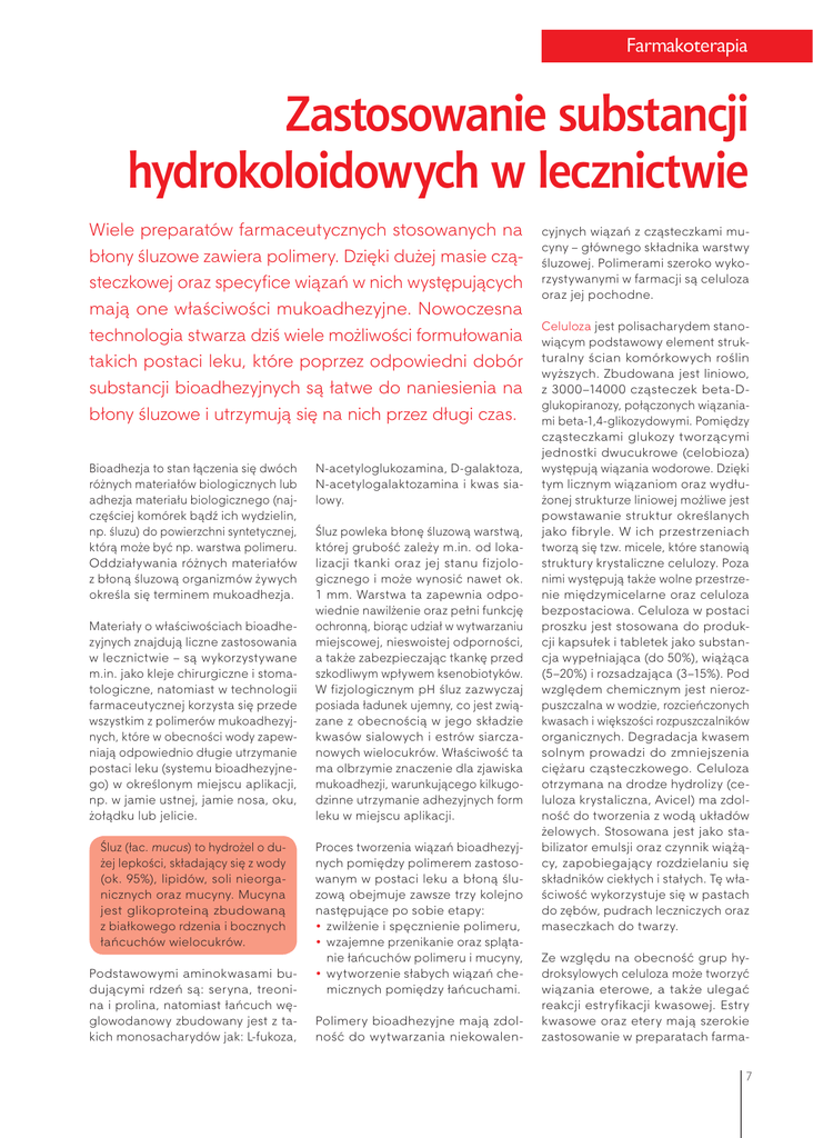 Farmakoterapia Zastosowanie substancji hydrokoloidowych w lecznictwie Wiele preparatów farmaceutycznych stosowanych na błony śluzowe zawiera polimery. Dzięki dużej masie cząsteczkowej oraz specyfice wiązań w nich występujących mają one właściwości mukoadhezyjne. Nowoczesna technologia stwarza dziś wiele możliwości formułowania takich postaci leku, które poprzez odpowiedni dobór substancji bioadhezyjnych są łatwe do naniesienia na błony śluzowe i utrzymują się na nich przez długi czas. Bioadhezja to stan łączenia się dwóch różnych materiałów biologicznych lub adhezja materiału biologicznego (najczęściej komórek bądź ich wydzielin, np. śluzu) do powierzchni syntetycznej, którą może być np. warstwa polimeru. Oddziaływania różnych materiałów z błoną śluzową organizmów żywych określa się terminem mukoadhezja. Materiały o właściwościach bioadhezyjnych znajdują liczne zastosowania w lecznictwie – są wykorzystywane m.in. jako kleje chirurgiczne i stomatologiczne, natomiast w technologii farmaceutycznej korzysta się przede wszystkim z polimerów mukoadhezyjnych, które w obecności wody zapewniają odpowiednio długie utrzymanie postaci leku (systemu bioadhezyjnego) w określonym miejscu aplikacji, np. w jamie ustnej, jamie nosa, oku, żołądku lub jelicie. Śluz (łac. mucus) to hydrożel o dużej lepkości, składający się z wody (ok. 95%), lipidów, soli nieorganicznych oraz mucyny. Mucyna jest glikoproteiną zbudowaną z białkowego rdzenia i bocznych łańcuchów wielocukrów. Podstawowymi aminokwasami budującymi rdzeń są: seryna, treonina i prolina, natomiast łańcuch węglowodanowy zbudowany jest z takich monosacharydów jak: L-fukoza, N-acetyloglukozamina, D-galaktoza, N-acetylogalaktozamina i kwas sialowy. Śluz powleka błonę śluzową warstwą, której grubość zależy m.in. od lokalizacji tkanki oraz jej stanu fizjologicznego i może wynosić nawet ok. 1 mm. Warstwa ta zapewnia odpowiednie nawilżenie oraz pełni funkcję ochronną, biorąc udział w wytwarzaniu miejscowej, nieswoistej odporności, a także zabezpieczając tkankę przed szkodliwym wpływem ksenobiotyków. W fizjologicznym pH śluz zazwyczaj posiada ładunek ujemny, co jest związane z obecnością w jego składzie kwasów sialowych i estrów siarczanowych wielocukrów. Właściwość ta ma olbrzymie znaczenie dla zjawiska mukoadhezji, warunkującego kilkugodzinne utrzymanie adhezyjnych form leku w miejscu aplikacji. Proces tworzenia wiązań bioadhezyjnych pomiędzy polimerem zastosowanym w postaci leku a błoną śluzową obejmuje zawsze trzy kolejno następujące po sobie etapy: • zwilżenie i spęcznienie polimeru, • wzajemne przenikanie oraz splątanie łańcuchów polimeru i mucyny, • wytworzenie słabych wiązań chemicznych pomiędzy łańcuchami. Polimery bioadhezyjne mają zdolność do wytwarzania niekowalen- cyjnych wiązań z cząsteczkami mucyny – głównego składnika warstwy śluzowej. Polimerami szeroko wykorzystywanymi w farmacji są celuloza oraz jej pochodne. Celuloza jest polisacharydem stanowiącym podstawowy element strukturalny ścian komórkowych roślin wyższych. Zbudowana jest liniowo, z 3000 –14000 cząsteczek beta-Dglukopiranozy, połączonych wiązaniami beta-1,4-glikozydowymi. Pomiędzy cząsteczkami glukozy tworzącymi jednostki dwucukrowe (celobioza) występują wiązania wodorowe. Dzięki tym licznym wiązaniom oraz wydłużonej strukturze liniowej możliwe jest powstawanie struktur określanych jako fibryle. W ich przestrzeniach tworzą się tzw. micele, które stanowią struktury krystaliczne celulozy. Poza nimi występują także wolne przestrzenie międzymicelarne oraz celuloza bezpostaciowa. Celuloza w postaci proszku jest stosowana do produkcji kapsułek i tabletek jako substancja wypełniająca (do 50%), wiążąca (5–20%) i rozsadzająca (3–15%). Pod względem chemicznym jest nierozpuszczalna w wodzie, rozcieńczonych kwasach i większości rozpuszczalników organicznych. Degradacja kwasem solnym prowadzi do zmniejszenia ciężaru cząsteczkowego. Celuloza otrzymana na drodze hydrolizy (celuloza krystaliczna, Avicel) ma zdolność do tworzenia z wodą układów żelowych. Stosowana jest jako stabilizator emulsji oraz czynnik wiążący, zapobiegający rozdzielaniu się składników ciekłych i stałych. Tę właściwość wykorzystuje się w pastach do zębów, pudrach leczniczych oraz maseczkach do twarzy. Ze względu na obecność grup hydroksylowych celuloza może tworzyć wiązania eterowe, a także ulegać reakcji estryfikacji kwasowej. Estry kwasowe oraz etery mają szerokie zastosowanie w preparatach farma7 Farmakoterapia Pierwszy krok w prewencji alergicznego nieżytu nosa1 Zacznij terapię alergii u swojego pacjenta od StopAL ceutycznych. Spośród pochodnych celulozy o właściwościach błonotwórczych zazwyczaj stosuje się azotany, octany, octanoftalany, bursztyniany, maślany oraz propioniany. Bardzo często stosowane są również: karboksymetyloceluloza (CMC), hydro ksyetyloceluloza (HEC), metyloceluloza (MC) i etyloceluloza (EC). Jedną z pochodnych celulozy najpowszechniej wykorzystywaną w przemyśle farmaceutycznym jest hydroksypropylometyloceluloza (HPMC, Methocel, Metolose) – hypromeloza. HPMC to polimer hydrofilowy zawierający nie mniej niż 19%, a nie więcej niż 30% grup metok sylowych, natomiast nie mniej niż 4% i nie więcej niż 12% grup hydroksypropylowych w przeliczeniu na suchą substancję. W przemyśle farmaceutycznym hypromeloza występuje w kilku rodzajach. Różnią się one podstawnikami oraz lepkością 2-procentrowych roztworów w temperaturze 20°C. HPMC wykorzystywana jest jako substancja wypełniająca w procesie produkcji tabletek i kapsułek o przedłużonym działaniu. W stężeniu 2–5% stosowana jest jako substancja wiążąca, a w stężeniu 2–10% jako substancja błonotwórcza podczas procesu powlekania. Hypromeloza, ze względu na