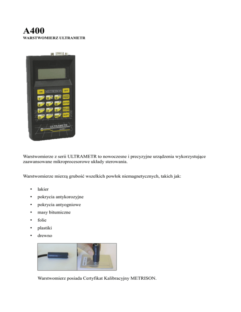 A400 WARSTWOMIERZ ULTRAMETR Warstwomierze z serii ULTRAMETR to nowoczesne i precyzyjne urządzenia wykorzystujące zaawansowane mikroprocesorowe układy sterowania. Warstwomierze mierzą grubość wszelkich powłok niemagnetycznych, takich jak: • lakier • pokrycia antykorozyjne • pokrycia antyogniowe • masy bitumiczne • folie • plastiki • drewno Warstwomierz posiada Certyfikat Kalibracyjny METRISON. Warstwomierz ULTRAMETR A400 to: zaawansowana cyfrowa technologia natychmiastowy odczyt pomiaru bardzo dokładny pomiar grubości powłok w zakresie od 0 do 1999 µm odczyt pomiaru w µm lub milsach automatyczna kompensacja sondy w funkcji temperatury automatyczna kompensacja sondy w funkcji zużywania się części roboczej pomiar w pełnym zakresie pracy warstwomierza (od 0 do 1999 µm) przy wykorzystaniu tylko jednej sondy, niezależnie od rodzaju mierzonej niemagnetycznej warstwy na podłożach płaskich jak i wypukłych kalibracja dwu lub trójpunktowa wykonywana przez użytkownika na dowolnego rodzaju powłoce niemagnetycznej na podłożu magnetycznym współpraca z komputerem bez konieczności stosowania dodatkowego oprogramowania pamięć i statystyka 2000 pomiarów z możliwością oznaczenia datą ładowanie akumulatorów bez konieczności wyjmowania ich z przyrządu możliwość pracy w terenie i laboratorium (zasilanie bateryjne i sieć) małe gabaryty i waga WARSTWOMIERZE znajdują zastosowanie w przemyśle i usługach. Doskonale sprawdzają się przy pomiarach grubości powłok zabezpieczających: stalowe konstrukcje budowlane konstrukcje przemysłowe zbiorniki i cysterny rury kotły kadłuby statków karoserie samochodów Dane Techniczne: Konstrukcja przystosowana do pomiarów w terenie Rodzaj podłoża magnetyczne Rodzaj powłoki niemagnetyczna Zakresy pomiarowe I - od 0 do 1999 µm II - od 0 do 99,9 mils Dokładność pomiaru - dla przedziału od 0 do 1999 µm - dla przedziału od 0 do 19,99 mils - dla przedziału od 20 do 99,9 mils ± 3%, ± 1µm ± 3%, ± 0,02 mils ± 3%, ± 0,1 mils Minimalne wymiary przedmiotów mierzonych - powierzchnie płaskie nie mniejsze niż powierzchnia czujnika - minimalna grubość podłoża - wałki ø 5 x 20 mm - wałki ø 10 x 20 mm 0,5 mm pomiar grubości do 20 µm pomiar grubości do 200 µm Kalibracja dwupunktowa lub trójpunktowa na wzorcach dodatkowych Pojemność pamięci - 1999 pomiarów - możliwość zakładania banków danych - możliwość oznaczania pomiarów datą - statystyka pomiarów (grubość minimalna, maksymalna i średnia) Współpraca z urządzeniami zewnętrznymi współpraca z komputerem przez interfejs szeregowy RS232C Zakres temperatur pracy od - 10 º C do 40 º C Czas pracy ciągłej (zasilanie z akumulatora) Zasilanie ok. 10 h 2 akumulatory 1,2 V Wymiary zewnętrzne 150 x 80 x 30 mm Masa 0,3 kg Akcesoria Dodatkowe wyposażenie ułatwiające pracę z przyrządami METRISON to najwyższa jakość i użyteczność. Walizka transportowa dla grubościomierzy SONO i mierników grubości powłok ULTRAMETR, zapewnia bezpieczny transport i przechowywanie. Futerały do pracy w terenie dla grubościomierzy SONO i mierników grubości powłok ULTRAMETR. Przenoszenie aparatu w futerale pozwala operatorowi na swobodę działania, oraz bezpieczną pracę na wysokościach, lub w innych miejscach wymagających zachowania szczególnej ostrożności. W każdym futerale znajduje się miejsce na kompletne wyposażenie przyrządu, tj, głowicę i zasilacz - ładowarkę.