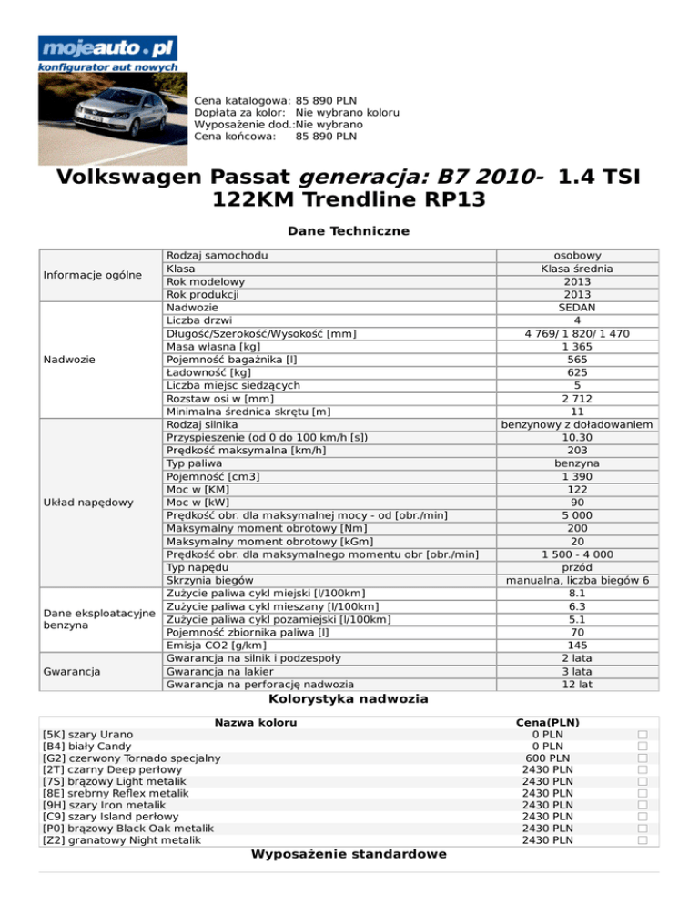 Cena katalogowa: 85 890 PLN Dopłata za kolor: Nie wybrano koloru Wyposażenie dod.:Nie wybrano Cena końcowa: 85 890 PLN Volkswagen Passat generacja: B7 2010- 1.4 TSI 122KM Trendline RP13 Dane Techniczne Informacje ogólne Nadwozie Układ napędowy Dane eksploatacyjne benzyna Gwarancja Rodzaj samochodu Klasa Rok modelowy Rok produkcji Nadwozie Liczba drzwi Długość/Szerokość/Wysokość [mm] Masa własna [kg] Pojemność bagażnika [l] Ładowność [kg] Liczba miejsc siedzących Rozstaw osi w [mm] Minimalna średnica skrętu [m] Rodzaj silnika Przyspieszenie (od 0 do 100 km/h [s]) Prędkość maksymalna [km/h] Typ paliwa Pojemność [cm3] Moc w [KM] Moc w [kW] Prędkość obr. dla maksymalnej mocy - od [obr./min] Maksymalny moment obrotowy [Nm] Maksymalny moment obrotowy [kGm] Prędkość obr. dla maksymalnego momentu obr [obr./min] Typ napędu Skrzynia biegów Zużycie paliwa cykl miejski [l/100km] Zużycie paliwa cykl mieszany [l/100km] Zużycie paliwa cykl pozamiejski [l/100km] Pojemność zbiornika paliwa [l] Emisja CO2 [g/km] Gwarancja na silnik i podzespoły Gwarancja na lakier Gwarancja na perforację nadwozia osobowy Klasa średnia 2013 2013 SEDAN 4 4 769/ 1 820/ 1 470 1 365 565 625 5 2 712 11 benzynowy z doładowaniem 10.30 203 benzyna 1 390 122 90 5 000 200 20 1 500 - 4 000 przód manualna, liczba biegów 6 8.1 6.3 5.1 70 145 2 lata 3 lata 12 lat Kolorystyka nadwozia Nazwa koloru [5K] szary Urano [B4] biały Candy [G2] czerwony Tornado specjalny [2T] czarny Deep perłowy [7S] brązowy Light metalik [8E] srebrny Reflex metalik [9H] szary Iron metalik [C9] szary Island perłowy [P0] brązowy Black Oak metalik [Z2] granatowy Night metalik Wyposażenie standardowe Cena(PLN) 0 PLN 0 PLN 600 PLN 2430 PLN 2430 PLN 2430 PLN 2430 PLN 2430 PLN 2430 PLN 2430 PLN Nazwa elementu ABS asystent siły hamowania i stabilizacja toru jazdy przyczepy centralny zamek zdalnie sterowany chromowane listwy na osłonie wlotu powietrza do chłodnicy deaktywacja poduszki powietrznej pasażera EDS - elektroniczna blokada mechanizmu różnicowego elektromechaniczny hamulec postojowy z funkcją Auto - Hold ESP + ASR fotele przednie z regulacją wysokości gniazdo Aux-In hamulce tarczowe z przodu i z tyłu (przód tarcze wentylowane) immobilizer klimatyzacja Climatronic, regulowana automatycznie, 2-strefowa komputer pokładowy MFA Plus kontrolka niskiego stanu płynu do spryskiwaczy lusterka boczne regulowane elektrycznie, podgrzewane, lewe lusterko asferyczne MSR obręcze stalowe 6.5Jx16 z kołpakami oparcie tylnej kanapy odblokowywane z bagażnika opony 205/55 R16 pełnowymiarowe koło zapasowe podłokietnik z przodu regulowany wzdłużnie i na wysokość, ze schowkiem poduszki powietrzne czołowe, boczne, kurtynowe radio RCD 310 z 8 głośnikami, 4x20W, funkcja odczytu MP3 szyby sterowane elektrycznie z przodu i z tyłu światła do jazdy dziennej tapicerka siedzeń "Conte" wspomaganie układu kierowniczego, elektromechaniczne, progresywne - zależne od prędkości samochodu zderzaki, obudowy lusterek i klamki lakierowane w kolorze nadwozia Wyposażenie dodatkowe Lista wyposażenia dodatkowego [0NA] brak oznaczenia modelu i silnika na klapie bagażnika [0NB] brak oznaczenia silnika na klapie bagażnika [0TD] dywaniki materiałowe z przodu i z tyłu [1G3/1S1] pełnowymiarowe koło zapasowe ze stopu metali lekkich dla obręczy 7,5J x 17 [1G3/1S1] pełnowymiarowe koło zapasowe ze stopu metali lekkich dla obręczy 7J x 16 [1M6] hak holowniczy składany, elektrycznie odblokowywany [3Y2] roleta przeciwsłoneczna tylnej szyby ustawiana elektrycznie [3Y5] roleta przeciwsłoneczna tylnej szyby ustawiana elektrycznie, rolety boczne z tyłu ustawiane manualnie [3Y5] roleta przeciwsłoneczna tylnej szyby ustawiana elektrycznie, rolety boczne z tyłu ustawiane manualnie; w połączeniu z Pakietem 990 [4F2] system bezkluczykowego dostępu i uruchamiania pojazdu Keyless Access [4GW] przednia szyba podgrzewana bezprzewodowo i odbijająca promienie podczerwone; niedostępne z [9ZB]; w połączeniu z Pakietem 990 tylko z [9ZA] lub [9ZT] lub [9ZZ]; tylko z [WFA] i [PW1] [4GX] przednia szyba podgrzewana; tylko z [PW1] lub [PW2] lub [WL1] lub [WL2] lub [WS2] [4GY] przednia szyba odbijająca promienie podczerwone; tylko z [WFA] [4KF] dodatkowo przyciemniane szyby 35% od drugiego rzędu siedzeń wraz z szybą tylną [6SJ] mata ochronna do bagażnika, dwustronna [6XW] Pakiet lusterka (lusterka zewnętrzne elektrycznie składane, po stronie kierowcy automatycznie przyciemniane, oświetlenie przestrzeni podczas wsiadania i wysiadania z samochodu); tylko z [WFA] [7A2] zmieniarka na 6 płyt CD-Audio w schowku po stronie pasażera; nie odtwarza plików MP3; dostępne tylko z [PNB] lub [R2Z]; niedostępne z [UF6] lub [UF8] [7K3] system kontroli ciśnienia w oponach; tylko z felgami ze stopu metali lekkich [7K6] sygnalizacja spadku ciśnienia w oponach [7X2] czujniki parkowania z przodu i z tyłu z wizualizacją na ekranie radia [7X5] system wspomagający parkowanie \"Park Assist\"; zawiera [7X2] [7X5] system wspomagający parkowanie \"Park Assist\"; zawiera [7X2]; tylko z Pakietem 990 [7Y1] asystent zmiany pasa ruchu Side Assist; tylko z [WFA]; niedostępne z [4GX], [4GY] [8G1] automatyczne światła drogowe "Light Assist"; tylko z [WFA]; niedostępne z [WXF] [8T2/EM1] tempomat z sygnalizatorem zmęczenia kierowcy [8WH] reflektory przeciwmgielne z funkcją statycznego doświetlenia zakrętów z chromowanym obramowaniem [9JG] Pakiet dla palących (popielniczka i zapalniczka z przodu) [9VQ] system dźwięku - Volkswagen Sound (8 kanałowy wzmacniacz cyfrowy, 10 głośników, całkowita moc muzyczna 300W) [9ZA] instalacja telefonu Plus (bezprzewodowe połączenie Bluetooth [połączenie poprzez Cena 0 PLN 0 PLN 450 PLN 580 PLN 480 PLN 3690 PLN 1270 PLN 1790 PLN 520 PLN 2440 PLN 1350 PLN 840 PLN 870 PLN 1550 PLN 230 PLN 770 PLN 1710 PLN 990 PLN 350 PLN 2030 PLN 3000 PLN 970 PLN 2000 PLN 560 PLN 1490 PLN 680 PLN 100 PLN 1840 PLN profil 