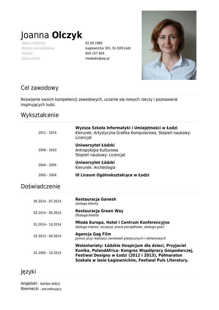 Joanna Olczyk Data urodzenia: 02.09.1985 Miejsce zamieszkania: Łagiewnicka 301, 91-509 Łódź Telefon: 604 157 604 Adres email: [email protected] Cel zawodowy Rozwijanie swoich kompetencji zawodowych, uczenie się nowych rzeczy i poznawanie inspirujących ludzi. Wykształcenie 2011 - 2014 Wyższa Szkoła Informatyki i Umiejętności w Łodzi Kierunek: Artystyczna Grafika Komputerowa, Stopień naukowy: Licencjat 2006 - 2010 Uniwersytet Łódzki Antropologia Kulturowa Stopień naukowy: Licencjat 2004 - 2005 Uniwersytet Łódzki Kierunek: Archeologia 2000 - 2004 III Liceum Ogólnokształcące w Łodzi Doświadczenie 05.2014 - 07.2014 Restauracja Ganesh 02.2014 - 05.2014 Restauracja Green Way 01.2014 - 10.2014 Młoda Europa, Hotel i Centrum Konferencyjne 02.2013 - 04.2014 Agencja Gag Film 01.2005 - 10.2014 Języki Angielski - bardzo dobry Niemiecki - poczatkujący obsługa klienta Obsługa klienta obsługa imprez: recepcja, prace porządkowe, obsługa gości pomoc przy realizacji zamówień plastycznych i reklamowych Wolontariaty: Łódzkie Hospicjum dla dzieci, Przyjaciel Konika, PolandAfrica- Kongres Współpracy Gospodarczej, Festiwal Designu w Łodzi (2012 i 2013), Półmaraton Szakala w lesie Łagiewnickim, Festiwal Puls Literatury. Certyfikaty i szkolenia Sanepidowska książeczka zdrowia Umiejętności Obsługa programów graficznych: Photoshop, Corel, Ilustrator, Indesign, 3Ds Max, World, Excel dobry Umiejętności interpersonalne, szybkie uczenie się i dostosowywanie do nowych warunków, wysoka etyka pracy. Zainteresowania Rozwój osobisty, sport, zdrowe żywienie, kultura, podróże, zwierzęta. Wyrażam zgodę na przetwarzanie moich danych osobowych dla potrzeb niezbędnych do realizacji procesu rekrutacji zgodnie z Ustawą z dn. 29.08.97 roku o Ochronie Danych Osobowych Dz. Ust. nr 133 poz.883.