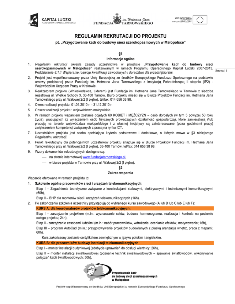 REGULAMIN REKRUTACJI DO PROJEKTU pt. „Przygotowanie kadr do budowy sieci szerokopasmowych w Małopolsce” 1. 2. 3. 4. 5. 6. 7. 8. 9. §1 Informacje ogólne Regulamin rekrutacji określa zasady uczestnictwa w projekcie „Przygotowanie kadr do budowy sieci szerokopasmowych w Małopolsce” realizowanym w ramach Programu Operacyjnego Kapitał Ludzki 2007-2013, Strona | 1 Poddziałanie 8.1.1 Wspieranie rozwoju kwalifikacji zawodowych i doradztwo dla przedsiębiorstw. Projekt jest współfinansowany przez Unię Europejską ze środków Europejskiego Funduszu Społecznego na podstawie umowy podpisanej przez Fundację im. Hetmana Jana Tarnowskiego z Instytucją Pośredniczącą II stopnia (IP2) Wojewódzkim Urzędem Pracy w Krakowie. Realizatorem projektu (Wnioskodawcą, Liderem) jest Fundacja im. Hetmana Jana Tarnowskiego w Tarnowie z siedzibą rejestrową ul. Wielkie Schody 3, 33-100 Tarnów. Biuro projektu mieści się w Biurze Projektów Fundacji im. Hetmana Jana Tarnowskiego przy ul. Wałowej 2/2 (I piętro), tel/fax: 014 656 38 98. Okres realizacji projektu: 01.01.2010 r. - 31.12.2010 r. Obszar realizacji projektu: województwo małopolskie. W ramach projektu wsparciem zostanie objętych 60 KOBIET i MĘŻCZYZN – osób dorosłych (w tym 5 powyżej 50 roku życia), pracujących (z wyłączeniem osób fizycznych prowadzących działalność gospodarczą), które zamieszkują i/lub pracują na terenie województwa małopolskiego i z własnej inicjatywy są zainteresowane (poza godzinami pracy) zwiększeniem kompetencji związanych z pracą na rynku ICT. Uczestnikiem projektu jest osoba spełniająca kryteria podstawowe i dodatkowe, o których mowa w §3 niniejszego Regulaminu rekrutacji. Punkt rekrutacyjny dla potencjalnych uczestników projektu znajduje się w Biurze Projektów Fundacji im. Hetmana Jana Tarnowskiego przy ul. Wałowej 2/2 (I piętro), 33-100 Tarnów, tel/fax: 014 656 38 98. Wzory dokumentów rekrutacyjnych dostępne są: na stronie internetowej www.fundacjatarnowskiego.pl, w biurze projektu w Tarnowie przy ul. Wałowej 2/2 (I piętro), §2 Zakres wsparcia Wsparcie oferowane w ramach projektu to: 1. Szkolenie ogólne pracowników sieci i urządzeń telekomunikacyjnych: Etap I – Zagadnienia teoretyczne związane z konstrukcjami stalowymi, elektrycznymi i technicznymi komunikacyjnymi (60h), Etap II – BHP dla monterów sieci i urządzeń telekomunikacyjnych (16h). 2. Po zakończeniu szkolenia uczestnicy przystępują do wybranego kursu zawodowego (A lub B lub C lub E lub F): KURS A: dla koordynatorów projektów telekomunikacyjnych: Etap I – zarządzanie projektem (m.in.: wyznaczanie celów, budowa harmonogramu, realizacja i kontrola na poziomie całego projektu; 24h), Etap II - zarządzanie zasobami ludzkimi (m.in.: nabór pracowników, wdrożenie, ocenianie efektów, motywowanie; 16h), Etap III – program AutoCad (m.in.: przygotowywanie projektów budowlanych z płaską aranżacją wnętrz, praca z mapami; 60h). Kurs zakończony zostanie certyfikatem zewnętrznym w języku polskim i angielskim. KURS B: dla pracowników budowy instalacji telekomunikacyjnych: Etap I – monter instalacji budynkowej (zdobycie uprawnień do obsługi wiertnicy; 26h), Etap II – monter instalacji światłowodowej (poznanie technik światłowodowych – spawanie światłowodów, wykonywanie połączeń kabli światłowodowych; 50h), Etap III – monter instalacji elektrycznej (zdobycie uprawnień energetycznych podstawowych; 38h). Kurs zakończony zostanie egzaminem państwowym SEP (Stowarzyszenie Energetyków Polskich). KURS C: dla pracowników budowy sieci telekomunikacyjnych ziemnych: Etap I – uprawnienia do obsługi koparki klasa III 0,8m3 (poznanie regulacji prawnych dotyczących korzystania z urządzeń do robót ziemnych, typów, budowy, zasad obsługi koparek, kontroli sprawności urządzeń; 176h), Etap II – uprawnienia do obsługi wiertnicy (poznanie regulacji prawnych dotyczących korzystania z urządzeń do robót ziemnych, typów, budowy, zasad obsługi wiertnic, kontroli sprawności urządzeń; 152h). Kurs zakończony zostanie egzaminem w Instytucie Mechanizacji Budownictwa i Górnictwa Skalnego. Strona | 2 KURS E: dla pracowników budowy sieci telekomunikacyjnych napowietrznych: Etap I – uprawnienia do obsługi podestów ruchomych (poznanie regulacji prawnych dotyczących korzystania z podestów ruchomych, ich typów i budowy, zakresu zastosowania, czynności operatora, kontroli sprawności urządzeń; 60h), Etap II – uprawnienia do pracy na wysokościach poziom II (poznanie technik zjazdowych, ratownictwo i autoratownictwo z systemami stałej asekuracji typu FABA lub SOLL; 18h). Kurs zakończony zostanie uzyskaniem uprawnień zewnętrznych. KURS F: dla pracowników implementacji radiowego sprzętu telekomunikacyjnego typu FLEXI: Etap I – szkolenie „Podstawy telekomunikacji ruchomej” (6h), Etap II – szkolenie „Podstawy GSM/EDGE” (6h), Etap III - szkolenie „Podstawy UMTS-3G” (6h), Etap IV – szkolenie „Podstawy łączności mikrofalowej – MW” (6h), Etap V – uprawnienia do pracy na wysokościach poziom II (18h). Kurs zakończony zostanie uzyskaniem uprawnień zewnętrznych. 3. Uczestnicy kursów zawodowych wnoszą opłatę w wysokości 10% wartości szkolenia. 4. Opłata wnoszona przez uczestnika projektu dla poszczególnych kursów uwzględnia również koszty szkolenia obowiązkowego (ogólne pracowników sieci i urządzeń telekomunikacyjnych) i wynosi: KURS A - 595,13 zł, KURS B - 463,63 zł, KURS C - 478,63 zł, KURS E - 323,63 zł, KURS F - 633,63 zł. §3 Uczestnicy Projektu Projekt skierowany jest do osób spełniających łącznie poniższe kryteria podstawowe oraz kryteria dodatkowe: 1. Kryteria podstawowe: posiadanie statusu osoby pracującej, ukończenie 18 lat, zamieszkanie w województwie małopolskim lub/i zatrudnienie w firmie (lub jej oddziale) zlokalizowanej na terenie województwa małopolskiego, nieprowadzenie działalno