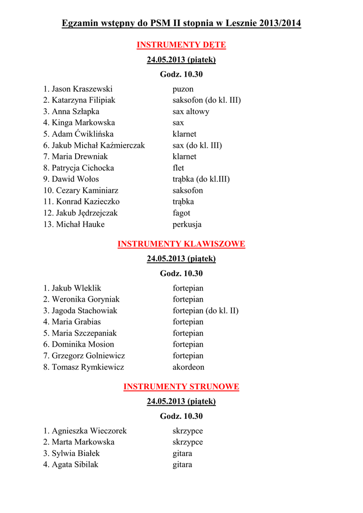 Egzamin wstępny do PSM II stopnia w Lesznie 2013/2014