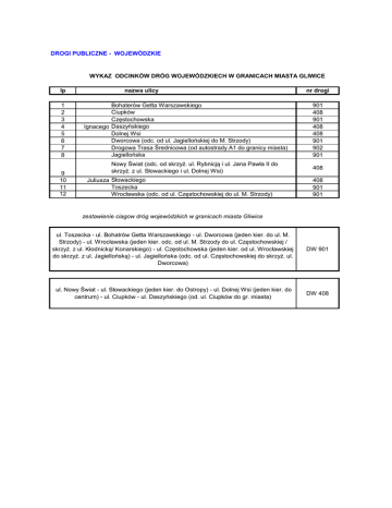 DROGI PUBLICZNE - WOJEWÓDZKIE WYKAZ ODCINKÓW DRÓG WOJEWÓDZKIECH W GRANICACH MIASTA GLIWICE lp 1 2 3 4 5 6 7 8 9 10 11 12 nazwa ulicy Bohaterów Getta Warszawskiego Ciupków Częstochowska Ignacego Daszyńskiego Dolnej Wsi Dworcowa (odc. od ul. Jagiellońskiej do M. Strzody) Drogowa Trasa Średnicowa (od autostrady A1 do granicy miasta) Jagiellońska Nowy Świat (odc. od skrzyż. ul. Rybnicją i ul. Jana Pawła II do skrzyż. z ul. Słowackiego i ul. Dolnej Wsi) Juliusza Słowackiego Toszecka Wrocławska (odc. od ul. Częstochowskiej do ul. M. Strzody) nr drogi 901 408 901 408 408 901 902 901 408 408 901 901 zestawienie ciagow dróg wojewódzkich w granicach miasta Gliwice ul. Toszecka - ul. Bohatrów Getta Warszawskiego - ul. Dworcowa (jeden kier. do ul. M. Strzody) - ul. Wrocławska (jeden kier. odc. od ul. M. Strzody do ul. Częstochowskiej / skrzyż. z ul. Kłodnicką/ Konarskiego) - ul. Częstochowska (jeden kier. od ul. Wrocławskiej do skrzyż. z ul. Jagiellońską) - ul. Jagiellońska (odc. od ul. Częstochowskiej do skrzyż. ul. Dworcowa) DW 901 ul. Nowy Świat - ul. Słowackiego (jeden kier. do Ostropy) - ul. Dolnej Wsi (jeden kier. do centrum) - ul. Ciupków - ul. Daszyńskiego (od. ul. Ciupków do gr. miasta) DW 408