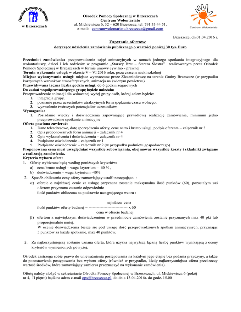 w Brzeszczach Ośrodek Pomocy Społecznej w Brzeszczach Centrum Wolontariatu ul. Mickiewicza 6, 32 – 620 Brzeszcze, tel. 791 33 44 51, e-mail: [email protected] Brzeszcze, dn.01.04.2016 r. Zapytanie ofertowe dotyczące udzielenia zamówienia publicznego o wartości poniżej 30 tys. Euro Przedmiot zamówienia: przeprowadzenie zajęć animacyjnych w ramach jednego spotkania integracyjnego dla wolontariuszy, dzieci i ich rodziców w programie „Starszy Brat – Starsza Siostra” realizowanym przez Ośrodek Pomocy Społecznej w Brzeszczach w formie umowy cywilno - prawnej Termin wykonania usługi: w okresie V – VI 2016 roku, poza czasem nauki szkolnej Miejsce wykonywania usługi: miejsce wyznaczone przez Zleceniodawcę na terenie Gminy Brzeszcze (w przypadku korzystnych warunków atmosferycznych, animacja na świeżym powietrzu) Przewidywana łączna liczba godzin usługi: do 6 godzin zegarowych Do zadań współprowadzącego grupę będzie należało: Przeprowadzenie animacji dla wskazanej wyżej grupy osób, której celem będzie: 1. integracja grupy, 2. poznanie przez uczestników atrakcyjnych form spędzania czasu wolnego, 3. wyzwolenie twórczych potencjałów uczestników, Wymagania: 1. Posiadanie wiedzy i doświadczenia zapewniające prawidłową realizację zamówienia, minimum jedno przeprowadzone spotkanie animacyjne Oferta powinna zawierać: 1. Dane teleadresowe, datę sporządzenia oferty, cenę netto i brutto usługi, podpis oferenta – załącznik nr 3 2. Opis proponowanych form animacji – załącznik nr 4 3. Opis wykształcenia i doświadczenia – załącznik nr 4 4. Podpisane oświadczenie – załącznik nr 1 5. Podpisane oświadczenie – załącznik nr 2 (w przypadku podmiotu gospodarczego) Proponowana cena musi uwzględniać wszystkie zobowiązania, obejmować wszystkie koszty i składniki związane z realizacją zamówienia. Kryteria wyboru ofert: 1. Oferty wybierane będą według poniższych kryteriów: a) cena brutto usługi – waga kryterium – 60 % , b) doświadczenie – waga kryterium -40% 2. Sposób obliczania ceny oferty zamawiający ustalił następująco : ofercie o najniższej cenie za usługę przyznana zostanie maksymalna ilość punktów (60), pozostałym zaś ofertom przyznana zostanie odpowiednio ilość punktów obliczona na podstawie następującego wzoru : najniższa cena ilość punktów oferty badanej = ----------------------------- x 60 cena w ofercie badanej ofertom z największym doświadczeniem w przedmiocie zamówienia zostanie przyznanych max 40 pkt lub proporcjonalnie mniej. W ocenie doświadczenia bierze się pod uwagę ilość przeprowadzonych spotkań animacyjnych, przyznając 5 punktów za każde spotkanie, max 40 punktów. 3. Za najkorzystniejszą zostanie uznana oferta, która uzyska najwyższą łączną liczbę punktów wynikającą z oceny kryteriów wymienionych powyżej. Ośrodek zastrzega sobie prawo do unieważnienia postępowania na każdym jego etapie bez podania przyczyny, a także do pozostawienia postępowania bez wyboru oferty (również w przypadku, kiedy najkorzystniejsza oferta przekroczy wartość środków, które zamawiający zamierza przeznaczyć na wykonanie zamówienia). Ofertę należy złożyć w sekretariacie Ośrodka Pomocy Społecznej w Brzeszczach, ul. Mickiewicza 6 (pokój nr 4, II piętro) bądź na adres e-mail [email protected], do dnia 13.04.2016r. do godz. 15.00 Załącznik nr 1 Oświadczenie Oświadczam, że: 1. Wyrażam zgodę na przetwarzanie danych osobowych1 w celu przeprowadzenia postępowania o udzielenie zamówienia, oświadczenie dotyczy również wyrażenia zgody na opublikowanie danych osobowych (imienia, nazwiska lub nazwy firmy oraz jej siedziby) oferenta wybranego do realizacji zamówienia, na stronie internetowej Ośrodka Pomocy Społecznej w Brzeszczach oraz na tablicy ogłoszeń w siedzibie Ośrodka. 2. Posiadam niezbędne uprawnienia (jeżeli przepisy prawa nakładają obowiązek ich posiadania), wiedzę i doświadczenie, niezbędne do wykonania zamówienia /dysponuję osobami zdolnymi do wykonania zamówienia (podkreślić właściwe). Data………………….. 1 Podpis………………….. Ustawa z dnia 29 sierpnia 1997r. o ochronie danych osobowych (tj. DZ.U z 2014r. 1182 z późn. zm.) Załącznik nr 2 ………………………..……… Podmiot gospodarczy - pieczątka OŚWIADCZENIE Niniejszym oświadczam, że…………………………………………………….(nazwa firmy) z siedzibą w ……………………………………………(adres siedziby), nie zalega z płatnościami na rzecz podmiotów publicznych i prywatnych, a tym samym: nie zalega z opłacaniem podatków do US, nie zalega opłacaniem składek na ubezpieczenie zdrowotne i społeczne do ZUS, nie figuruje w Krajowym Rejestrze Długów. …………………………………………………….. (data, pieczątka i podpis) Załącznik nr 3 Odpowiedź na zapytanie ofertowe Zamawiający: Ośrodek Pomocy Społecznej w Brzeszczach, ul. Mickiewicza 6 Przedmiot zamówienia: przeprowadzenie zajęć animacyjnych w ramach jednego spotkania integracyjnego dla wolontariuszy, dzieci i ich rodziców w programie „Starszy Brat – Starsza Siostra” realizowanym przez Ośrodek Pomocy Społecznej w Brzeszczach Dane oferenta:....................................................................................................................................................... …………………………………………………………………………………………………………............... …………………………………………………………………………………………………………............... …………………………………………………………………………………………………………............... Proponowana cena netto / brutto za usługę ..................................................................................