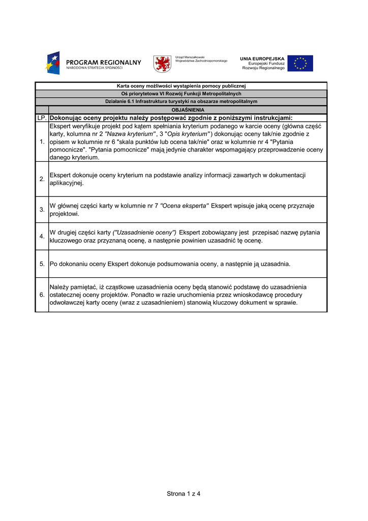 karty, kolumna nr 2 "Nazwa kryterium" , 3 "Opis kryterium" ) dokonując oceny tak/nie zgodnie z