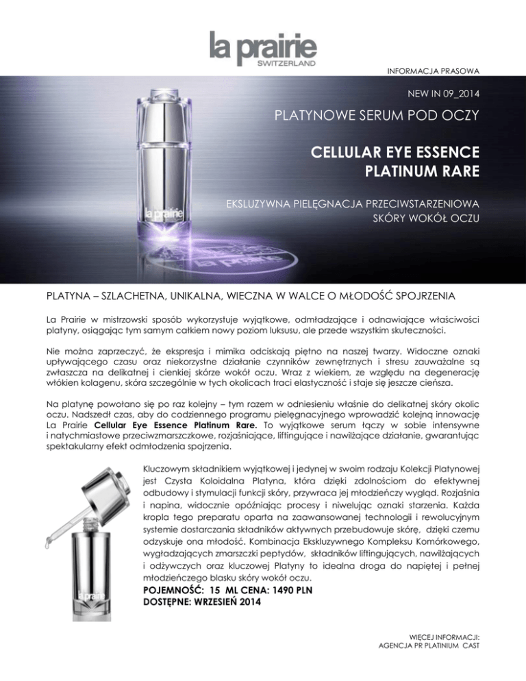 INFORMACJA PRASOWA NEW IN 09_2014 PLATYNOWE SERUM POD OCZY CELLULAR EYE ESSENCE PLATINUM RARE EKSLUZYWNA PIELĘGNACJA PRZECIWSTARZENIOWA SKÓRY WOKÓŁ OCZU PLATYNA – SZLACHETNA, UNIKALNA, WIECZNA W WALCE O MŁODOŚĆ SPOJRZENIA La Prairie w mistrzowski sposób wykorzystuje wyjątkowe, odmładzające i odnawiające właściwości platyny, osiągając tym samym całkiem nowy poziom luksusu, ale przede wszystkim skuteczności. Nie można zaprzeczyć, że ekspresja i mimika odciskają piętno na naszej twarzy. Widoczne oznaki upływającego czasu oraz niekorzystne działanie czynników zewnętrznych i stresu zauważalne są zwłaszcza na delikatnej i cienkiej skórze wokół oczu. Wraz z wiekiem, ze względu na degenerację włókien kolagenu, skóra szczególnie w tych okolicach traci elastyczność i staje się jeszcze cieńsza. Na platynę powołano się po raz kolejny – tym razem w odniesieniu właśnie do delikatnej skóry okolic oczu. Nadszedł czas, aby do codziennego programu pielęgnacyjnego wprowadzić kolejną innowację La Prairie Cellular Eye Essence Platinum Rare. To wyjątkowe serum łączy w sobie intensywne i natychmiastowe przeciwzmarszczkowe, rozjaśniające, liftingujące i nawilżające działanie, gwarantując spektakularny efekt odmłodzenia spojrzenia. Kluczowym składnikiem wyjątkowej i jedynej w swoim rodzaju Kolekcji Platynowej jest Czysta Koloidalna Platyna, która dzięki zdolnościom do efektywnej odbudowy i stymulacji funkcji skóry, przywraca jej młodzieńczy wygląd. Rozjaśnia i napina, widocznie opóźniając procesy i niwelując oznaki starzenia. Każda kropla tego preparatu oparta na zaawansowanej technologii i rewolucyjnym systemie dostarczania składników aktywnych przebudowuje skórę, dzięki czemu odzyskuje ona młodość. Kombinacja Ekskluzywnego Kompleksu Komórkowego, wygładzających zmarszczki peptydów, składników liftingujących, nawilżających i odżywczych oraz kluczowej Platyny to idealna droga do napiętej i pełnej młodzieńczego blasku skóry wokół oczu. POJEMNOŚĆ: 15 ML CENA: 1490 PLN DOSTĘPNE: WRZESIEŃ 2014 WIĘCEJ INFORMACJI: AGENCJA PR PLATINIUM CAST INFORMACJA PRASOWA SKŁADNIKI AKTYWNE: PRZECIWZMARSZCZKOWE / RELAKSUJĄCE PLATYNOWY PEPTYD - synergiczne połączenie Acetylo Tetrapeptydu -17 z cząsteczką platyny pozwoliło na uzyskanie wyjątkowo stabilnego składnika o silnie przeciwzmarszczkowych i ujędrniających właściwościach. Nie rozpada się pod wpływem działania enzymów w skórze, dzięki czemu zapewnia długotrwałe działanie uelastyczniające i nawilżające. Spektakularnie zmniejszenia widoczności zmarszczek w okolicy oczu Roślinny kompleks rozluźniający minimalizuje podskórne mikro-skurcze mięśni, zapobiegając powstawaniu i pogłębianiu się zmarszczek mimicznych. Fermentowana czarna herbata zwiększa elastyczność skóry, poprzez przeciwdziałanie procesowi glikacji, który wpływa na sztywnienie i kruszenie się włókien kolagenowych. ROZJAŚNIAJĄCE / DEPIGMENTAUJĄCE Ekstrakt z Kwiatu Biały Ptak z Raju niweluje i zapobiega powstawaniu zasinień oraz przebarwień pod oczami. Jest to jedna z niewielu roślin, która wykształciła mechanizm pozwalający na degradację bilirubiny – czyli produktu rozkładu hemoglobiny w organizmie, odpowiedzialnego za tworzenie cieni pod oczami. Bogaty w aminokwasy oligopeptyd z zielonej mikroalgi, poprawia strukturę delikatnej skóry wokół oczu, dzięki czemu cienie oraz naczynka krwionośne są mniej widoczne. Arktyczny Pigment Perłowy (mika, dwutlenek tytanu, krzemionka) dzięki innowacyjnej technologii odbijania światła spektakularnie rozjaśnia skórę wokół oczu. Kofeina pomaga zredukować widoczność zasinień oraz wspiera redukcję miejscowych złogów tłuszczowych, zmniejszając opuchliznę. LIFTINGUJACE I NAPINAJĄCE Innowacyjny kompleks naturalnych polimerów intensywnie napina skórę wokół oczu. NAWILŻAJĄCE I ODŻYWCZE Ekstrakt z macierzystych komórek roślinnych oraz koloidalna woda platynowa działają antyoksydacyjnie chroniąc skórę przed szkodliwym działaniem czynników zewnętrznych i degradacją DNA. Ekstrakt z Czerwonych Alg tworzy na powierzchni skóry warstwę okluzyjną zabezpieczającą przez transepidermalną utratą wody. Hialuronian Sodu o dużej masie cząsteczkowej silnie nawilża, poprawia elastyczności, sprężystości skóry. APLIKACJA: Serum można stosować rano i wieczorem na okolice dolnej i górnej powieki oraz obszar pomiędzy brwiami. Za pomocą pipety zakończonej metalową, chłodzącą kulką można wykonać masaż. WIĘCEJ INFORMACJI: AGENCJA PR PLATINIUM CAST