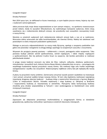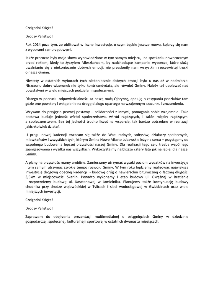 Czcigodni Księża! Drodzy Państwo! Rok 2014 poza tym, że obfitował w liczne inwestycje, o czym będzie jeszcze mowa, kojarzy się nam z wyborami samorządowymi. Jakże prorocze były moje słowa wypowiedziane w tym samym miejscu, na spotkaniu noworocznym przed rokiem, kiedy to życzyłem Mieszkańcom, by nadchodzące kampanie wyborcze, które służą uwalnianiu się z niekoniecznie dobrych emocji, nie przesłoniły nam wszystkim rzeczywistej troski o naszą Gminę. Niestety w ostatnich wyborach tych niekoniecznie dobrych emocji było u nas aż w nadmiarze. Niszczono dobry wizerunek nie tylko kontrkandydata, ale również Gminy. Należy też ubolewać nad powstałymi w wielu miejscach podziałami społecznymi. Dlatego w poczuciu odpowiedzialności za naszą małą Ojczyznę, apeluję o zasypaniu podziałów tam gdzie one powstały i wstąpienie na drogę dialogu opartego na wzajemnym szacunku i zrozumieniu. Wzywam do przyjęcia pewnej postawy – solidarności z innymi, pomagania sobie wzajemnie. Taka postawa buduje jedność wśród społeczeństwa, wśród rządzących, i także między rządzącymi a społeczeństwem. Bez tej jedności trudno liczyć na wsparcie, tak bardzo potrzebne w realizacji jakichkolwiek działań. U progu nowej kadencji zwracam się także do Was: radnych, sołtysów, działaczy społecznych, mieszkańców i wszystkich tych, którym Gmina Nowe Miasto Lubawskie leży na sercu – przystąpmy do wspólnego budowania lepszej przyszłości naszej Gminy. Dla realizacji tego celu trzeba wspólnego zaangażowania i wysiłku nas wszystkich. Wykorzystajmy najbliższe cztery lata jak najlepiej dla naszej Gminy. A plany na przyszłość mamy ambitne. Zamierzamy utrzymać wysoki poziom wydatków na inwestycje i tym samym utrzymać szybkie tempo rozwoju Gminy. W tym roku będziemy realizować największą inwestycję drogową obecnej kadencji - budowę dróg o nawierzchni bitumicznej o łącznej długości 3,5km w miejscowości Skarlin. Ponadto wykonamy I etap budowy ul. Okrężnej w Bratianie i rozpoczniemy budowę ul. Kasztanowej w Jamielniku. Planujemy także kontynuację budowy chodnika przy drodze wojewódzkiej w Tylicach i sieci wodociągowej w Gwiździnach oraz wiele mniejszych inwestycji. Czcigodni Księża! Drodzy Państwo! Zapraszam do obejrzenia prezentacji multimedialnej o osiągnięciach Gminy w dziedzinie gospodarczej, społecznej, kulturalnej i sportowej w ostatnich dwunastu miesiącach.