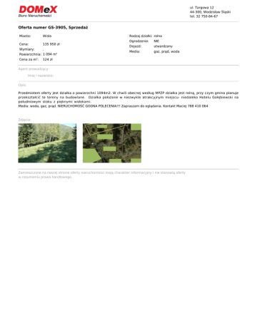 ul. Targowa 12 44-300, Wodzisław Śląski tel. 32 750-84-67 Oferta numer GS-3905, Sprzedaż Miasto: Wisła Cena: 135 950 zł Wymiary: . Powierzchnia: 1 094 m2 Cena za m2: Rodzaj działki: rolna Ogrodzenie: NIE Dojazd: utwardzany Media: gaz, prąd, woda 124 zł Agent prowadzący: Imię i nazwisko: Opis: Przedmiotem oferty jest działka o powierzchni 1094m2. W chwili obecnej według MPZP działka jest rolną, przy czym gmina planuje przekształcić te tereny na budowlane. Działka położone w niezwykle atrakcyjnym miejscu- niedaleko Hotelu Gołębiewski na południowym stoku z pięknymi widokami. Media: woda, gaz, prąd. NIERUCHOMOŚĆ GODNA POLECENIA!!! Zapraszam do oglądania. Kontakt Maciej 788 410 064 Zdjęcia: Zamieszczone na naszej stronie oferty nieruchomości mają charakter informacyjny i nie stanowią oferty w rozumieniu prawa handlowego.