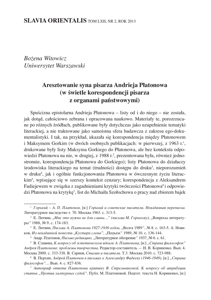 SLAVIA ORIENTALIS tom lxII, nr 2, rok 2013 тэрміналогіі... Праблемы беларускай лінгвістычнай 225 Bożena Witowicz Uniwersytet Warszawski Aresztowanie syna pisarza Andrieja Płatonowa (w świetle korespondencji pisarza z organami państwowymi) Spuścizna epistolarna Andrieja Płatonowa – listy od i do niego – nie została, jak dotąd, całościowo zebrana i opracowana naukowo. Materiały te, porozrzucane po różnych źródłach, publikowane były dotychczas jako uzupełnienie tematyki literackiej, a nie traktowane jako samoistna sfera badawcza z zakresu ego-dokumentalistyki. I tak, na przykład, ukazała się korespondencja między Płatonowem i Maksymem Gorkim (w dwóch osobnych publikacjach: w pierwszej, z 1963 r.1, drukowane były listy Maksyma Gorkiego do Płatonowa, ale bez kontekstu odpowiedzi Płatonowa na nie, w drugiej, z 1988 r.2, prezentowana była, również jednostronnie, korespondencja Płatonowa do Gorkiego); listy Płatonowa do działaczy środowiska literackiego na temat (trudności) dostępu do druku3, nieporozumień w druku4, jak i ogólnie funkcjonowania Płatonowa w ówczesnym życiu literackim5, wpisujące się w szerszy kontekst cenzury; korespondencja z Aleksandrem Fadiejewem w związku z zagadnieniami krytyki twórczości Płatonowa6 i odpowiedzi Płatonowa na krytykę7, list do Michaiła Szołochowa o pracy nad zbiorem bajek 1 Горький – А. П. Платонов, [в:] Горький и советские писатели. Неизданная переписка. Литературное наследство т. 70. Москва 1963. с. 313-5. 2 Е. Литвин, „Мне это нужно не для славы…” (письма М. Горькому), „Вопросы литературы” 1988, № 9. с. 174-183. 3 Е. Литвин, Письма А. Платонова 1927-1936 годов, „Волга 1989”, № 8. с. 163-5. А. Новиков, Из неизданной повести „Кустари слова”, „Подъем” 1989, № 10. с. 136-144. 4 Андр. Платонов, Письмо редакцию, „Литературное обозрение” 1937, № 6. с. 61. 5 В. Славина, К вопросу об эстетическом идеале А. Платонова, [в:] „Страна философов” Андрея Платонова: проблемы творчества. Редактор-составитель — Н. В. Корниенко. Вып. 4. Москва 2000. с. 333-338. В. Сарнов, Сталин и писатели. Т.3. Москва 2010. с. 723-988. 6 В. Перхин, Андрей Платонов в письмах к Александру Фадееву (1946-1949), [в:] „Страна философов”… Вып. 4. с. 827-836. 7 Автограф ответа Платонова критику В. Стрельниковой. К вопросу об атрибуции статьи „Против халтурных судей”. Публ. М. Платоновой. Подгот. текста Н. Корниенко, [в:] 226 Bożena Witowicz Czarodziejski pierścień8 oraz korespondencja Płatonowa z organami administracji państwowej dotycząca aresztowania jego syna i ogólnie związana z inwigilacją środowiska literackiego przez organy bezpieczeństwa państwowego9, o jego wyjazdach do Turkmenii10, itp. Taka wyrywkowa prezentacja korespondencji pisarza wynika z zaszłości historycznych i zawiłych losów literackich Płatonowa, utrudniających dostęp do jego spuścizny. Prace naukowe nad dorobkiem pisarza, choć pojawiały się już od lat 1960., zaczęto tak naprawdę prowadzić dopiero w latach 1990. Wiązało się to, z jednej strony, z bardziej sprzyjającym klimatem politycznym, jaki nastał wraz z pieriestrojką i następnie upadkiem ZSRR, drukiem „literatury odzyskanej” oraz udostępnieniem dla badaczy dossier jej autorów z archiwów KGB i innych organów państwowych, z drugiej strony – nawiązaniem współpracy córki Płatonowa, Marii, z Instytutem Literatury Światowej im. M. Gorkiego Rosyjskiej Akademii Nauk (dalej: IMLI RAN), dzięki czemu placówka ta dostała dostęp do domowego archiwum i mogła zapoczątkować systematyczne badanie spuścizny pisarza. Całościowe przykazanie Instytutowi tych materiałów nastąpiło po śmierci w dniu 20 października 2005 r. Marii Andriejewny Płatonowej. Zgodnie z umową zawartą między Dyrektorem IMLI RAN A. Kudelinem a wnukiem Płatonowa, który odziedziczył archiwum po śmierci matki, przekazał on także na rzecz IMLI RAN na okres 17 lat część praw autorskich dla potrzeb naukowego opracowania pełnego wydania dzieł pisarza oraz stosownych prac naukowych11. Obecnie IMLI RAN i utworzony w ramach jego struktur zespół „płatonoznawców” pod kierownictwem prof. Natalii Kornijenko jest najważniejszym ośrodkiem badawczym spuścizny Płatonowa. Wśród już wydanych pozycji znajduje się naukowe opracowanie notatników pisarza12, jego wczesnej publicystyki oraz utworów literackich w dwóch tomach13, a także siedem tomów, prezentujących wyniki prac naukowych „Страна философов”… Вып. 5. Москва 2003. с. 719-726. В. Перхин, Два письма Андрея Платонова, „Русская литература” 1990, № 1. с. 228-232. 8 Н.В. Корниенко, Письмо А. Платонова М. Шолохову и некоторые контексты работы писателя над книгой сказок „Волшебное кольцо”, [в:] „Страна философов”… Вып. 5. с. 965972. 9 Андрей Платонов в документах ОГПУ-НКВД. 1930-1945. Публ. В. Гончарова и В. Нехотина, [в:] „Страна философов”… Вып. 4. Москва 2000. с. 848-884. В. Сарнов, Сталин… с. 723-988.