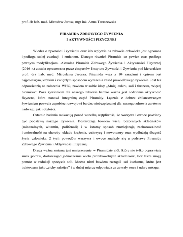 prof. dr hab. med. Mirosław Jarosz, mgr inż. Anna Taraszewska PIRAMIDA ZDROWEGO ŻYWIENIA I AKTYWNOŚCI FIZYCZNEJ Wiedza o żywności i żywieniu oraz ich wpływie na zdrowie człowieka jest ogromna i podlega stałej ewolucji i zmianom. Dlatego również Piramida co pewien czas podlega pewnym modyfikacjom. Aktualna Piramida Zdrowego Żywienia i Aktywności Fizycznej (2016 r.) została opracowana przez ekspertów Instytutu Żywności i Żywienia pod kierunkiem prof. dra hab. med. Mirosława Jarosza. Piramida wraz z 10 zasadami i opisem jest najprostszym, krótkim i zwięzłym sposobem wyrażenia zasad prawidłowego żywienia. Jest też odpowiedzią na zalecenia WHO, zawiera w sobie ideę: „Mniej cukru, soli i tłuszczu, więcej błonnika”. Poza żywieniem dla naszego zdrowia bardzo ważna jest codzienna aktywność fizyczna, która stanowi integralną część Piramidy. Łącznie z dobrze zbilansowanym żywieniem pozwala zapobiec rozwojowi bardzo niebezpiecznej dla naszego zdrowia zarówno nadwagi, jak i otyłości. Ostatnie badania wskazują ponad wszelką wątpliwość, że warzywa i owoce powinny być podstawą naszego żywienia. Dostarczają bowiem wielu bezcennych składników (mineralnych, witamin, polifenoli) i w istotny sposób zmniejszają zachorowalność i umieralność na choroby układu krążenia, cukrzycę i nowotwory oraz wydłużają długość życia człowieka. Z tych powodów warzywa i owoce znalazły się u podstawy Piramidy Zdrowego Żywienia i Aktywności Fizycznej. Drugą ważną zmianą jest umieszczenie w Piramidzie ziół, które nie tylko poprawiają smak potraw, dostarczając jednocześnie wielu prozdrowotnych składników, lecz także mogą pomóc w redukcji spożycia soli. Można nimi bowiem zastąpić sól kuchenną, która jest traktowana jako „cichy zabójca” i w dużej mierze odpowiada za zawały serca i udary mózgu. Jak rozumieć/czytać piramidę? Piramida to opis odpowiednich proporcji różnych, niezbędnych w codziennej diecie, grup produktów spożywczych przedstawiony w formie graficznej. Im wyższe piętro piramidy, tym mniejsza ilość i częstość spożywanych produktów z danej grupy żywności. Do kogo kierowana jest piramida? Piramida kierowana jest do osób zdrowych w celu zachowania dobrego stanu zdrowia. Należy pamiętać, że w przypadku współistnienia chorób cywilizacyjnych typu otyłość, cukrzyca, choroba niedokrwienna serca, nadciśnienie, osteoporoza, może istnieć konieczność modyfikacji proponowanych zaleceń w porozumieniu z lekarzem i dietetykiem. W wielu przypadkach ukrytych ww. chorób stosowanie się do podanych w piramidzie zasad może zdecydowanie zahamować rozwój tych chorób w ich pierwszej fazie.