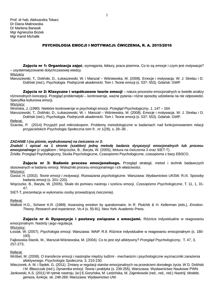 1 Prof. dr hab. Aleksandra Tokarz Dr Diana Malinowska Dr Marlena Banasik Mgr Agnieszka Bożek Mgr Kamil Michalik PSYCHOLOGIA EMOCJI I MOTYWACJI: ĆWICZENIA, R. A. 2015/2016 Zajęcia nr 1: Organizacja zajęć, wymagania, lektury, praca pisemna. Co to są emocje i czym jest motywacja? – usystematyzowanie dotychczasowej wiedzy. Wszyscy Maruszewski, T., Doliński, D., Łukaszewski, W. i Marszał – Wiśniewska, M. (2008). Emocje i motywacja. W: J. Strelau i D. Doliński (red.), Psychologia. Podręcznik akademicki. Tom I. Teorie emocji (s. 537- 553). Gdańsk: GWP. Zajęcia nr 2: Klasyczne i współczesne teorie emocji – natura procesów emocjonalnych w świetle analizy różnorodnych koncepcji. Przegląd problematyki – kontrowersje, ważne pytania i różne sposoby udzielania na nie odpowiedzi. Specyfika kulturowa emocji. Wszyscy: Wrońska, J. (1990). Niektóre kontrowersje w psychologii emocji. Przegląd Psychologiczny, 1, 147 – 164. Maruszewski, T., Doliński, D., Łukaszewski, W. i Marszał – Wiśniewska, M. (2008). Emocje i motywacja. W: J. Strelau i D. Doliński (red.), Psychologia. Podręcznik akademicki. Tom I. Teorie emocji (s. 537- 553). Gdańsk: GWP. Referat: Szarota, P. (2014) Przyjaźń pod mikroskopem. Problemy metodologiczne w badaniach nad funkcjonowaniem relacji przyjacielskich Psychologia Społeczna tom 9 , nr 1(28), s. 28–36 . ZADANIE I (na piśmie, wydrukowane) na ćwiczenia nr 3: Znaleźć i opisać na 1 stronie (szablon) jedną metodę badania dyspozycji emocjonalnych lub procesu emocjonalnego (z wyjątkiem : Wojciszke, B., Baryła, W. (2005), lektura na ćwiczenia 3 oraz SIET-T). Źródła: Przegląd Psychologiczny, Studia Psychologiczne, Czasopismo Psychologiczne, czasopisma z bazy EBSCO. Zajęcia nr 3: Badanie procesu emocjonalnego. Przegląd strategii, metod i technik badawczych stosowanych w badaniu emocji. Wskaźniki procesu emocjonalnego i ich właściwości. Wszyscy: Gasiul, H. (2002). Teorie emocji i motywacji. Rozważania psychologiczne. Warszawa: Wydawnictwo UKSW. R.IX. Sposoby badania emocji (s. 201–220). Wojciszke, B., Baryła, W. (2005). Skale do pomiaru nastroju i sześciu emocji. Czasopismo Psychologiczne, T. 11, 1, 3147. SIET-T, prezentacja w wykonaniu osoby prowadzącej ćwiczenia). Referat: Walbott H.G., Scherer K.R. (1989). Assessing emotion by questionnaire. In R. Plutchik & H. Kellerman (eds.), Emotion. Theory. Research and experience. Vo.4 (s. 55-81). New York: Academic Press. Zajęcia nr 4: Dyspozycje i postawy związane z emocjami. Różnice indywidualne w reagowaniu emocjonalnym. Nastrój i jego regulacja. Wszyscy: Łosiak, W. (2007). Psychologia emocji. Warszawa: WAiP. R.9. Różnice indywidualne w reagowaniu emocjonalnym (s. 180193). Fajkowska-Stanik, M., Marszał-Wiśniewska, M. (2004). Co to jest styl afektywny? Przegląd Psychologiczny, T. 47, 3, 257-273, Referat: Wróbel, M. (2008). O transferze emocji i nastrojów między ludźmi - mechanizm i psychologiczne wyznaczniki zarażenia afektywnego. Psychologia Społeczna, 3, 210-230. Wieczorek, A. M. i Sędek, G. (2011). Zmiany w regulacji stanów emocjonalnych na przestrzeni dorosłego życia. W D. Doliński i M. Błaszczak (red.), Dynamika emocji. Teoria i praktyka (s. 239-255). Warszawa: Wydawnictwo Naukowe PWN. Jankowski, K.S. (2011) W rytmie nastroju. [w:] E.Goryńska, M. Ledzińska, M. Zajenkowski (red., red., red.) Nastrój. Modele, geneza, funkcje, str. 248-269, Warszawa: Wydawnictwo UW. 2 Zajęcia nr 5: Funkcje regulacyjne emocji. Przykłady z dziedziny zachowań społecznych. Wszyscy: Maruszewski, T., Doliński, D., Łukaszewski. W. i Marszał- Wiśniewska. M. (2008). Emocje i motywacja. W: J. Strelau i D. Doliński (red.), Psychologia. Podręcznik akademicki. Tom I. 7.4. Współdeterminowanie zachowania przez emocje i poznanie (s. 571-587). Gdańsk: GWP. Referat: Szczygieł, D., Bazińska, R., Kadzikowska-Wrzosek, R., Retowski, S. (2009). Praca emocjonalna w zawodach usługowych - pojęcie, przegląd teorii i badań. Psychologia Społeczna, T. 4, 3(11),155-166. Kudlik, A., Czerniawska E. (2011) Indywidualne oddziaływanie muzyki na człowieka - wpływ muzyki na nastrój [w:] E.Goryńska, M. Ledzińska, M. Zajenkowski (red.) Nastrój. Modele, geneza, funkcje, str. 248-269, Warszawa: Wydawnictwo UW. Zajęcia nr 6: Taksonomia ludzkich emocji. Wszyscy: Jarymowicz, M., Imbir, K. (2010). Próba taksonomii ludzkich emocji. Przegląd Psychologiczny, T.53, 4, s. 439- 447. Referat: Jarymowicz, M., Imbir, K. (2010). Próba taksonomii ludzkich emocji. Przegląd Psychologiczny, T. 53, 4, „Właściwości i źródła emocji pierwotnych generowanych automatycznie”, s. 447- 452. Jarymowicz, M., Imbir, K. (2010). Próba taksonomii ludzkich emocji. Przegląd Psychologiczny, T.53, 4, „Źródła emocji powstających w systemie refleksyjnym”, s. 453- 461. Zajęcia nr 7: Irracjonalność czy racjonalność emocji? Fenomenologiczne badanie emocji. Wszyscy: Węgrzecki, A. (1990). O irracjonalności uczuć. Zeszyty Naukowe Akademii Ekonomicznej w Krakowie, nr 310, 5 – 17. Referat: Giorgi, A. (1999/2003). Szkic psychologicznej metody fenomenologicznej. W A. Giorgi (red.), Fenomenologia i badania psychologiczne (s. 23–39). Białystok: Transhumana. Zajęcia nr 8: Patologia procesów emocjonalno-motywacyjnych. Wszyscy: Sęk, H. (2008). Psychologia zaburzeń afektywnych. W: H. Sęk (red.), Psychologia kliniczna, Tom 2 (s. 101-118). Warszawa: Wydawnictwo Naukowe PWN. Referat: Rybka, A. (2014). Historia poszukiwań odpowiedzi na pytanie o istotę autyzmu. Psychologia Rozwojowa , T .19, 1, 9–29. Groth, J. (2011). Oblicza psychopatii. Wydawnictwo Scholar. R.6. Psychopata odnoszący sukces. Zajęcia nr 9: Podstawowe mechanizmy motywacyjne. Natura procesów motywacyjnych w świetle analizy różnorodnych koncepcji. Wszyscy: Maruszewski, T., Doliński, D., Łukaszewski, W. i Marszał- Wiśniewska, M. (2008). Emocje i motywacja. W: J. Strelau i D. Doliński (red.), Psychologia. Podręcznik aka
