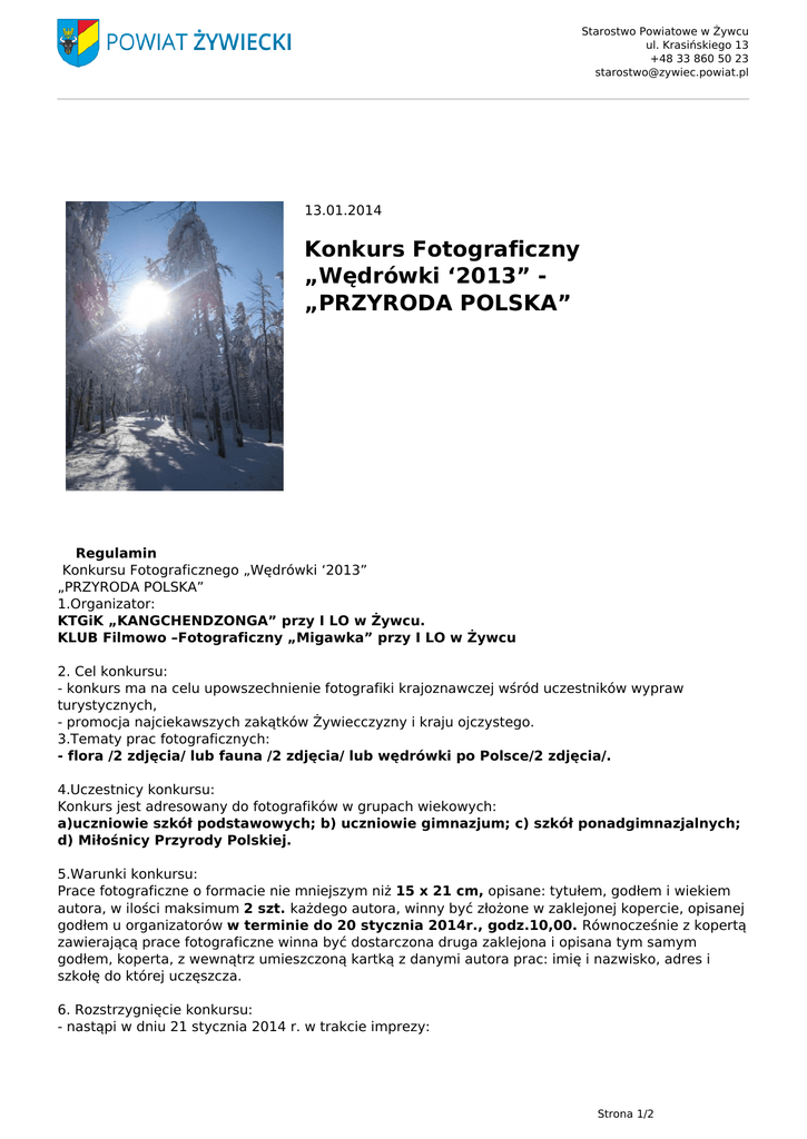 Starostwo Powiatowe w Żywcu ul. Krasińskiego 13 +48 33 860 50 23 [email protected] 13.01.2014 Konkurs Fotograficzny „Wędrówki ‘2013” „PRZYRODA POLSKA” Regulamin Konkursu Fotograficznego „Wędrówki ‘2013” „PRZYRODA POLSKA” 1.Organizator: KTGiK „KANGCHENDZONGA” przy I LO w Żywcu. KLUB Filmowo –Fotograficzny „Migawka” przy I LO w Żywcu 2. Cel konkursu: - konkurs ma na celu upowszechnienie fotografiki krajoznawczej wśród uczestników wypraw turystycznych, - promocja najciekawszych zakątków Żywiecczyzny i kraju ojczystego. 3.Tematy prac fotograficznych: - flora /2 zdjęcia/ lub fauna /2 zdjęcia/ lub wędrówki po Polsce/2 zdjęcia/. 4.Uczestnicy konkursu: Konkurs jest adresowany do fotografików w grupach wiekowych: a)uczniowie szkół podstawowych; b) uczniowie gimnazjum; c) szkół ponadgimnazjalnych; d) Miłośnicy Przyrody Polskiej. 5.Warunki konkursu: Prace fotograficzne o formacie nie mniejszym niż 15 x 21 cm, opisane: tytułem, godłem i wiekiem autora, w ilości maksimum 2 szt. każdego autora, winny być złożone w zaklejonej kopercie, opisanej godłem u organizatorów w terminie do 20 stycznia 2014r., godz.10,00. Równocześnie z kopertą zawierającą prace fotograficzne winna być dostarczona druga zaklejona i opisana tym samym godłem, koperta, z wewnątrz umieszczoną kartką z danymi autora prac: imię i nazwisko, adres i szkołę do której uczęszcza. 6. Rozstrzygnięcie konkursu: - nastąpi w dniu 21 stycznia 2014 r. w trakcie imprezy: Strona 1/2 Starostwo Powiatowe w Żywcu ul. Krasińskiego 13 +48 33 860 50 23 [email protected] XXIII SPOTKANIE MIŁOŚNIKÓW GÓR –Żywiec’2014, przez komisję konkursową, wytypowaną przez organizatorów. 7. Nagrody: Najlepsze prace fotograficzne zostaną nagrodzone upominkami ufundowanymi przez organizatorów i sponsorów, wręczonymi w trakcie imprezy. 8. Wystawa prac: Organizatorzy zastrzegają sobie prawo do prezentacji, ich zdaniem najciekawszych prac, na wystawie w czasie trwania imprezy i po jej zakończeniu. 9. Uwagi końcowe: Organizatorzy zastrzegają sobie prawo do interpretacji niniejszego regulaminu. ORGANIZATORZY Strona 2/2 Powered by TCPDF (www.tcpdf.org)