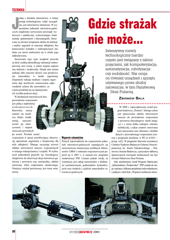 TECHNIKA J edną z dziedzin ratownictwa, w której postęp technologiczny widać szczególnie, jest ratownictwo chemiczne. W wyposażeniu jednostek ratowniczo-gaśniczych znajdziemy nowoczesne przyrządy wykrywcze i analityczne, wykorzystujące różne metody spektrometrii i chromatografii. Stosowane są również urządzenia zdolne do detekcji i analizy zagrożeń ze znacznej odległości, bez konieczności kontaktu z niebezpiecznym medium czy nawet znalezienia się w strefie jego oddziaływania. Stosowanie tego typu urządzeń pozwala na dość szybką identyfikację substancji niebezpiecznej oraz ocenę, w jakim stopniu zagraża ona ludziom i środowisku. Dzięki nim można uniknąć albo znacznie skrócić czas przebywania ratowników w strefie zagrożonej. Znajomość rodzaju medium i stopnia zagrożenia daje mozliwość zastosowania odpowiednich ochron dla ratowników, co często przekłada się na zmniejszenie ich wysiłku podczas akcji. W działaniach ratowniczych faza prowadzenia rozpoznania jest jedną z najbardziej niebezpiecznych. Ratownicy muszą znaleźć się możliwie blisko źródła emisji, naocznie ocenić jej intensywność i stopień zniszczeń powstałych po awarii. Powinni zostać wyposażeni w sprzęt umożliwiający obserwację epicentrum zagrożenia z bezpiecznej dla nich odległości. Dlatego zaczynają używać zdalnie sterowanych maszyn, wyposażonych w różnego rodzaju kamery i czujniki. W wybranych jednostkach pojawiły się: bezzałogowy śmigłowiec do obserwacji akcji ratowniczo-gaśniczej z powietrza oraz samojezdny, zdalnie sterowany robot rozpoznania chemicznego. Niniejszy artykuł poświęcony jest temu ostatniemu. 30 Gdzie strażak nie może... Intensywny rozwój technologiczny bardzo często jest związany z takimi pojęciami, jak komputeryzacja, automatyzacja, robotyzacja czy mobilność. Nie omija on również urządzeń i sprzętu używanego przez służby ratownicze, w tym Państwową Straż Pożarną. Zbigniew Bala Wsparcie ratownictwa Pomysł wprowadzenia do wyposażenia jednostek ratowniczo-gaśniczych zajmujących się ratownictwem chemicznym mobilnych laboratoriów CBRN z robotami rozpoznawczymi pojawił się w 2007 r., w ramach tzw. programu modernizacji PSP. Uznano jednak wtedy, że ważniejszy jest zakup samochodów z drabinami mechanicznymi, podnośników hydraulicznych oraz średnich i ciężkich samochodów ratowniczo-gaśniczych. 2/2012 W 2008 r. zapoczątkowany został program badawczy „Proteus”, którego celem jest opracowanie zdalnie sterowanych maszyn do prowadzenia rozpoznania z powietrza (bezzałogowy statek latający) i z ziemi (kilka rodzajów robotów mobilnych), a także centrów sterowania tymi maszynami oraz zbierania i obróbki danych z prowadzonego rozpoznania [szerzej o programie pisaliśmy w PP, nr 6/2011 – przyp. red.]. W programie aktywnie uczestniczy Centrum Naukowo-Badawcze Ochrony Przeciwpożarowej im. Józefa Tuliszkowskiego – Państwowy Instytut Badawczy, a przyszłym odbiorcą opracowanych rozwiązań technicznych ma być również Państwowa Straż Pożarna. Gdy uruchomiony został Program Operacyjny „Infrastruktura i Środowisko”, PSP została do niego wpisana z kilkoma projektami indywidualnymi, a jednym z nich było „Wsparcie techniczne ratow- nictwa chemicznego i ekologicznego”. Odżył wtedy pomysł na zastosowanie w ratownictwie chemicznym robota rozpoznawczego. Zaawansowanie programu „Proteus” (opracowanie i wdrożenie do produkcji kilku rodzajów robotów mobilnych) pozwalało na dość szeroki wybór konstrukcji produkcji polskiej i zagranicznej. GRYF i TRM W 2009 r. zadecydowano o wdrożeniu w ramach projektu „Wsparcia technicznego ratownictwa chemicznego i ekologicznego” pilotażowego zadania zakupu robota rozpoznania chemicznego dla Jednostki Ratowniczo-Gaśniczej PSP nr 6 w Warszawie, stanowiącej bazę dla Specjalistycznej Grupy Ratownictwa Chemicznego „Warszawa-6”. GRYF – parametry techniczne* Podstawowe przewidziane dla niego wymagania obejmowały: ● szybkie wkroczenie do działań, ● dużą mobilność, głównie pokonywanie różnych przeszkód – krawężników, schodów itp., ● możliwość poruszania się w kanałach i innych ciasnych przestrzeniach niedostępnych dla ratowników, ● wwiezienie w strefę zagrożenia przyrządów pomiarowych oraz pobranie na miejscu próbek do analizy, ● wizyjną obserwację miejsca zdarzenia w normalnym świetle i w podczerwieni. Tak postawione zadania narzucały m.in. następujące wymagania techniczne: ● możliwie małe gabaryty, jednak zapewniające stabilność podczas jazdy i operowania chwytakiem, Masa – 28 kg. Gabaryty w stanie gotowym do działań: długość – 74 cm, szerokość – 51 cm, wysokość – 40 cm (wymiary z ramieniem złożonym do pozycji transportowej). Zdolność pokonywania wzniesień: wzdłużnych – 40°, poprzecznych – 25°. Zdolność pokonywania stopni o wysokości 20 cm. Maksymalna prędkość jazdy – 1 m/s. Udźwig chwytaka: na ramieniu całkowicie złożonym – 5 kg, na ramieniu maksymalnie wysuniętym – 2 kg. Maksymalne wysunięcie ramienia z chwytakiem: w poziomie od obrysu bazy jezdnej – 140 cm, w pionie od powierzchni podłoża – 150 cm. Stopnie swobody ramienia – 3: obrót w osi pionowej bazy jezdnej – ±190°, odchylenie ramienia od osi pionowej bazy jezdnej – ±90°, odchylenie przedramienia od osi ramienia – ±130°. Stopnie swobody chwytaka – 2: odchylenie od osi przedramienia – ±130°, obrót w osi podłużnej – ±150°, rozwarcie szczęk chwytaka – 16,5 cm. Liczba kamer – 4: kamera przednia, stała, kamera tylna, stała, kamera chwytaka, stała, kamera ogólna, regulowana: obrót w osi pionowej – ±335°, obrót w osi poziomej – ±160°, regulacja zbliżenia (zoom) – 37x. Oświetlenie: główne białe LED – 2 szt. (obracane razem z kamerą główną), pomocnicze podczerwone IRED – 4 szt. (przy kamerach stałych): przód –