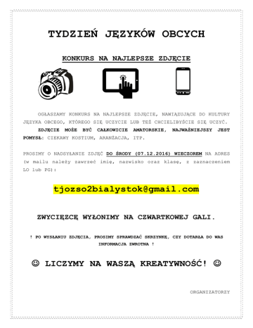 TYDZIEŃ JĘZYKÓW OBCYCH KONKURS NA NAJLEPSZE ZDJĘCIE OGŁASZAMY KONKURS NA NAJLEPSZE ZDJĘCIE, NAWIĄZUJĄCE DO KULTURY JĘZYKA OBCEGO, KTÓREGO SIĘ UCZYCIE LUB TEŻ CHCIELIBYŚCIE SIĘ UCZYĆ. ZDJĘCIE MOŻE BYĆ CAŁKOWICIE AMATORSKIE, NAJWAŻNIEJSZY JEST POMYSŁ: CIEKAWY KOSTIUM, ARANŻACJA, ITP. PROSIMY O NADSYŁANIE ZDJĘĆ DO ŚRODY (07.12.2016) WIECZOREM NA ADRES (w mailu należy zawrzeć imię, nazwisko oraz klasę, z zaznaczeniem LO lub PG): [email protected] ZWYCIĘZCĘ WYŁONIMY NA CZWARTKOWEJ GALI. ! PO WYSŁANIU ZDJĘCIA, PROSIMY SPRAWDZAĆ SKRZYNKĘ, CZY DOTARŁA DO WAS INFORMACJA ZWROTNA ! LICZYMY NA WASZĄ KREATYWNOŚĆ! ORGANIZATORZY