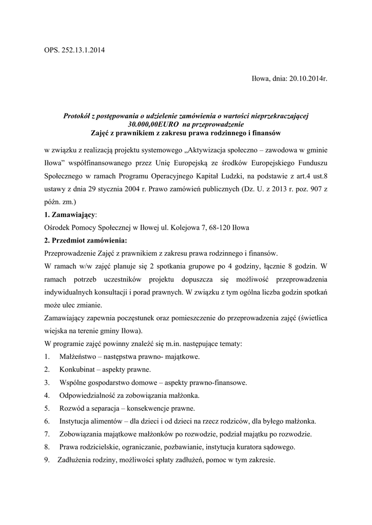 OPS. 252.13.1.2014 Iłowa, dnia: 20.10.2014r. Protokół z postępowania o udzielenie zamówienia o wartości nieprzekraczającej 30.000,00EURO na przeprowadzenie Zajęć z prawnikiem z zakresu prawa rodzinnego i finansów w związku z realizacją projektu systemowego „Aktywizacja społeczno – zawodowa w gminie Iłowa” współfinansowanego przez Unię Europejską ze środków Europejskiego Funduszu Społecznego w ramach Programu Operacyjnego Kapitał Ludzki, na podstawie z art.4 ust.8 ustawy z dnia 29 stycznia 2004 r. Prawo zamówień publicznych (Dz. U. z 2013 r. poz. 907 z późn. zm.) 1. Zamawiający: Ośrodek Pomocy Społecznej w Iłowej ul. Kolejowa 7, 68-120 Iłowa 2. Przedmiot zamówienia: Przeprowadzenie Zajęć z prawnikiem z zakresu prawa rodzinnego i finansów. W ramach w/w zajęć planuje się 2 spotkania grupowe po 4 godziny, łącznie 8 godzin. W ramach potrzeb uczestników projektu dopuszcza się możliwość przeprowadzenia indywidualnych konsultacji i porad prawnych. W związku z tym ogólna liczba godzin spotkań może ulec zmianie. Zamawiający zapewnia poczęstunek oraz pomieszczenie do przeprowadzenia zajęć (świetlica wiejska na terenie gminy Iłowa). W programie zajęć powinny znaleźć się m.in. następujące tematy: 1. Małżeństwo – następstwa prawno- majątkowe. 2. Konkubinat – aspekty prawne. 3. Wspólne gospodarstwo domowe – aspekty prawno-finansowe. 4. Odpowiedzialność za zobowiązania małżonka. 5. Rozwód a separacja – konsekwencje prawne. 6. Instytucja alimentów – dla dzieci i od dzieci na rzecz rodziców, dla byłego małżonka. 7. Zobowiązania majątkowe małżonków po rozwodzie, podział majątku po rozwodzie. 8. Prawa rodzicielskie, ograniczanie, pozbawianie, instytucja kuratora sądowego. 9. Zadłużenia rodziny, możliwości spłaty zadłużeń, pomoc w tym zakresie. 10. Omówienie/rozwiązywanie/odpowiedzi poszczególnych zagadnień postawionych przez uczestników zajęć. Celem zajęć będzie m.in.: - nabycie/zwiększenie wiedzy z zakresu prawa rodzinnego, zarządzania finansami i majątkiem rodzinnym, - omówienie codziennych problemów i zagadnień prawnych dotyczących uczestników zajęć, 3. Termin realizacji zamówienia: październik-listopad 2014 r. 4. Wymagania: - wykształcenie wyższe prawnicze - radca prawny lub prawnik - kwalifikacje, umiejętności i doświadczenie w zakresie wymienionego obszaru tematycznego, - odpowiednie umiejętności interpersonalne, - umiejętności i doświadczenie prowadzenia zajęć grupowych z osobami zagrożonymi wykluczeniem społecznym, - referencje potwierdzające w/w umiejętności i doświadczenie, - dyspozycyjność, 5. Kryterium wyboru oferty: - cena jednostkowa za godzinę zegarową zajęć- 60 pkt - zaproponowany konspekt i harmonogram przebiegu zajęć -15 pkt - doświadczenie zawodowe w realizacji podobnych działań potwierdzone referencjami- max. 5 pkt za 1 referencje (najwyżej punktowane będą referencje z przeprowadzenia zadań w ramach pomocy społecznej) Do oferty należy dołączyć: 1. List motywacyjny. 2. CV (osoby bezpośrednio przeprowadzającej zajęcia). 3. Kserokopie dokumentacji potwierdzającej kwalifikacje i doświadczenie (osoby bezpośrednio przeprowadzającej zajęcia). 4. Zaproponowany program zajęć (konspekt) uwzględniający tematykę spotkań, ich cele, metody pracy, a także sugerowaną ilość spotkań, czas ich trwania, częstotliwość przy uwzględnieniu własnej dyspozycyjności. 5. Propozycja wzoru ankiety wstępnej i ewaluacyjnej (oferent zobowiązuje się do samodzielnego przeprowadzenia badania osiągniętych rezultatów). 6. Referencje. 7. Oświadczenie, iż oferent wyraża zgodę na przetwarzanie danych osobowych zgodnie z ustawą z dnia 29 sierpnia 1997 r. o ochronie danych osobowych (Dz.U. 2002 r. Nr 101 poz.926 z późn. zm.) w celu przeprowadzenia naboru. 8. Oświadczenie o niekaralności. 9. Oświadczenie o posiadaniu pełnej zdolności do czynności prawnych i korzystaniu w pełni z praw publicznych. 6. Sposób przygotowania oferty: Ofertę sporządzić należy na załączonym druku „formularz ofertowy”, w języku polskim, w formie pisemnej, powinna być podpisana przez osobę upoważnioną. Ofertę wraz z załącznikami należy złożyć w zaklejonej kopercie z napisem „Oferta na przeprowadzenie Zajęć z prawnikiem z zakresu prawa rodzinnego i finansów”. 7. Miejsce i termin złożenia oferty: Ofertę należy złożyć w siedzibie Ośrodka Pomocy Społecznej w Iłowej przy ul. Kolejowej 7, osobiście lub pocztą tradycyjną, w terminie do 13.10.2014 r. do godziny 15.00. 9.Tryb postępowania: Postępowanie prowadzono na podstawie art.4 p-t 8 ustawy z dnia 29 stycznia 2004r. Prawo zamówień publicznych (Dz.U.z 2006r. r 164, poz.1163 z późn. zmianami) - zapytanie ofertowe. Dnia 02.10.2014r. pisemne zapytanie ofertowe udostępniono na tablicy ogłoszeń, na stronie internetowej tut. Ośrodka oraz poinformowano potencjalnych wykonawców o wszczęciu postępowania dot. ww. przedmiotu zamówienia. 10. Otwarcie ofert. Otwarcie ofert odbyło się 20.10.2014roku o godzinie 12.00 w Ośrodku Pomocy Społecznej, ul. Kolejowa 7, 68-120 Iłowa Komisja w składzie: Elżbieta Kinal - kierownik Katarzyna Siwak – Galik – pracownik socjalny Do upływu terminu złożono 4 oferty. 1. CAMBIAR Beata Piasny, 2. Radosław Sulikowski, 3. Kancelaria Radcy Prawnego Łukasz Ostrowski, 4. Kancelaria Radcy Prawnego Mateusz Dziurdzia 11. Wykonawcy, którzy złożyli ważne oferty – punktacja przyznana ofertom wg kryterium oceny ofert. Oferta nr 1 CAMBIAR Beata Piasny uzyskała 42,99 punktów. Oferta nr 2 Radosław Sulikowski uzyskała 80 punktów. Oferta nr 3 Kancelaria Radcy Prawnego Łukasz Ostrowski uzyskała 38,45 punktów. Oferta nr 4 Kancelaria Radcy Prawnego Mateusz Dziurdzia uzyskała 11,38 punktów. Oferty są ważne, nie podlegają odrzuceniu. W wyniku porównania ofert zgodnie z kryteriami ich oceny, największą liczbę punk