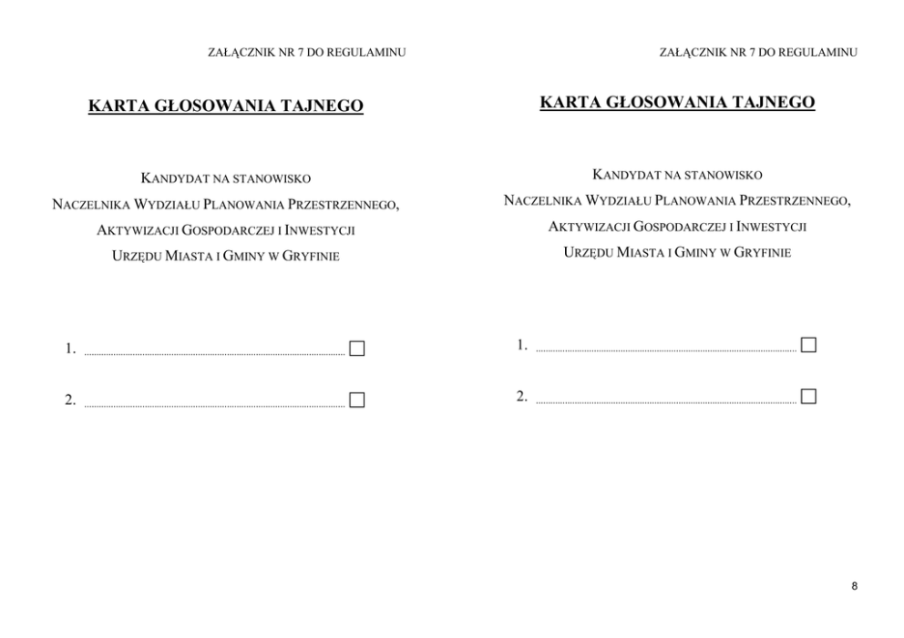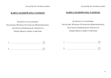 ZAŁĄCZNIK NR 7 DO REGULAMINU ZAŁĄCZNIK NR 7 DO REGULAMINU KARTA GŁOSOWANIA TAJNEGO KARTA GŁOSOWANIA TAJNEGO KANDYDAT NA STANOWISKO KANDYDAT NA STANOWISKO NACZELNIKA WYDZIAŁU PLANOWANIA PRZESTRZENNEGO, NACZELNIKA WYDZIAŁU PLANOWANIA PRZESTRZENNEGO, AKTYWIZACJI GOSPODARCZEJ I INWESTYCJI AKTYWIZACJI GOSPODARCZEJ I INWESTYCJI URZĘDU MIASTA I GMINY W GRYFINIE URZĘDU MIASTA I GMINY W GRYFINIE 1. ............................................................................................................ 1. ............................................................................................................ 2. ............................................................................................................ 2. ............................................................................................................ 8
