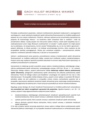 Pacjent w kolejce nie ma prawa wyboru lekarza ani terminu? Pomiędzy oczekiwaniami pacjentów, realnymi możliwościami placówek medycznych a wymaganiami wynikającymi z zasad udzielania świadczeń opieki zdrowotnej finansowanych ze środków publicznych pojawia się coraz więcej rozbieżności. Ostatnio, odmowa zapisania przez przychodnię specjalistyczną pacjenta do konkretnego lekarza i na konkretny dzień omawiana była w mediach i stała się przedmiotem debaty. Czyżby pacjent nie miał prawa wyboru lekarza, nawet jeżeli wiązałoby się to z zaakceptowanym przez niego dłuższym oczekiwaniem na wizytę? I czyżby pacjent nie mógł zapisać się na późniejszy, niż proponowany, termin wizyty? Wydawałoby się, że nie ma takich ograniczeń – pacjent deklaruje, że dłużej poczeka i nie blokuje wcześniejszego terminu, który zwalania się dla przypadków bardziej wymagających. Wizyta jest umówiona wspólnie, z poszanowaniem planów pacjenta i możliwości placówki medycznej. A jak jest w rzeczywistości? Jednym z podstawowych praw pacjenta, przewidzianym ustawą o świadczeniach opieki zdrowotnej finansowanych ze środków publicznych (dalej: ustawa) jest możliwość wyboru świadczeniodawcy. Pacjent może więc wybierać spośród wszystkich placówek na terenie całej Polski (brak rejonizacji), na zasadach przewidzianych w przepisach. Uprawnienie to obejmuje przede wszystkim prawo wyboru świadczeniodawcy udzielającego usług z zakresu podstawowej opieki zdrowotnej i posiadającego umowę z NFZ (art. 28 ust. 1 – 1d ustawy). Dokonując takiego wyboru, pacjent jednocześnie składa deklaracje wyboru lekarza podstawowej opieki zdrowotnej, pielęgniarki podstawowej opieki zdrowotnej lub położnej podstawowej opieki zdrowotnej. Prawo do takiego wyboru jest bezpłatne i przysługuje nie częściej niż trzy razy w roku kalendarzowym. W przypadku każdej kolejnej zmiany, pacjent wnosi opłatę w wysokości 80 złotych, jednakże opłata nie jest pobierana w przypadku zmiany miejsca zamieszkania pacjenta lub w przypadku zaprzestania udzielania świadczeń opieki zdrowotnej przez wybranego świadczeniodawcę, lekarza, pielęgniarkę lub położną lub z innych przyczyn powstałych po stronie świadczeniodawcy. Regulując prawo dostępu do innych świadczeń finansowanych ze środków publicznych ustawodawca nie przewidział już takich szczególnych uprawnień dla pacjentów. Zgodnie bowiem z art. 29 – 31 ustawy, pacjenci mają zagwarantowane wyłącznie prawo wyboru: świadczeniodawcy udzielającego ambulatoryjnych świadczeń specjalistycznych spośród tych świadczeniodawców, którzy zawarli umowy o udzielanie świadczeń opieki zdrowotnej; szpitala spośród szpitali, które zawarły umowę o udzielanie świadczeń opieki zdrowotnej; lekarza dentysty spośród lekarzy dentystów, którzy zawarli umowę o udzielanie świadczeń opieki zdrowotnej. O ile więc przepisy wprost przyznają pacjentom prawo wyboru stałego lekarza podstawowej opieki zdrowotnej (lekarza rodzinnego), to w przypadku świadczeń wykonywanych w ambulatoryjnej opiece GACH, HULIST, MIZIŃSKA, WAWER – ADWOKACI I RADCOWIE PRAWNI SP.P. specjalistycznej (lekarze specjaliści) oraz w lecznictwie zamkniętym (szpitale) prawo wyboru ogranicza się tylko do świadczeniodawcy, a więc podmiotu, który zawarł umowę z NFZ. Pacjent ma więc prawo wyboru wyłącznie szpitala czy poradni, ale już nie lekarza prowadzącego leczenie, jeżeli dana placówka medyczna zatrudnia kilku lekarzy danej specjalności a pacjent leczy się w ramach ubezpieczenia zdrowotnego. Swobodny wybór specjalisty jest więc możliwy tylko w prywatnej jednostce. Oczywiście, jeżeli dana poradnia specjalistyczna zatrudnia kilku specjalistów z danej dziedziny i wszyscy oni przyjmują na bieżąco, nie ma jakichkolwiek przeszkód, aby pacjent mógł wskazać danego lekarza. Brak ustawowego prawa nie oznacza braku możliwości. Przychylenie się do woli pacjenta w zakresie wyboru konkretnego lekarza powinno być w takiej sytuacji dobrą praktyką. Problem zaczyna się jednak, jeżeli kolejki oczekiwania na wizytę do nich są różne lub przyjmują oni z różną częstotliwością. Ustawa wskazuje bowiem, że świadczenia opieki zdrowotnej w szpitalach i świadczenia specjalistyczne w ambulatoryjnej opiece zdrowotnej są udzielane według kolejności zgłoszeń (art. 20 ustawy). Listy oczekujących mają być aktualizowane na bieżąco i przekazywane są co miesiąc właściwemu oddziałowi wojewódzkiemu NFZ (art. 23 ust. 1 Ustawy). Jednocześnie, świadczeniodawca przekazuje co najmniej raz w tygodniu informację o pierwszym wolnym terminie udzielenia świadczenia (art. 23 ust. 4 Ustawy), wyodrębnionym według kryteriów medycznych dla przypadków „pilnych” oraz „stabilnych.” Pierwszym wolnym terminem jest rzeczywisty i faktyczny termin, w których świadczenia mogą być udzielane. Dlatego, jeżeli świadczeniodawca, nie jest w stanie udzielić pacjentowi świadczenia w dniu zgłoszenia, powinien mu wskazać pierwszy wolny termin wizyty, który jest zgodny z terminem przekazanym raportem sprawozdawczym do NFZ. I nie ma tutaj znaczenia osoba danego lekarza czy też jego harmonogram pracy. Pierwszy wolny termin ustalany jest bowiem dla danej pracowni a nie dla konkretnych zatrudnionych w przez świadczeniodawcę lekarzy. Stąd, prawo wyboru lekarza specjalisty lub lekarza prowadzącego zostaje teoretycznie wyłączna dla pacjentów oczekujących w kolejce na świadczenie zdrowotne. Z tych samych względów, wykluczona została możliwość ustalania przez pacjenta indywidualnego terminu wizyty. W praktyce, sporo problemów dostarcza więc sytuacja, w której pacjent nie może z różnych względów stawić się na pierwszy wskazany przez świadczeniodawcę i raportowany do NFZ wolny termin wizyty i chce zapisać się np. kilka dni później. Teoretycznie nie jest to możliwe, co oznacza, że takiego pacjenta nie powin