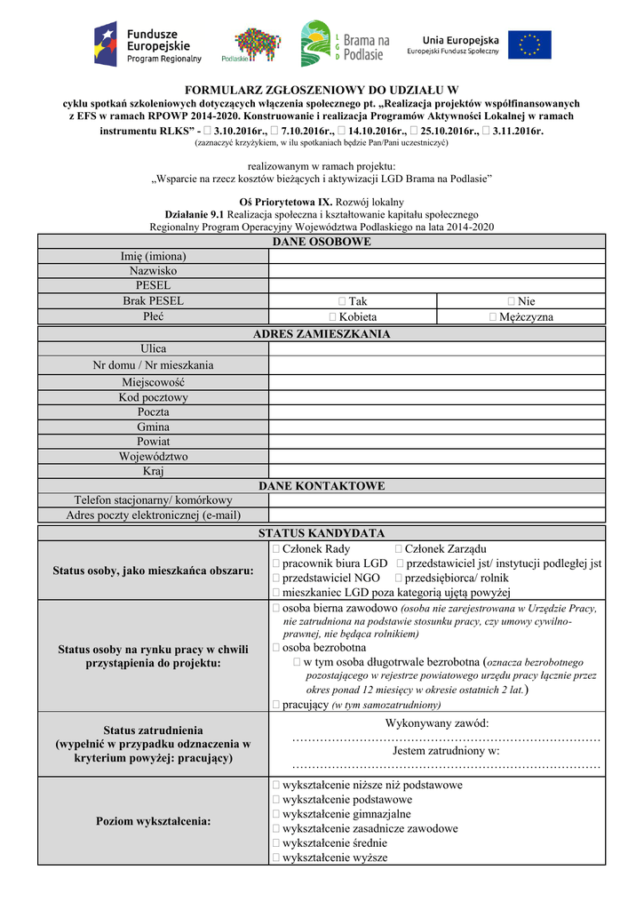 FORMULARZ ZGŁOSZENIOWY DO UDZIAŁU W cyklu spotkań szkoleniowych dotyczących włączenia społecznego pt. „Realizacja projektów współfinansowanych z EFS w ramach RPOWP 2014-2020. Konstruowanie i realizacja Programów Aktywności Lokalnej w ramach instrumentu RLKS” - 3.10.2016r., 7.10.2016r., 14.10.2016r., 25.10.2016r., 3.11.2016r. (zaznaczyć krzyżykiem, w ilu spotkaniach będzie Pan/Pani uczestniczyć) realizowanym w ramach projektu: „Wsparcie na rzecz kosztów bieżących i aktywizacji LGD Brama na Podlasie” Oś Priorytetowa IX. Rozwój lokalny Działanie 9.1 Realizacja społeczna i kształtowanie kapitału społecznego Regionalny Program Operacyjny Województwa Podlaskiego na lata 2014-2020 DANE OSOBOWE Imię (imiona) Nazwisko PESEL Brak PESEL Płeć Tak Kobieta ADRES ZAMIESZKANIA Nie Mężczyzna Ulica Nr domu / Nr mieszkania Miejscowość Kod pocztowy Poczta Gmina Powiat Województwo Kraj DANE KONTAKTOWE Telefon stacjonarny/ komórkowy Adres poczty elektronicznej (e-mail) STATUS KANDYDATA Członek Rady Członek Zarządu pracownik biura LGD przedstawiciel jst/ instytucji podległej jst Status osoby, jako mieszkańca obszaru: przedstawiciel NGO przedsiębiorca/ rolnik mieszkaniec LGD poza kategorią ujętą powyżej osoba bierna zawodowo (osoba nie zarejestrowana w Urzędzie Pracy, nie zatrudniona na podstawie stosunku pracy, czy umowy cywilnoprawnej, nie będąca rolnikiem) Status osoby na rynku pracy w chwili przystąpienia do projektu: osoba bezrobotna w tym osoba długotrwale bezrobotna (oznacza bezrobotnego pozostającego w rejestrze powiatowego urzędu pracy łącznie przez okres ponad 12 miesięcy w okresie ostatnich 2 lat.) pracujący (w tym samozatrudniony) Status zatrudnienia (wypełnić w przypadku odznaczenia w kryterium powyżej: pracujący) Poziom wykształcenia: Wykonywany zawód: …………………………………………………………………… Jestem zatrudniony w: …………………………………………………………………… wykształcenie niższe niż podstawowe wykształcenie podstawowe wykształcenie gimnazjalne wykształcenie zasadnicze zawodowe wykształcenie średnie wykształcenie wyższe INFORMACJE DODATKOWE 1. Osoba należąca do mniejszości narodowej lub etnicznej, migrant, osoba obcego pochodzenia: TAK NIE 2. Osoba bezdomna lub dotknięta wykluczeniem z dostępu do mieszkań: TAK NIE 3. Osoba z niepełnosprawnościami: TAK NIE 4. Osoba przebywająca w gospodarstwie domowym bez osób Czy należysz do jednej z wymienionych pracujących: grup (status uczestnika projektu w chwili TAK NIE przystąpienia do projektu)? w tym: w gospodarstwie domowym z dziećmi pozostającymi na utrzymaniu TAK NIE 5. Osoba żyjąca w gospodarstwie składającym się z jednej osoby dorosłej i dzieci pozostających na utrzymaniu: TAK NIE 6. Osoba w niekorzystnej sytuacji społecznej (innej niż wymienione powyżej) TAK NIE KRYTERIA RÓŻNICUJĄCE (w zależności od grupy docelowej, do której kierowane jest wsparcie - pkt. 1 i 2 – wypełnia OPS, pkt. 3 i 4 – wypełnia NGO) do 1 roku od 1 do 3 lat 1. Staż pracy w danej instytucji: od 3 do 5 lat powyżej 5 do 3 projektów 2. Liczba zrealizowanych projektów w ciągu ostatnich 5 lat z EFS w ramach od 3 do 5 projektów Programów Aktywności Lokalnej: powyżej 5 projektów 3. Działalność statutowa na rzecz grup TAK NIE defaworyzowanych określonych w LSR do 1 roku 4. Okres działalności NGO od 1 do 3 lat powyżej 3 lat Informacje dodatkowe (np. uwagi nt. diety) Zgodnie z przepisami ustawy z dnia 29 sierpnia 1997 r. o ochronie danych osobowych (jednolity tekst Dz. U. Nr 101 poz. 926 z 2002 r.) wyrażam zgodę na przetwarzanie moich danych zawartych w deklaracji oraz mojego wizerunku dla potrzeb procesu rekrutacji, realizacji, monitorowania i ewaluacji (w tym działań informacyjno- promocyjnych) w projekcie „Wsparcie na rzecz kosztów bieżących i aktywizacji LGD Brama na Podlasie” ………………………..………. data …………………………………………………………………… podpis Oświadczam, iż podane przeze mnie dane są zgodne ze stanem faktycznym. Równocześnie oświadczam, iż jestem świadoma/y odpowiedzialności karnej wynikającej z art. 271 ustawy z dnia 6 czerwca 1997r. Kodeks karny (Dz.U. Nr 89 poz. 555 ze zm. z 1997r.), dotyczącej poświadczania nieprawdy co do okoliczności mającej znaczenie prawne. Niniejszym potwierdzam prawdziwość zamieszczonych danych własnoręcznym podpisem: ………………………..………. data …………………………………………………………………… podpis