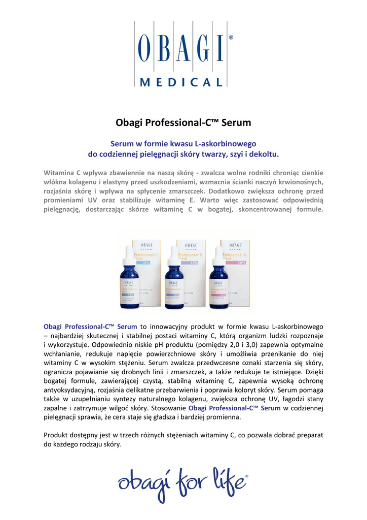Obagi Professional-C™ Serum Serum w formie kwasu L-askorbinowego do codziennej pielęgnacji skóry twarzy, szyi i dekoltu. Witamina C wpływa zbawiennie na naszą skórę - zwalcza wolne rodniki chroniąc cienkie włókna kolagenu i elastyny przed uszkodzeniami, wzmacnia ścianki naczyń krwionośnych, rozjaśnia skórę i wpływa na spłycenie zmarszczek. Dodatkowo zwiększa ochronę przed promieniami UV oraz stabilizuje witaminę E. Warto więc zastosować odpowiednią pielęgnację, dostarczając skórze witaminę C w bogatej, skoncentrowanej formule. Obagi Professional-C™ Serum to innowacyjny produkt w formie kwasu L-askorbinowego – najbardziej skutecznej i stabilnej postaci witaminy C, którą organizm ludzki rozpoznaje i wykorzystuje. Odpowiednio niskie pH produktu (pomiędzy 2,0 i 3,0) zapewnia optymalne wchłanianie, redukuje napięcie powierzchniowe skóry i umożliwia przenikanie do niej witaminy C w wysokim stężeniu. Serum zwalcza przedwczesne oznaki starzenia się skóry, ogranicza pojawianie się drobnych linii i zmarszczek, a także redukuje te istniejące. Dzięki bogatej formule, zawierającej czystą, stabilną witaminę C, zapewnia wysoką ochronę antyoksydacyjną, rozjaśnia delikatne przebarwienia i poprawia koloryt skóry. Serum pomaga także w uzupełnianiu syntezy naturalnego kolagenu, zwiększa ochronę UV, łagodzi stany zapalne i zatrzymuje wilgoć skóry. Stosowanie Obagi Professional-C™ Serum w codziennej pielęgnacji sprawia, że cera staje się gładsza i bardziej promienna. Produkt dostępny jest w trzech różnych stężeniach witaminy C, co pozwala dobrać preparat do każdego rodzaju skóry. Professional-C Serum 10%, dzięki swojej delikatnej recepturze przeznaczony jest do skóry suchej, podrażnionej lub wrażliwej. Professional-C Serum 15% jest preparatem odpowiednim dla większości typów skóry, natomiast Professional-C Serum 20% o największym stężeniu dedykowane jest skórze normalnej i tłustej (zawiera również kwas hialuronowy). Produkt zalecany jest do codziennej pielęgnacji skóry twarzy, szyi i dekoltu (5-7 kropli na oczyszczoną skórę rano, przed aplikacją kremu). Wskazany jest również przy łagodnej i umiarkowanej hiperpigmentacji oraz zwiotczeniu skóry. Może być stosowany jako uzupełnienie zabiegów medycyny estetycznej: • Zabiegi iniekcyjne - celem pielęgnacji jest pobudzenie stymulacji kolagenu podczas pielęgnacji przygotowującej oraz wzmocnienie efektów zabiegu i skrócenie czasu regeneracji podczas pielęgnacji pozabiegowej. • Zabiegi laserowe: nieablacyjne i ablacyjne - celem pielęgnacji jest zwiększenie antypigmentacyjnej skuteczności zabiegu oraz skrócenie okresu gojenia po zabiegu. CENA: Obagi Professional-C™ Serum 10% - 189 PLN/30 ml Obagi Professional-C™ Serum 15% - 226 PLN/30 ml Obagi Professional-C™ Serum 20% - 282 PLN/30 ml *** W ofercie marki Obagi znajdują się również: krem długotrwale nawilżający Obagi Hydrate™, krem Sun Shield Matte SPF 50 chroniący przed promieniowaniem UVA i UVB oraz jedwabiste serum pod oczy na bazie kofeiny ELASTIderm® Eye Complete Complex™. Preparaty marki Obagi nie zawierają parabenów oraz nie są testowane na zwierzętach. Kosmeceutyki Obagi dostępne są w ponad 100 renomowanych gabinetach dermatologii i medycyny estetycznej oraz klinikach chirurgii plastycznej. Adresy placówek dostępne są na stronie internetowej www.obagi.pl Więcej informacji: PRIMUM Public Relations Iwona Buks, [email protected], tel. 506 428 201 Martyna Giers, [email protected], tel. 514 826 324