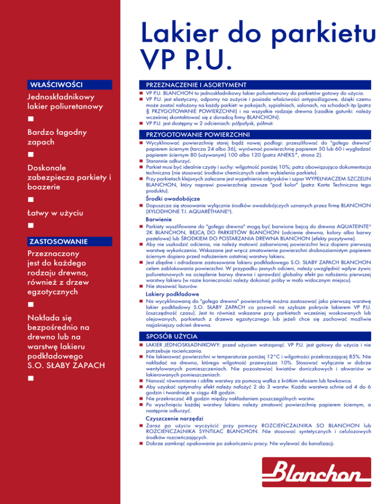 Lakier do parkietu VP P.U. WŁAŚCIWOŚCI Jednoskładnikowy lakier poliuretanowy PRZEZNACZENIE I ASORTYMENT n VP P.U. BLANCHON to jednoskładnikowy lakier poliuretanowy do parkietów gotowy do użycia. n VP P.U. jest elastyczny, odporny na zużycie i posiada właściwości antypoślizgowe, dzięki czemu n może zostać nałożony na każdy parkiet: w pokojach, sypialniach, salonach, na schodach itp (patrz § PRZYGOTOWANIE POWIERZCHNI) i na wszystkie rodzaje drewna (rzadkie gatunki: należy wcześniej skontaktować się z doradcą firmy BLANCHON). n VP P.U. jest dostępny w 2 odcieniach: półpołysk, półmat. Bardzo łagodny zapach n Wycyklinować powierzchnię starej bądź nowej podłogi: przeszlifować do "gołego drewna" n Doskonale zabezpiecza parkiety i boazerie n PRZYGOTOWANIE POWIERZCHNI papierem ściernym (tarcza 24 albo 36), wyrównać powierzchnię papierem 50 lub 60 i wygładzać papierem ściernym 80 (używanym) 100 albo 120 (patrz ANEKS*, strona 2). n Starannie odkurzyć. n Parkiet musi być idealnie czysty i suchy: wilgotność poniżej 10%; patrz obowiązująca dokumentacja techniczna (nie stosować środków chemicznych celem wybielenia parkietu). n Przy parkietach klejonych zalecane jest wypełnienie odprysków i szpar WYPEŁNIACZEM SZCZELIN BLANCHON, który naprawi powierzchnię zawsze "pod kolor" (patrz Karta Techniczna tego produktu). Środki owadobójcze n Dopuszcza się stosowanie wyłącznie środków owadobójczych uznanych przez firmę BLANCHON (XYLODHONE T.I. AQUARÉTHANE®). Łatwy w użyciu n ZASTOSOWANIE Przeznaczony jest do każdego rodzaju drewna, również z drzew egzotycznych Barwienie n Parkiety wyszlifowane do "gołego drewna" mogą być barwione bejcą do drewna AQUATEINTE® 2K BLANCHON, BEJCĄ DO PARKIETÓW BLANCHON (odcienie drewna, kolory albo barwy pastelowe) lub ŚRODKIEM DO POSTARZANIA DREWNA BLANCHON (efekty pozytywne). n Aby nie uszkodzić odcienia, nie należy matowić zabarwionej powierzchni lecz dopiero pierwszą warstwę wykończenia. Wskazane jest wręcz zmatowienie powierzchni drobnoziarnistym papierem ściernym dopiero przed nałożeniem ostatniej warstwy lakieru. n Jest zbędne i odradzane zastosowanie lakieru podkładowego S.O. SŁABY ZAPACH BLANCHON celem zablokowania powierzchni. W przypadku jasnych odcieni, należy uwzględnić wpływ żywic poliuretanowych na ocieplenie barwy drewna i sprawdzić globalny efekt po nałożeniu pierwszej warstwy lakieru (w razie konieczności należy dokonać próby w mało widocznym miejscu). n Nie stosować lazurów. n n Na wycyklinowaną do "gołego drewna" powierzchnię można zastosować jako pierwszą warstwę Nakłada się bezpośrednio na drewno lub na warstwę lakieru podkładowego S.O. SŁABY ZAPACH n LAKIER JEDNOSKŁADNIKOWY: przed użyciem wstrząsnąć. VP P.U. jest gotowy do użycia i nie n Lakiery podkładowe lakier podkładowy S.O. SŁABY ZAPACH co pozwoli na szybsze pokrycie lakierem VP P.U. (oszczędność czasu). Jest to również wskazane przy parkietach wcześniej woskowanych lub olejowanych, parkietach z drzewa egzotycznego lub jeżeli chce się zachować możliwie najjaśniejszy odcień drewna. SPOSÓB UŻYCIA potrzebuje rocieńczania. n Nie lakierować powierzchni w temperaturze poniżej 12°C i wilgotności przekraczającej 85%. Nie n n n n nakładać na drewno, którego wilgotność przewyższa 10%. Stosować wyłącznie w dobrze wentylowanych pomieszczeniach. Nie pozostawiać kwiatów doniczkowych i akwariów w lakierowanych pomieszczeniach. Nanosić równomierne i obfite warstwy za pomocą wałka z krótkim włosiem lub ławkowca. Aby uzyskać optymalny efekt należy nałożyć 2 do 3 warstw. Każda warstwa schnie od 4 do 6 godzin i twardnieje w ciągu 48 godzin. Nie przekraczać 48 godzin między nakładaniem poszczególnych warstw. Po wyschnięciu każdej warstwy lakieru należy zmatowić powierzchnię papierem ściernym, a następnie odkurzyć. Czyszczenie narzędzi n Zaraz po użyciu wyczyścić przy pomocy ROZCIEŃCZALNIKA SO BLANCHON lub ROZCIEŃCZALNIKA SYNTILAC BLANCHON. Nie stosować syntetycznych i celulozowych środków rozcieńczających. n Dobrze zamknąć opakowanie po zakończeniu pracy. Nie wylewać do kanalizacji. Lakier do parkietu VP P.U. n n n n n n SCHNIĘCIE I UTWARDZANIE Pyłosuchość: około 30 do 40 minut. Schnięcie "matowienie/pokrywanie": 4 do 6 godzin w normalnych warunkach. Nie przekraczać 48 godzin między nakładaniem poszczególnych warstw. Całkowite utwardzenie: 8 do 10 dni. Umiarkowany ruch w pomieszczeniu: po 24 godzinach. Użytkowanie pomieszczeń: w ciągu pierwszych dni zachować kilka środków ostrożności. Przez pierwsze 10 dni nie przykrywać (np. foliami ochronnymi) i nie układać dywanów na polakierowanym parkiecie. n Następnie: umieścić odpowiednie zabezpieczenia (z filcu) pod nogami krzeseł i stołów. Jeśli to konieczne, przy wejściu do pomieszczenia umieścić wycieraczkę, która zatrzyma kurz i żwir. Nie dopuścić do rozlewania wody i innych cieczy na polakierowanej powierzchni (dobrze zabezpieczyć doniczki). WYDAJNOŚĆ n 10 do 12 m2 z 1L na jedną warstwę. CODZIENNA PIELĘGNACJA n VP P.U. ułatwia późniejszą pielęgnację drewnianych parkietów. n Odkurzać regularnie przy użyciu odkurzacza albo miotły. n Od czasu do czasu, przetrzeć na mokro, dobrze odciśniętymi i nigdy nie ociekającymi narzędziami. Miejscowe zabrudzenia n n n n i plamy można z łatwością usunąć używając środków LAGOON® BLANCHON, PROTEKTOR BLANCHON albo neutralnego detergentu (w normalnym stężeniu). Ważne: pierwsze czyszczenie dopiero po upływie 10 dni, po dokładnym wyschnięciu lakieru. Odradzane są: monoszlifierka, miotła z włosem, emulsje woskowe, woski itd., tzn. wszystkie produkty i narzędzia mogące nadać połysk i powodować poślizg. Parkiety polakierowane lakierem VP P.U. i poddane dużemu natężeniu ruchu, będą konserwowane środkami MÉTAMAT® BLANCHON, METALIZATOR BLANCHON, PROTEKTOR i LISABR