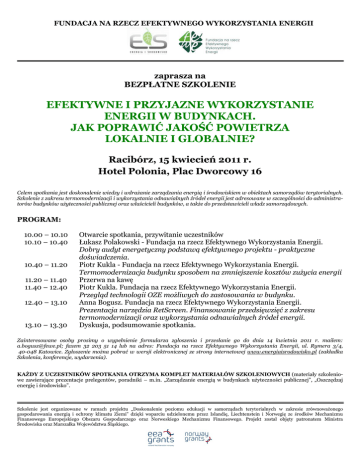 FUNDACJA NA RZECZ EFEKTYWNEGO WYKORZYSTANIA ENERGII zaprasza na BEZPŁATNE SZKOLENIE EFEKTYWNE I PRZYJAZNE WYKORZYSTANIE ENERGII W BUDYNKACH. JAK POPRAWIĆ JAKOŚĆ POWIETRZA LOKALNIE I GLOBALNIE? Racibórz, 15 kwiecień 2011 r. Hotel Polonia, Plac Dworcowy 16 Celem spotkania jest doskonalenie wiedzy i wdrażanie zarządzania energią i środowiskiem w obiektach samorządów terytorialnych. Szkolenie z zakresu termomodernizacji i wykorzystania odnawialnych źródeł energii jest adresowane w szczególności do administratorów budynków użyteczności publicznej oraz właścicieli budynków, a także do przedstawicieli władz samorządowych. PROGRAM: 10.00 – 10.10 10.10 – 10.40 10.40 – 11.20 11.20 – 11.40 11.40 – 12.40 12.40 – 13.10 13.10 – 13.30 Otwarcie spotkania, przywitanie uczestników Łukasz Polakowski - Fundacja na rzecz Efektywnego Wykorzystania Energii. Dobry audyt energetyczny podstawą efektywnego projektu - praktyczne doświadczenia. Piotr Kukla - Fundacja na rzecz Efektywnego Wykorzystania Energii. Termomodernizacja budynku sposobem na zmniejszenie kosztów zużycia energii Przerwa na kawę Piotr Kukla. Fundacja na rzecz Efektywnego Wykorzystania Energii. Przegląd technologii OZE możliwych do zastosowania w budynku. Anna Bogusz. Fundacja na rzecz Efektywnego Wykorzystania Energii. Prezentacja narzędzia RetScreen. Finansowanie przedsięwzięć z zakresu termomodernizacji oraz wykorzystania odnawialnych źródeł energii. Dyskusja, podsumowanie spotkania. Zainteresowane osoby prosimy o wypełnienie formularza zgłoszenia i przesłanie go do dnia 14 kwietnia 2011 r. mailem: [email protected]; faxem 32 203 51 14 lub na adres: Fundacja na rzecz Efektywnego Wykorzystania Energii, ul. Rymera 3/4, 40-048 Katowice. Zgłoszenie można pobrać w wersji elektronicznej ze strony internetowej www.energiaisrodowisko.pl (zakładka Szkolenia, konferencje, wydarzenia). KAŻDY Z UCZESTNIKÓW SPOTKANIA OTRZYMA KOMPLET MATERIAŁÓW SZKOLENIOWYCH (materiały szkoleniowe zawierające prezentacje prelegentów, poradniki – m.in. „Zarządzanie energią w budynkach użyteczności publicznej”, „Oszczędzaj energię i środowisko”. Szkolenie jest organizowane w ramach projektu „Doskonalenie poziomu edukacji w samorządach terytorialnych w zakresie zrównoważonego gospodarowania energią i ochrony klimatu Ziemi” dzięki wsparciu udzielonemu przez Islandię, Liechtenstein i Norwegię ze środków Mechanizmu Finansowego Europejskiego Obszaru Gospodarczego oraz Norweskiego Mechanizmu Finansowego. Projekt został objęty patronatem Ministra Środowiska oraz Marszałka Województwa Śląskiego.