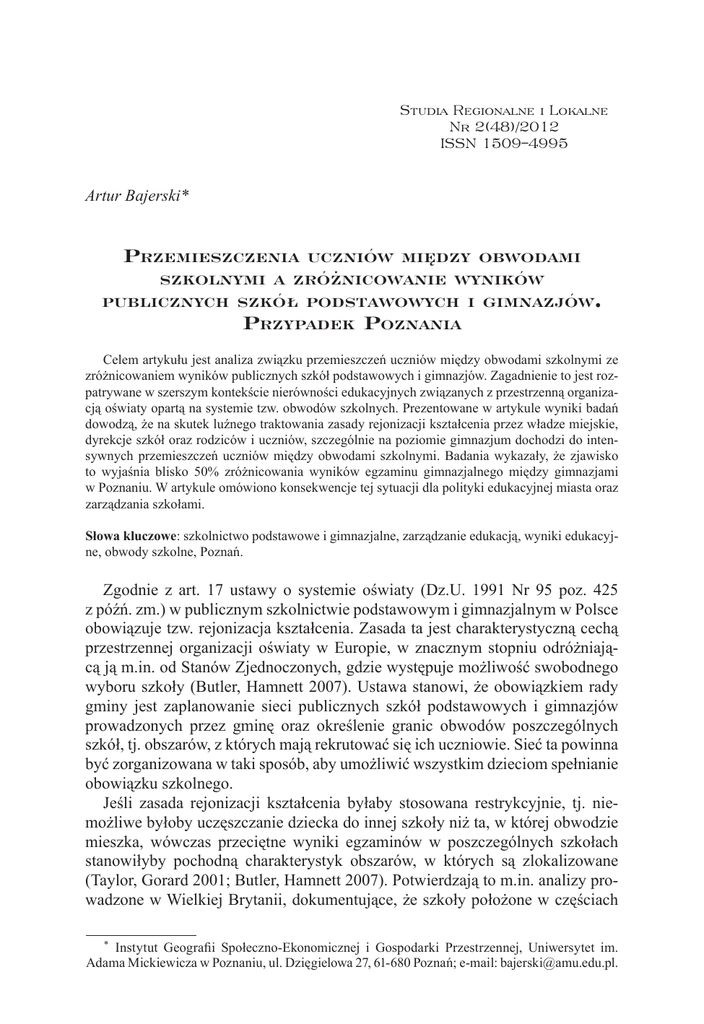 Studia Regionalne i Lokalne Nr 2(48)/2012 ISSN 1509–4995 Artur Bajerski* Przemieszczenia uczniów między obwodami szkolnymi a zróżnicowanie wyników publicznych szkół podstawowych i gimnazjów. Przypadek Poznania Celem artykułu jest analiza związku przemieszczeń uczniów między obwodami szkolnymi ze zróżnicowaniem wyników publicznych szkół podstawowych i gimnazjów. Zagadnienie to jest rozpatrywane w szerszym kontekście nierówności edukacyjnych związanych z przestrzenną organizacją oświaty opartą na systemie tzw. obwodów szkolnych. Prezentowane w artykule wyniki badań dowodzą, że na skutek luźnego traktowania zasady rejonizacji kształcenia przez władze miejskie, dyrekcje szkół oraz rodziców i uczniów, szczególnie na poziomie gimnazjum dochodzi do intensywnych przemieszczeń uczniów między obwodami szkolnymi. Badania wykazały, że zjawisko to wyjaśnia blisko 50% zróżnicowania wyników egzaminu gimnazjalnego między gimnazjami w Poznaniu. W artykule omówiono konsekwencje tej sytuacji dla polityki edukacyjnej miasta oraz zarządzania szkołami. Słowa kluczowe: szkolnictwo podstawowe i gimnazjalne, zarządzanie edukacją, wyniki edukacyjne, obwody szkolne, Poznań. Zgodnie z art. 17 ustawy o systemie oświaty (Dz.U. 1991 Nr 95 poz. 425 z późń. zm.) w publicznym szkolnictwie podstawowym i gimnazjalnym w Polsce obowiązuje tzw. rejonizacja kształcenia. Zasada ta jest charakterystyczną cechą przestrzennej organizacji oświaty w Europie, w znacznym stopniu odróżniającą ją m.in. od Stanów Zjednoczonych, gdzie występuje możliwość swobodnego wyboru szkoły (Butler, Hamnett 2007). Ustawa stanowi, że obowiązkiem rady gminy jest zaplanowanie sieci publicznych szkół podstawowych i gimnazjów prowadzonych przez gminę oraz określenie granic obwodów poszczególnych szkół, tj. obszarów, z których mają rekrutować się ich uczniowie. Sieć ta powinna być zorganizowana w taki sposób, aby umożliwić wszystkim dzieciom spełnianie obowiązku szkolnego. Jeśli zasada rejonizacji kształcenia byłaby stosowana restrykcyjnie, tj. niemożliwe byłoby uczęszczanie dziecka do innej szkoły niż ta, w której obwodzie mieszka, wówczas przeciętne wyniki egzaminów w poszczególnych szkołach stanowiłyby pochodną charakterystyk obszarów, w których są zlokalizowane (Taylor, Gorard 2001; Butler, Hamnett 2007). Potwierdzają to m.in. analizy prowadzone w Wielkiej Brytanii, dokumentujące, że szkoły położone w częściach * Instytut Geografii Społeczno-Ekonomicznej i Gospodarki Przestrzennej, Uniwersytet im. Adama Mickiewicza w Poznaniu, ul. Dzięgielowa 27, 61-680 Poznań; e-mail: [email protected]. Przemieszczenia uczniów między obwodami szkolnymi… 63 miast zamieszkanych przez klasę średnią cechują wyższe wyniki edukacyjne niż przeciętna (Butler i Hamnett 2007; Noreisch 2007b), jak również realizowane w Polsce badania nad zróżnicowaniem wyników sprawdzianu szóstoklasistów i egzaminu gimnazjalnego między gminami. Jak wynika m.in. z badań Jerzego Bańskiego i współpracowników (2002) oraz Przemysława Śleszyńskiego (2003), czynnikami społeczno-ekonomicznymi, które w największym stopniu wpływają na wyniki edukacyjne szkół podstawowych i gimnazjów, są kolejno: poziom wykształcenia, stopa bezrobocia oraz przeciętne dochody na danym obszarze. W przypadku restrykcyjnego przestrzegania zasady, zgodnie z którą szkoła kształci tylko uczniów zamieszkałych w jej obwodzie, jedyną formalną możliwością rodziców, by posłać dziecko do wybranej szkoły w innym obwodzie, jest przeprowadzka do niego (Croft 2004; Noreish 2007a). Ze względu na znaczenie wyboru szkoły rodzice uciekają się często do rozwiązań mających na celu „ominięcie” systemu. Do patologii, znanych choćby z Londynu i Berlina, należą m.in.: podawanie fałszywego adresu zamieszkania w obwodzie szkoły, wynajmowanie w nim mieszkania na czas naboru do szkoły oraz zameldowanie jednego z rodziców wraz z dzieckiem u kogoś z rodziny lub znajomych mieszkających w obwodzie docelowej szkoły (van Zanten 2002; Butler, Hamnett 2007; Noreisch 2007a, b). W systemie organizacji edukacji publicznej w Polsce zasada rejonizacji kształcenia nie jest jednak stosowana restrykcyjnie – rodzice dziecka mogą posłać je do innej publicznej szkoły podstawowej lub gimnazjum niż te, w których obwodzie zamieszkują. W takim przypadku jedynym formalnym wymaganiem jest zgoda placówki przyjmującej dziecko. Zgoda taka jest często udzielana. Wiąże się to m.in. z rozliczaniem przez kuratoria oraz władze gminne dyrektorów z osiągnięć edukacyjnych szkół oraz z naciskiem władz gminnych na szkoły, aby minimalizować koszty kształcenia. Pierwsze prowadzi do zabiegania przez dyrekcje szkół o uczniów zdolnych (zob. Dolata 2008), drugie zaś do zabiegania o jak największe oddziały szkolne, co przekłada się na obniżenie jednostkowych kosztów kształcenia1. Nierestrykcyjne traktowanie zasady rejonizacji przez władze gminne, dyrekcje szkolne oraz rodziców prowadzi do powstania quasi-rynku edukacyjnego, na którym dla rodziców rzeczywistą alternatywą dla wyboru lokalnej szkoły publicznej jest wybór innej szkoły publicznej położonej w innej części miasta. Dbałość części rodziców o jak najlepszą edukację dla swoich dzieci przez wybór odpowiedniej szkoły oraz konkurencja między dyrektorami szkół o przyciągnięcie jak największej liczby jak najlepszych uczniów mogą prowadzić do coraz silniejszego różnicowania się wyników szkół podstawowych i gimnazjów (tj. coraz wyraźniejszego podziału na szkoły „dobre” i „słabe”). Powyższe zagadnienie wiąże się bezpośrednio z kwestią podziału klasowego społeczeństwa. Już w badaniach prowadzonych w latach sześćdziesiątych i sie1 Jest to szczególnie istotne w sytuacji, gdy subwencja oświatowa pokrywa zazwyczaj od 50 do 75% kosztów funkcjonowani