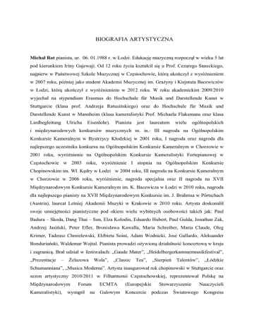 BIOGRAFIA ARTYSTYCZNA Michał Rot pianista, ur. 06. 01.1988 r. w Łodzi. Edukację muzyczną rozpoczął w wieku 5 lat pod kierunkiem Iriny Gajewaji. Od 12 roku życia kształcił się u Prof. Cezarego Saneckiego, najpierw w Państwowej Szkole Muzycznej w Częstochowie, którą ukończył z wyróżnieniem w 2007 roku, później jako student Akademii Muzycznej im. Grażyny i Kiejstuta Bacewiczów w Łodzi, którą ukończył z wyróżnieniem w 2012 roku. W roku akademickim 2009/2010 wyjechał na stypendium Erasmus do Hochschule für Musik und Darstellende Kunst w Stuttgarcie (klasa prof. Andrzeja Ratusińskiego) oraz do Hochschule für Musik und Darstellende Kunst w Mannheim (klasa kameralistyki Prof. Michaela Flaksmana oraz klasa Liedbegleitung Ulricha Eisenlohr). Pianista jest laureatem wielu ogólnopolskich i międzynarodowych konkursów muzycznych m. in.: III nagroda na Ogólnopolskim Konkursie Kameralnym w Bystrzycy Kłodzkiej w 2001 roku, I nagroda oraz nagroda dla najlepszego uczestnika konkursu na Ogólnopolskim Konkursie Kameralnym w Chorzowie w 2001 roku, wyróżnienie na Ogólnopolskim Konkursie Kameralistyki Fortepianowej w Częstochowie w 2003 roku, wyróżnienie I stopnia na Ogólnopolskim Konkursie Chopinowskim im. Wł. Kędry w Łodzi w 2004 roku, III nagroda na Konkursie Kameralnym w Chorzowie w 2006 roku, wyróżnienie, nagroda specjalna oraz II nagroda na XVII Międzynarodowym Konkursie Kameralnym im. K. Bacewicza w Łodzi w 2010 roku, nagroda dla najlepszego pianisty na XVII Międzynarodowym Konkursie im. J. Brahmsa w Pörtschach (Austria), laureat Letniej Akademii Muzyki w Krakowie w 2010 roku. Artysta doskonalił swoje umiejętności pianistyczne pod okiem wielu wybitnych osobowości takich jak: Paul Badura – Skoda, Dang Thai – Son, Elza Kolodin, Eduardo Hubert, Paul Gulda, Jonathan Zak, Andrzej Jasiński, Peter Efler, Bronisława Kawalla, Maria Schreiber, Maria Claude, Oleg Krimer, Tadeusz Chmielewski, Elżbieta Soini, Adam Wodnicki, Jose Gallardo, Aleksander Bonduriański, Waldemar Wojtal. Pianista prowadzi ożywioną działalność koncertową w kraju i zagranicą. Brał udział w festiwalach: „Gaude Mater”, „Heidelbergerkammermusikfestival”, „Prezentacje – Żelazowa Wola”, „Classic Tea”, „Sierpień Talentów”, „Łódzkie Schumanniana”, „Musica Moderna”. Artysta inaugurował rok chopinowski w Stuttgarcie oraz sezon artystyczny 2010/2011 w Filharmonii Częstochowskiej, reprezentował Polskę na Międzynarodowym Kameralistyki), Forum wystąpił na ECMTA (Europejskie Galowym Koncercie Stowarzyszenie podczas Światowego Nauczycieli Kongresu Częstochowian oraz prestiżowym koncercie Preisträgerkonzert w Mannheim, dał recital w Schloss Seefeld oraz cykl koncertów w Pfortzheim, występował również wielokrotnie w krakowskiej „Floriance” oraz w domu Szymanowskiego „Atma” w Zakopanem. Występował również z Orkiestrą Leopoldinum wykonując Kantatę „św. Mikołaj” we Wrocławskiej Filharmonii. Pianista współpracował z wybitnymi muzykami takimi jak: Jerzy Salwarowski, Tomasz Daroch, Jerzy Swoboda, Tomasz Chmiel, Stanisław Kierner, Szymon Komasa, Andrzej Kosendiak, Jarosław Bodakowski. W 2008 roku założył dwa zespoły: duet z wiolonczelistą Krzysztofem Karpetą (Reger Duo) oraz Liedduo z żoną Joanną Rot. Od 2010 roku współtworzy również trio fortepianowe ze skrzypaczką Patrycją Słomczyńską oraz wiolonczelistą Krzysztofem Karpetą. Od 2011 roku kształci się pod okiem światowej sławy śpiewaka – kameralisty Olafa Bära. Jest dwukrotnym stypendystą Prezydenta Miasta Częstochowy oraz Ministra Kultury i Dziedzictwa Narodowego Bogdana Zdrojewskiego. Obecnie jest zatrudniony na stanowisku asystenta w Katedrze Kameralistyki Fortepianowej na Łódzkiej Akademii Muzycznej.
