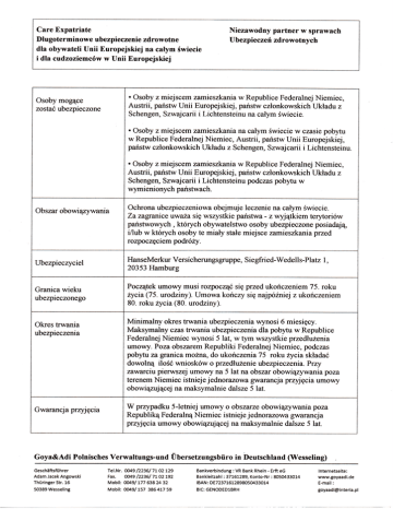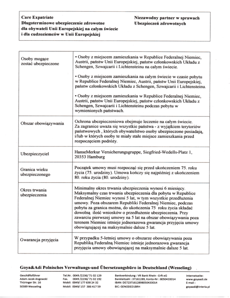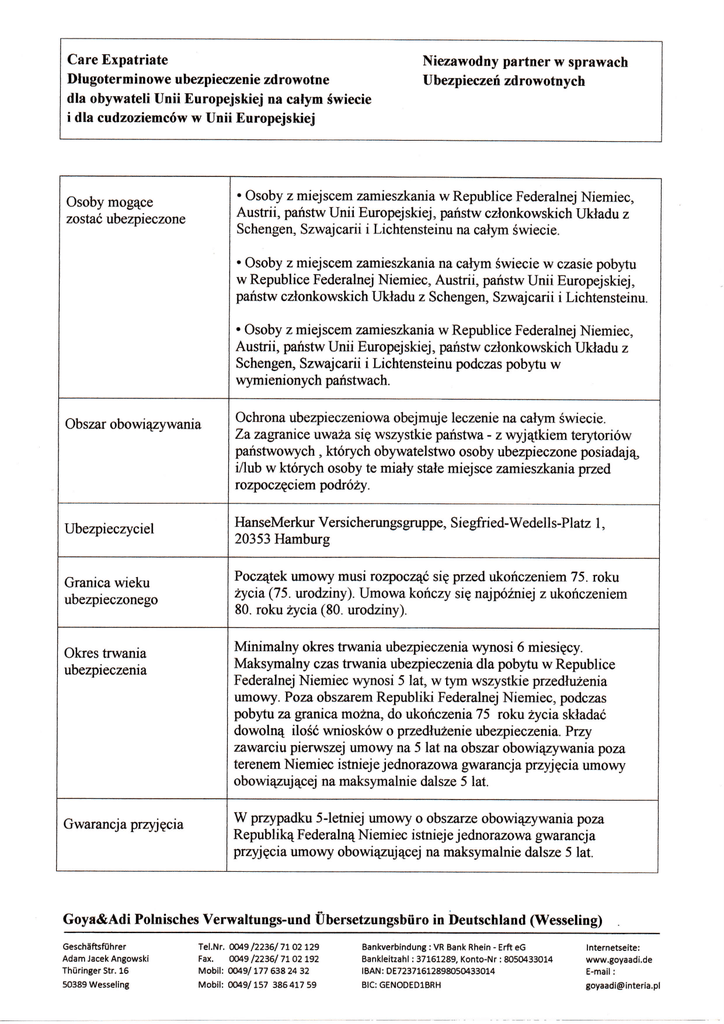 Care Expatriate Dlugoterminowe ubezpieczenie zdrowotne dla obywateli Unii Europejskiej na calym swiecie i dla cudzoziemcow w Unii Europejskiej Niezawodny partner w sprawach Ubezpieczen zdrowotnych • Osoby z miej seem zamieszkania w Republice Federalnej Niemiec, Austrii, paristw Unii Europejskiej, pahstw czlonkowskich Ukladu z Schengen, Szwajcarii i Lichtensteinu na calym swiecie. Osoby mog^ce zostac ubezpieczone • Osoby z miejscem zamieszkania na calym swiecie w czasie pobytu w Republice Federalnej Niemiec, Austrii, panstw Unii Europejskiej, panstw czlonkowskich Ukladu z Schengen, Szwajcarii i Lichtensteinu. • Osoby z miejscem zamieszkania w Republice Federalnej Niemiec, Austrii, panstw Unii Europejskiej, panstw czlonkowskich Ukladu z Schengen, Szwajcarii i Lichtensteinu podczas pobytu w wymienionych pahstwach. Obszar obowi^zy wania Ochrona ubezpieczeniowa obejmuje leczenie na carym swiecie. Za zagranice uwaza si? wszystkie paristwa - z wyjatkiem terytoriow pahstwowych, ktorych obywatelstwo osoby ubezpieczone posiadaja^ i/lub w ktorych osoby te mialy stale miejsce zamieszkania przed rozpoczeciem podrozy. Ubezpieczyciel HanseMerkur Versicherungsgruppe, Siegfried-Wedells-Platz 1, 20353 Hamburg Granica wieku ubezpieczonego Poczatek umowy musi rozpoczac si? przed ukonczeniem 75. roku zycia (75. urodziny). Umowa kohczy si? najpozniej z ukonczeniem 80. roku zycia (80. urodziny). Minimalny okres trwania ubezpieczenia wynosi 6 miesiecy. Maksymalny czas trwania ubezpieczenia dla pobytu w Republice Federalnej Niemiec wynosi 5 lat, w tym wszystkie przedluzenia umowy. Poza obszarem Republiki Federalnej Niemiec, podczas pobytu za granica mozna, do ukohczenia 75 roku zycia skladac dowolnq. ilosc wnioskow o przedluzenie ubezpieczenia. Przy zawarciu pierwszej umowy na 5 lat na obszar obowi^zywania poza terenem Niemiec istnieje jednorazowa gwarancja przyjecia umowy 0b0wia.zuj3.cej na maksymalnie dalsze 5 lat. Okres trwania ubezpieczenia W przypadku 5-letniej umowy o obszarze obowi^zywania poza Republika. Federaln^. Niemiec istnieje jednorazowa gwarancja przyjecia umowy obowi^zuj^cej na maksymalnie dalsze 5 lat. Gwarancja przyjecia Goya&Adi Polnisches Verwaltungs-und Ubersetzungsbiiro in Deutschland (Wesseling) Geschaftsfuhrer Adam Jacek Angowski Thuringer Str. 16 50389 Wesseling Tel.Nr. Fax. Mobil: Mobil: 0049 /2236/ 71 02 129 0049/2236/7102192 0049/ 177 638 24 32 0049/157 386417 59 Bankverbindung : VR Bank Rhein - Erft eG Bankleitzahl: 37161289, Konto-Nr: 8050433014 I BAN: DE72371612898050433014 BIC: GENODED1BRH Internetseite: www.goyaadi.de E-mail: [email protected]