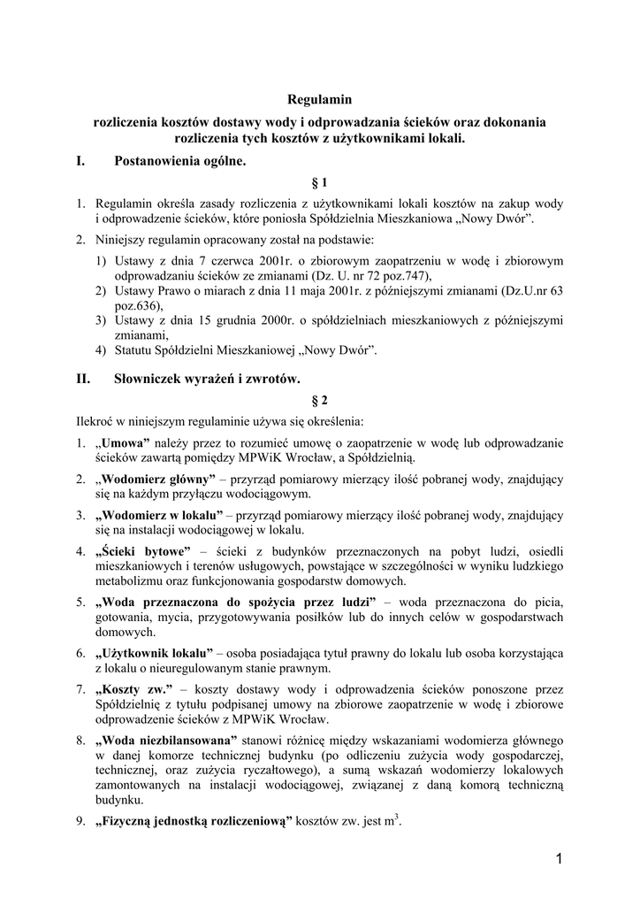 Regulamin rozliczenia kosztów dostawy wody i odprowadzania ścieków oraz dokonania rozliczenia tych kosztów z użytkownikami lokali. I. Postanowienia ogólne. §1 1. Regulamin określa zasady rozliczenia z użytkownikami lokali kosztów na zakup wody i odprowadzenie ścieków, które poniosła Spółdzielnia Mieszkaniowa „Nowy Dwór”. 2. Niniejszy regulamin opracowany został na podstawie: 1) Ustawy z dnia 7 czerwca 2001r. o zbiorowym zaopatrzeniu w wodę i zbiorowym odprowadzaniu ścieków ze zmianami (Dz. U. nr 72 poz.747), 2) Ustawy Prawo o miarach z dnia 11 maja 2001r. z późniejszymi zmianami (Dz.U.nr 63 poz.636), 3) Ustawy z dnia 15 grudnia 2000r. o spółdzielniach mieszkaniowych z późniejszymi zmianami, 4) Statutu Spółdzielni Mieszkaniowej „Nowy Dwór”. II. Słowniczek wyrażeń i zwrotów. §2 Ilekroć w niniejszym regulaminie używa się określenia: 1. „Umowa” należy przez to rozumieć umowę o zaopatrzenie w wodę lub odprowadzanie ścieków zawartą pomiędzy MPWiK Wrocław, a Spółdzielnią. 2. „Wodomierz główny” – przyrząd pomiarowy mierzący ilość pobranej wody, znajdujący się na każdym przyłączu wodociągowym. 3. „Wodomierz w lokalu” – przyrząd pomiarowy mierzący ilość pobranej wody, znajdujący się na instalacji wodociągowej w lokalu. 4. „Ścieki bytowe” – ścieki z budynków przeznaczonych na pobyt ludzi, osiedli mieszkaniowych i terenów usługowych, powstające w szczególności w wyniku ludzkiego metabolizmu oraz funkcjonowania gospodarstw domowych. 5. „Woda przeznaczona do spożycia przez ludzi” – woda przeznaczona do picia, gotowania, mycia, przygotowywania posiłków lub do innych celów w gospodarstwach domowych. 6. „Użytkownik lokalu” – osoba posiadająca tytuł prawny do lokalu lub osoba korzystająca z lokalu o nieuregulowanym stanie prawnym. 7. „Koszty zw.” – koszty dostawy wody i odprowadzenia ścieków ponoszone przez Spółdzielnię z tytułu podpisanej umowy na zbiorowe zaopatrzenie w wodę i zbiorowe odprowadzenie ścieków z MPWiK Wrocław. 8. „Woda niezbilansowana” stanowi różnicę między wskazaniami wodomierza głównego w danej komorze technicznej budynku (po odliczeniu zużycia wody gospodarczej, technicznej, oraz zużycia ryczałtowego), a sumą wskazań wodomierzy lokalowych zamontowanych na instalacji wodociągowej, związanej z daną komorą techniczną budynku. 9. „Fizyczną jednostką rozliczeniową” kosztów zw. jest m3. 1 III. Rozliczanie kosztów dostawy wody i odprowadzania ścieków do budynków. §3 1. Koszty dostawy wody i odprowadzania ścieków – koszty zw. ewidencjonuje się i rozlicza się indywidualnie według wskazań wodomierzy głównych zainstalowanych w komorach technicznych na podstawie określonych w taryfach MPWiK Wrocław cen i stawek opłat. 2. Do kosztów dostawy zw. nie mogą być zaliczane koszty utrzymania wewnętrznych instalacji wodociągowo – kanalizacyjnych. 3. Koszty, o których mowa w ust.2 zalicza się do kosztów remontu. §4 Na koszty zw. składają się następujące składniki: 1. opłata za dostawę wody stanowiąca iloczyn dostarczonej wody ustalony na podstawie wskazań wodomierza głównego i ceny jednostkowej za wodę [zł/m3], 2. opłata za odbiór ścieków stanowiąca iloczyn dostarczonej wody ustalony na podstawie wskazań wodomierza głównego i ceny jednostkowej za odbiór ścieków[zł/m3] przyjmując, że 1 m³ zużytej wody odpowiada 1 m³ odprowadzanych ścieków. §5 Pomiędzy użytkowników lokali koszty zw. rozlicza się: 1. na podstawie wskazań wodomierzy zainstalowanych w lokalach, 2. na podstawie ryczałtu, którego wysokość określa „Rozporządzenie Ministra Infrastruktury z dnia 14.01.2002r. w sprawie określenia przeciętnych norm zużycia wody – Dz. U. nr 8, poz. 70 z 2002 r. §6 Rozliczenie kosztów zw. przeprowadza się w okresach: 1. półrocznych – dla lokali mieszkalnych, posiadających wodomierze w terminie 30 dni od daty dokonania odczytu, 2. miesięcznych – dla lokali użytkowych, posiadających wodomierze. IV. Zasady rozliczania użytkowników lokali z kosztów zw.. §7 1. Podstawą do rozliczania kosztów zw. według wskazań wodomierzy indywidualnych jest podpisanie przez użytkownika lokalu protokołu odbioru instalacji wodomierzy. 2. Koszty zw. pokrywane są przez użytkowników lokali w formie zaliczek miesięcznych, obliczanych, jako iloczyn indywidualnej normy zużycia wody ustalonej na okres 6 miesięcy oraz stawki za 1 m³ wody i odprowadzania ścieków powiększony o współczynnik korygujący zużycie wody z tytułu wody niezbilansowanej, o którym mowa w § 9 z ostatnio rozliczanego półrocza. W przypadku niedostarczenia odczytu, zaliczki zostaną ustalone jw. na bazie rozliczenia z ostatniego roku. 3. Rozliczenie kosztów zw. następuje na podstawie rzeczywistych wskazań (odczytów), zainstalowanych wodomierzy, z uwzględnieniem współczynnika korygującego zużycie wody z tytułu wody niezbilansowanej rozliczanego półrocza, obliczonego dla danej komory technicznej budynku. 2 4. Do obliczeń ilości zużytej wody przyjmuje się pełne ilości m³, stosując dwa miejsca po przecinku. 5. Indywidualna norma zużycia zimnej wody ustalana jest w oparciu o rozliczenia wskazań wodomierzy za jeden poprzedni okres rozliczeniowy lub ustalona przez użytkownika lokalu na jego pisemny wniosek złożony w Spółdzielni. §8 1. Lokale mieszkalne niewyposażone w wodomierze, będą obciążane kosztami zw. w wysokości wynikającej z przemnożenia liczby osób zamieszkałych w danym lokalu przez miesięczną opłatę ryczałtową, wynikającą z iloczynu normy określonej w § 5 ust.2 i ceny jednostkowej określonej w § 4. 2. Rozliczenie kosztów zw. następuje na podstawie wyliczonej ilości wody określonej wg zużycia ryczałtowego z uwzględnieniem współczynnika korygującego zużycie wody z tytułu wody niezbilansowanej rozliczanego półrocza, obliczonego dla d