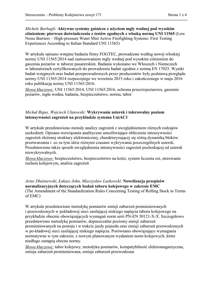 Streszczenia – Problemy Kolejnictwa zeszyt 171 Strona 1 z 4 Michele Barbagli: Aktywne systemy gaśnicze z użyciem mgły wodnej pod wysokim ciśnieniem: pierwsze doświadczenia z testów zgodnych z włoską normą UNI 11565 (Low Noise Barriers – High-pressure Water Mist Active Firefighting Systems: First Testing Experiences According to Italian Standard UNI 11565) W artykule opisano wstępne badania firmy FOGTEC, prowadzone według nowej włoskiej normy UNI 11565:2014 nad zastosowaniem mgły wodnej pod wysokim ciśnieniem do gaszenia pożarów w taborze pasażerskim. Badania wykonano we Włoszech i Niemczech w laboratoriach certyfikowanych do prowadzenia badań zgodnie z normą EN 17025. Wyniki badań wstępnych oraz badań przeprowadzonych przez producentów były podstawą przeglądu normy UNI 11565:2014 rozpoczętego we wrześniu 2015 roku i zakończonego w maju 2016 roku publikacją normy UNI 11565:2016. Słowa kluczowe: UNI 11565:2014, UNI 11565:2016, ochrona przeciwpożarowa, gaszenie pożarów, mgła wodna, badania, bezpieczeństwo, norma, tabor Michał Bigus, Wojciech Ulatowski: Wykrywanie usterek i tolerowalny poziom intensywności zagrożeń na przykładzie systemu UniAC1 W artykule przedstawiono metody analizy zagrożeń z uwzględnieniem różnych rodzajów uszkodzeń. Opisano rozwiązania analityczne umożliwiające obliczenie intensywności zagrożeń złożonej struktury elektronicznej, charakteryzującej się różną dynamiką bloków przetwarzania i co za tym idzie różnymi czasami wykrywania poszczególnych usterek. Przedstawiono także sposób uwzględnienia intensywności zagrożeń pochodzącej od usterek niewykrywalnych. Słowa kluczowe: bezpieczeństwo, bezpieczeństwo na kolei, system liczenia osi, sterowanie ruchem kolejowym, analiza zagrożeń Artur Dłużniewski, Łukasz John, Mieczysław Laskowski: Nowelizacja przepisów normalizacyjnych dotyczących badań taboru kolejowego w zakresie EMC (The Amendment of the Standardization Rules Concerning Testing of Rolling Stock in Terms of EMC) W artykule przedstawiono metodykę pomiarów emisji zaburzeń promieniowanych i przewodzonych w pokładowej sieci zasilającej niskiego napięcia taboru kolejowego na przykładzie obecnie obowiązujących wymagań norm serii PN-EN 50121-X-X. Szczegółowo przedstawiono metodykę pomiarów, dopuszczalne poziomy emisji zaburzeń promieniowanych na postoju i w trakcie jazdy pojazdu oraz emisji zaburzeń przewodzonych w po-kładowej sieci zasilającej niskiego napięcia. Porównano obowiązujące wymagania normatywne w tym zakresie, z nowym planowanym wydaniem norm kolejowych, które niedługo zastąpią obecne normy. Słowa kluczowe: tabor kolejowy, metodyka pomiarów, kompatybilność elektromagnetyczna, emisja zaburzeń promieniowana, emisja zaburzeń przewodzona Streszczenia – Problemy Kolejnictwa zeszyt 171 Strona 2 z 4 Dieter Hohenwarter: Doświadczenia zdobyte w testach palnościowych siedzeń przeprowadzonych zgodnie z normami EN 45 545-2 i DIN 5510-2 (Experience Gained from Fire Tests According to EN 45 545-2 and DIN 5510-2 for Testing of Seats) W artykule przedstawiono wyniki badań palności różnych produktów wykonanych zgodnie z normami ISO 5658-2 i ISO 5660-1. Szczegółowo przeanalizowano wyniki badań GFK (kompozyty poliestrowo-szklane). Stosując normy ISO 5658-2 i ISO 5660-1, poddano analizie zgodność z normami malowanie korpusów siedzeń, chociaż ta zgodność nie musi być analizowana według wymogów niemieckiej normy DIN 5510-2. Zaprezentowano różne możliwości zmniejszenia palności wagonów kolejowych, stwierdzając, że połączenie pianki z po-kryciem tekstylnym ma zasadnicze znaczenie. Słowa kluczowe: testy palnościowe materiałów i siedzeń używanych na kolei, testy palnościowe siedzeń tramwajowych Grzegorz Kiesiewicz, Tadeusz Knych, Paweł Kwaśniewski, Artur Rojek: Rozwój i badania nowych rozwiązań wyposażenia sieci elektrycznej (Development and Testing of New Solutions of Overhead Contact Line Accessories) Sieć trakcyjna (OCL) składa się z różnych konstrukcji i elementów nośnych, które umożliwiają instalację przewodu jezdnego poziomo w stosunku do toru. Sieć trakcyjna jest złożonym systemem mechanicznym i elektrycznym, który musi zapewnić właściwe przekazywanie energii elektrycznej do pojazdu trakcyjnego. W trakcie eksploatacji urządzeń sieci trakcyjnej (wysięgniki, wsporniki, urządzenia napinające itp.) pojawiają się różne problemy znacząco wpływające na ruch kolejowy. Ponadto przestarzałe konstrukcje utrudniają ich montaż i codzienną eksploatację. Przedstawiono wyniki badań, analizy numeryczne właściwości naprężeń, eksperymentalne wyniki relaksacji siły nacisku i odporności na korozję urządzeń sieci trakcyjnej w obecnie używanych urządzeniach. Opracowano koncepcję sieci trakcyjnej nowej generacji. Przeprowadzono badania rozkładu naprężeń i współczynnika bezpieczeństwa na konstrukcjach obciążonych eksploatacyjnie. Uzyskane wyniki pokazały, że obecnie używane urządzenia przy obciążeniu eksploatacyjnym pracują blisko granicy wytrzymałości materiału. Badane elementy miały również wady projektowe, niską odporność na korozję i odporność reologiczną na poziomie 8–10% stopnia relaksacji. Wykonane prace przeprowadzone w obciążeniu eksploatacyjnym wykazały, że nowo zaprojektowane elementy mają bezpieczny poziom naprężenia efektywnego i wysoki współczynnik bezpieczeństwa. Zaprojektowano, przetestowano i zbadano nowe rozwiązanie urządzenia naprężającego bez ciężarów naprężających. Siła naprężenia przewodu jezdnego i sieci trakcyjnej jest generowana przez spiralne sprężyny urządzenia. Użycie właściwie zaprojektowanych elementów – krzywek, pozwala uzyskać stałą siłę naprężającą przewodu jezdnego w całej długości przęsła naprężenia . Słowa kluczowe: sieć trakcyjna, przewód jezdny, urządzenia sieci trakcyjnej