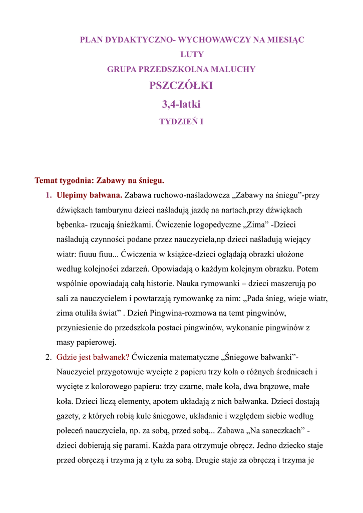PLAN DYDAKTYCZNO- WYCHOWAWCZY NA MIESIĄC LUTY GRUPA PRZEDSZKOLNA MALUCHY PSZCZÓŁKI 3,4-latki TYDZIEŃ I Temat tygodnia: Zabawy na śniegu. 1. Ulepimy bałwana. Zabawa ruchowo-naśladowcza „Zabawy na śniegu”-przy dźwiękach tamburynu dzieci naśladują jazdę na nartach,przy dźwiękach bębenka- rzucają śnieżkami. Ćwiczenie logopedyczne „Zima” -Dzieci naśladują czynności podane przez nauczyciela,np dzieci naśladują wiejący wiatr: fiuuu fiuu... Ćwiczenia w książce-dzieci oglądają obrazki ułożone według kolejności zdarzeń. Opowiadają o każdym kolejnym obrazku. Potem wspólnie opowiadają całą historie. Nauka rymowanki – dzieci maszerują po sali za nauczycielem i powtarzają rymowankę za nim: „Pada śnieg, wieje wiatr, zima otuliła świat” . Dzień Pingwina-rozmowa na temt pingwinów, przyniesienie do przedszkola postaci pingwinów, wykonanie pingwinów z masy papierowej. 2. Gdzie jest bałwanek? Ćwiczenia matematyczne „Śniegowe bałwanki”Nauczyciel przygotowuje wycięte z papieru trzy koła o różnych średnicach i wycięte z kolorowego papieru: trzy czarne, małe koła, dwa brązowe, małe koła. Dzieci liczą elementy, apotem układają z nich bałwanka. Dzieci dostają gazety, z których robią kule śniegowe, układanie i względem siebie według poleceń nauczyciela, np. za sobą, przed sobą... Zabawa „Na saneczkach” dzieci dobierają się parami. Każda para otrzymuje obręcz. Jedno dziecko staje przed obręczą i trzyma ją z tyłu za sobą. Drugie staje za obręczą i trzyma je przed sobą. Przy dźwiękach tamburynu dzieci „jadą na sankach” po całej sali. Ćwiczenia w książkach- oglądanie obrazków umieszczonych na dole strony. Nazywanie ich. Odszukanie: czapki,szalika, sanek i Lalusia na dużym obrazku. Ćwiczenia analizy i syntezy wzrokowej-Dzieci składają w całość podzielone na części obrazki: nart, sanek lub bałwana. Spacer: Gdzie jest bałwanek?dzieci podczas spaceru szukają śniegowych bałwanków. 3. Poleczka zimowa. Ćwiczenia dźwiękonaśladowcze- dzieci za nauczycielem naśladują odgłosy,np śniegu chrzęszczącego pod nogami- chrup, chrup... Zabawy przy piosence „Polaczka zimowa”-Dzieci biegają na palcach po sali przy melodii granej w wiolinie. Gdy usłyszą melodię graną na basie-chodzą po sali, uderzając całymi stopami w podłogę. Lepienie bałwana z plasteliny-dzieci z plasteliny lepią postać bałwana. Kółko plastyczne: Śniegowe bałwany i bałwanki- dzieci białą farbą lub pastą malują paluszkami postać bałwanka na kolorowych kartkach. Środki dydaktyczne: Piosenka „Poleczka zimowa” tamburyn, bębenek, rymowanka, książka,obrazki: nart, sanek bałwanka, obręcze, papierowe elementy bałwanka, nagranie rytmicznej melodii, gazety,plastelina,zagadki, obrazki: sanek bałwanka, nart, farby,pędzle, wiersz, klocki w kształcie figur, masa papierowa. Metody: czynne słowne oglądowe Opracowała: Milena Kryńska Dzień Pingwina Spacer Kółko plastyczne Opracowała: Milena Kryńska PLAN DYDAKTYCZNO- WYCHOWAWCZY NA MIESIĄC LUTY GRUPA PRZEDSZKOLNA MALUCHY PSZCZÓŁKI 3,4-latki TYDZIEŃ II Temat tygodnia: Zimo, baw się z nami! 1. Lubimy śnieg. Ćwiczenia ruchowo graficzne-dzieci za nauczycielem kreślą w powietrzu kształty kul śniegowych. Słuchanie wiersza S. Grabowskiego „Śnieg i dzieci”-dzieci słuchają wiersza i odpowiadają na pytania dotyczące wiersza, Ćwiczenia w kartach pracy -Kończenie rysowania bałwanków według wzoru. Zabawa orientacyjno-porządkowa „Uwaga! Zaspa!”-dzieci spacerują po sali. Na hasło „Uwaga! Zaspa!”-przeskakują zaspę. Światowy Dzień Nutelliwykonanie eko-nutelli oraz degustacja. 2. Zimowe zabawy. Ćwiczenia matematyczne „Zabawy z bałwankami” Nauczyciel przygotowuje sylwety bałwanków, różniące się ilością kul, nakryciami głowy i dodatkami. Dzieci liczą bałwanki,określają jak wygląda pierwszy, drugi...bałwanek. Zabawa orientacyjno-porządkowa „Bałwanki”Dzieci spacerują po sali. Na hasło „Duże bałwanki” dzieci stają na palcach i wyciągają ręce do góry, a gdy słyszą „Małe bałwanki”-wykonują przysiad. Ćwiczenia słuchowe-dzieci samodzielnie lub z pomocą nauczyciela dzielą na sylaby nazwy obrazków-rozwiązań zagadek.. Spacer: Lubimy śnieg. 3. Śniegowy bałwanki. Zabawa „Ale zimno! Ale mróz!”-dzieci maszerują po całej sali przy akompaniamencie bębenka. Na hasło”ale zimno”-zatrzymują się i ogrzewają zmarznięte ręce, pocierając nimi o siebie i chuchając na nie. Gdy usłyszą „ale mróz”- zatrzymują się i przeskakują w miejscu z nogi na nogę, rozgrzewając nogi na zimnym mrozie. Słuchanie piosenki „Zimowa wyliczanka”- słuchanie piosenki oraz rozmowa na jej temat. Zabawa przy piosence „Zimowa wyliczanka”-dzieci naśladują gestem słowa piosenki. 4. Kolorowe bałwanki. Ćwiczenia pantomimiczne „Co to za dyscyplina sportowa?” - Nauczyciel przygotowuje wycięte z gazet zdjęcia sportowców uprawiających sporty zimowe. Wymienia nazwiska znanych sportowców np. Adam Małysz. Chętne dzieci naśladują ruchem wybraną dyscyplinę sportową, a pozostałe osoby odgadują o jaką dyscyplinę chodzi. Ćwiczenia w książceOglądanie obrazków. Wskazywanie różnic pomiędzy nimi.. Zabawa orientacyjno-porządkowa „Bałwanki”-Dzieci spacerują po sali. Na hasło „Duże bałwanki” dzieci stają na palcach i wyciągają ręce do góry, a gdy słyszą „Małe bałwanki”-wykonują przysiad. Międzynarodowy Dzień Pizzyzaproszenie pizzermena i degustacja pizzy. 5. Zabawy na śniegu. Zabwa „Prawda to czy plotka?”-dzieci siedzą przed nauczycielem. Nauczyciel mówi zdania związane tematycznie z zimą. Gdy dzieci usłyszą zdanie prawdziwe- klaszczą, a gdy fałszywe- wstają na moment. Słuchanie opowiadania H. Zdzitowieckiej „Zabawy na śniegu”-słuchanie opowiadania i opdowiadanie na pytania dotyczące tekstu. Zabawa z rymowank