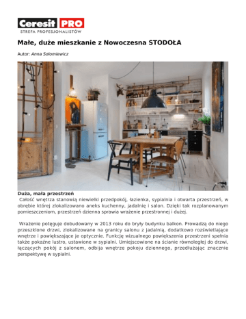 Małe, duże mieszkanie z Nowoczesna STODOŁA Autor: Anna Sołomiewicz Duża, mała przestrzeń Całość wnętrza stanowią niewielki przedpokój, łazienka, sypialnia i otwarta przestrzeń, w obrębie której zlokalizowano aneks kuchenny, jadalnię i salon. Dzięki tak rozplanowanym pomieszczeniom, przestrzeń dzienna sprawia wrażenie przestronnej i dużej. Wrażenie potęguje dobudowany w 2013 roku do bryły budynku balkon. Prowadzą do niego przeszklone drzwi, zlokalizowane na granicy salonu z jadalnią, dodatkowo rozświetlające wnętrze i powiększające je optycznie. Funkcję wizualnego powiększenia przestrzeni spełnia także pokaźne lustro, ustawione w sypialni. Umiejscowione na ścianie równoległej do drzwi, łączących pokój z salonem, odbija wnętrze pokoju dziennego, przedłużając znacznie perspektywę w sypialni. Wnętrze z duszą W mieszkaniu panuje przytulna, unikalna atmosfera. Wzorzyste dywany i kolorowe poduszki dekoracyjne nadają pomieszczeniom optymistycznego, domowego charakteru. Humorystycznym akcentem w aranżacji są obrazy z fikuśnym motywem… szympansa. Mieszanka różnych stylów wygląda efektownie na tle białych ścian i podłóg. Industrialna lampa w jadalni, widoczne przewody pod sufitem w kuchni kontrastują w interesujący sposób z drewnianymi, stylizowanymi meblami w jadalni i tradycyjnymi kaflami nad blatem kuchennym. Całość stwarza wrażenie wnętrza z duszą. Zerknij też na Pinterest oraz Facebook Foto: Alvhem Makleri & Interior / Fredrik J Karlsson, SE360 Autor: Anna Sołomiewicz, dobrzemieszkaj.pl Orygianalny artykuł znajdziesz na Nowoczesna STODOŁA © 2013 Henkel Polska sp. z o.o.