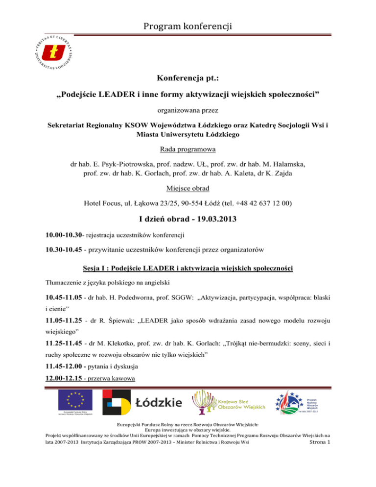 Program konferencji Konferencja pt.: „Podejście LEADER i inne formy aktywizacji wiejskich społeczności” organizowana przez Sekretariat Regionalny KSOW Województwa Łódzkiego oraz Katedrę Socjologii Wsi i Miasta Uniwersytetu Łódzkiego Rada programowa dr hab. E. Psyk-Piotrowska, prof. nadzw. UŁ, prof. zw. dr hab. M. Halamska, prof. zw. dr hab. K. Gorlach, prof. zw. dr hab. A. Kaleta, dr K. Zajda Miejsce obrad Hotel Focus, ul. Łąkowa 23/25, 90-554 Łódź (tel. +48 42 637 12 00) I dzień obrad - 19.03.2013 10.00-10.30- rejestracja uczestników konferencji 10.30-10.45 - przywitanie uczestników konferencji przez organizatorów Sesja I : Podejście LEADER i aktywizacja wiejskich społeczności Tłumaczenie z języka polskiego na angielski 10.45-11.05 - dr hab. H. Podedworna, prof. SGGW: „Aktywizacja, partycypacja, współpraca: blaski i cienie” 11.05-11.25 - dr R. Śpiewak: „LEADER jako sposób wdrażania zasad nowego modelu rozwoju wiejskiego” 11.25-11.45 - dr M. Klekotko, prof. zw. dr hab. K. Gorlach: „Trójkąt nie-bermudzki: sceny, sieci i ruchy społeczne w rozwoju obszarów nie tylko wiejskich” 11.45-12.00 - pytania i dyskusja 12.00-12.15 - przerwa kawowa Europejski Fundusz Rolny na rzecz Rozwoju Obszarów Wiejskich: Europa inwestująca w obszary wiejskie. Projekt współfinansowany ze środków Unii Europejskiej w ramach Pomocy Technicznej Programu Rozwoju Obszarów Wiejskich na lata 2007-2013 Instytucja Zarządzająca PROW 2007-2013 – Minister Rolnictwa i Rozwoju Wsi Strona 1 Program konferencji Sesja II : Podejście LEADER w krajach UE Tłumaczenie z języka angielskiego na polski 12.15-12.45 - prof. zw. dr hab. Marie-Claude Maurel, dr hab. Pascal Chevalier : “The LEADER programme in Central Europe: success or failure in transferring a model for local development” 12.45-13.15 - dr hab. Guillaume Lacquement: „Involvement of local stakeholders in LEADER (2007-2013) programme partnerships in Eastern Germany: network thinking and context effects” 13.15-13.45 - prof. zw. dr hab. Imre Kovach, mgr Bernadett Csurgó: ˮNetworking LEADER and local oligarchies” 13.45-14.00 - pytania i dyskusja 14.00-15.30 - przerwa obiadowa Sesja III (a) : Podejście LEADER w Polsce Tłumaczenie z języka polskiego na angielski 15.30-15.50 - dr M. Furmankiewicz: „Pomiędzy wykluczeniem, niewiedzą zaangażowaniem. Lokalne grupy działania w ocenie organizacji pozarządowych” a 15.50-16.10 - dr S. Michalska : „Trajektorie wykorzystania zasobów lokalnych – case study LGD Dolina Karpia” 16.10-16.30 - mgr J. Krzyżaniak : „Kilka uwag o ewaluacji programu LEADER” 16.30-16.50 - pytania i dyskusja 16.50-17.10 - przerwa kawowa Europejski Fundusz Rolny na rzecz Rozwoju Obszarów Wiejskich: Europa inwestująca w obszary wiejskie. Projekt współfinansowany ze środków Unii Europejskiej w ramach Pomocy Technicznej Programu Rozwoju Obszarów Wiejskich na lata 2007-2013 Instytucja Zarządzająca PROW 2007-2013 – Minister Rolnictwa i Rozwoju Wsi Strona 2 Program konferencji Sesja III (b) : Podejście LEADER w Polsce 17.10-17.30 - dr R. Kamiński: „Czy infrastruktura społeczna wystarczy do aktywizacji polskiej wsi?” 17.30-17.50 - dr J. Puchała: „Rola doradców i ekspertów w usuwaniu barier wdrażania lokalnych strategii rozwoju” 17.50-18.10 - dr J. Chwedorowicz: „Model kompetencji lokalnego lidera kultury” 18.10-18.30 - pytania i dyskusja 19.00 - Uroczysta kolacja II dzień obrad - 20.03.2013 Sesja IV : Struktura i uwarunkowania kapitału społecznego LGD w świetle wyników projektu badawczego 9.00-9.15 - dr hab. E. Psyk-Piotrowska, prof. nadzw UŁ: „Badanie kapitału społecznego LGD - uzasadnienie dla podjęcia problematyki, założenia metodologiczne, podstawowe wyniki i wnioski” 9.15-9.30 - prof. zw. dr hab. D. Walczak-Duraj: „Aktywność społeczna i polityczna członków LGD” 9.30-9.45 - dr K. Zajda: „Problemy wykorzystania zasobów kapitału społecznego członków LGD” 9.45-10.00 - mgr A. Kretek-Kamińska: „Poziom i uwarunkowania kapitału społecznego LGD” 10.00-10.15 – pytania i dyskusja 10.15-10.30– przerwa kawowa Europejski Fundusz Rolny na rzecz Rozwoju Obszarów Wiejskich: Europa inwestująca w obszary wiejskie. Projekt współfinansowany ze środków Unii Europejskiej w ramach Pomocy Technicznej Programu Rozwoju Obszarów Wiejskich na lata 2007-2013 Instytucja Zarządzająca PROW 2007-2013 – Minister Rolnictwa i Rozwoju Wsi Strona 3 Program konferencji Sesja V : Kapitał ludzki i społeczny LGD 10.30-10.50 - dr A. Kołomycew, dr B. Kotarba, dr A. Gąsior-Niemiec: „Partnerstwa sektorowe jako instrument rządzenia wielopodmiotowego na poziomie regionalnym (na przykładzie województwa podkarpackiego)” 10.50-11.10 - dr W. Knieć, dr W. Goszczyński: „Petryfikacja lokalnych grup działania jako skutek dysfunkcji biurokracji unijnej” 11.10-11.30 - dr K. Zajda: „Zasoby kapitału społecznego liderów podkarpackich lokalnych grup działania a ich partycypacja polityczna” 11.30-11.45 -pytania i dyskusja 11.45-12.00 -przerwa kawowa Sesja VI : Aktywność obywatelska mieszkańców wsi i jej uwarunkowania 12.00-12.20 - prof. zw. dr hab. M. Halamska: „Zróżnicowanie społeczno-zawodowe wsi a postawy obywatelskie i aktywność publiczna” 12.20-12.40 - dr hab. M. Wójcik: „Przestrzenne uwarunkowania aktywności społecznej we wsiach Łódzkiego Obszaru Metropolitalnego” 12.40-13.00 - mgr Ewelina Dzikowska: „Optymalna współpraca samorządów lokalnych z organizacjami pozarządowymi szansą na rozwój społeczny obszarów wiejskich. Case study podkarpackich samorządów wyróżnionych certyfikatem „Przyjazny Samorząd” 13.00-13.20 - dr hab. P. Starosta, prof. nadzw. UŁ: „Aktywność obywatelska a kapitał społeczny mieszkańców wsi i małych miast w regionie łódzkim” 13.20 -13.40 - dyskusja oraz podsumowanie konferencji 14.00- obiad Europejski Fundusz Rolny na rzecz Rozwoju Obszarów Wiejskich: 