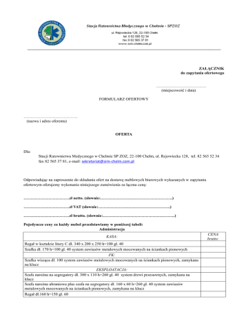 ZAŁĄCZNIK do zapytania ofertowego ……………………………… (miejscowość i data) FORMULARZ OFERTOWY ………………………………… (nazwa i adres oferenta) OFERTA Dla: Stacji Ratownictwa Medycznego w Chełmie SP ZOZ, 22-100 Chełm, ul. Rejowiecka 128, tel. 82 565 52 34 fax 82 565 37 81, e-mail: [email protected] Odpowiadając na zaproszenie do składania ofert na dostawę meblowych biurowych wykazanych w zapytaniu ofertowym oferujemy wykonanie niniejszego zamówienia za łączna cenę: ……………………………zł netto. (słownie:…………………………………………….) ……………………………zł VAT (słownie:…………………………………………….) ……………………………zł brutto. (słownie:…………………………………………….) Pojedyncze ceny za każdy mebel przedstawiamy w poniższej tabeli: Administracja KASA: Regał w kształcie litery C dł. 340 x 200 x 250 h=100 gł. 40 Szafka dł. 170 h=100 gł. 40 system zawiasów metalowych mocowanych na ściankach pionowych FK: Szafka wisząca dł. 100 system zawiasów metalowych mocowanych na ściankach pionowych, zamykana na klucz EKSPLOATACJA: Szafa narożna na segregatory dł. 300 x 110 h=260 gł. 40 system drzwi przesuwnych, zamykana na klucz Szafa narożna ubraniowa plus szafa na segregatory dł. 160 x 60 h=260 gł. 40 system zawiasów metalowych mocowanych na ściankach pionowych, zamykana na klucz Regał dł.160 h=150 gł. 60 CENA brutto: Regał dł. 80 h=150 gł. 60 Szafka wisząca dł. 100 system zawiasów metalowych mocowanych na ściankach pionowych, zamykana na klucz KADRY: Zabudowa szafy metalowej we wnęce o wymiarach dł. 115 h=210 gł. 70 system zawiasów metalowych mocowanych na ściankach pionowych Zabudowa dwóch szaf metalowych na dł. 220 plus szafa ubraniowa mała i na segregatory razem: dł. 300 h=260 gł. 70 system drzwi przesuwnych, zamykana na klucz Szafa na segregatory dł. 120 h=260 gł. 70 system zawiasów metalowych mocowanych na ściankach pionowych zamykana na klucz 2 Biurka pod komputer dł. 140 gł. 60 (2 szafki zamykane na klucz w biurku na dole) blat o grubości 25mm Regał dł. 60 h=150 gł. 60 Regał dł. 60 h=150 gł. 60 Szafka wisząca dł. 100 system zawiasów metalowych mocowanych na ściankach pionowych, zamykana na klucz SALA KONFERENCYJNA + ANEKS SOCJALNY: Stoły konferencyjne cztery warianty blatów (ćwierć koło 80 x80 * 4, półokrąg 80 *2, kwadrat 80 x80 *2, prostokąt 160 x 80 * 4) nogi rurki stalowe, blat o grubości 25mm Meble kuchenne o dł. 410 (zabudowa zmywarki 45, kuchenki elektrycznej dwupalnikowej, zlewozmywaka jednokomorowego nablatowego), szafki wiszące otwieranie do góry GABINET DYREKTORA: Biurko narożne dł. 230 x 140 gł. 60 blat o grubości 25mm, szafki w biurku zamykane na klucz SEKRETARIAT: Biurko narożne dł. 220 x 130 gł. 60 blat o grubości 25mm, szafki w biurku zamykane na klucz GABINET DYREKTORA MEDYCZNEGO/RADCA PRAWNY: Biurko narożne dł. 220 x 120 gł. 60 blat o grubości 25mm, szafki w biurku zamykane na klucz Parter Magazyn bielizny czystej: Regał narożny 120 x 210 (gł. 60 i 35) h=240 Pomieszczenie gospodarcze: Szafka stojąca dł. 80 h=70 gł. 50 system zawiasów metalowych mocowanych na ściankach pionowych, zamykana na klucz Pomieszczenie do dezynfekcji: Zabudowa ściany w kształcie litery C w szafki stojące i wiszące dł. 110 x 290 x 270 system zawiasów metalowych mocowanych na ściankach pionowych, zamykana na klucz Dyspozytornia: Szafka wisząca dł. 60 system zawiasów metalowych mocowanych na ściankach pionowych, zamykana na klucz Szafka wisząca dł. 100 gł. 35 system zawiasów metalowych mocowanych na ściankach pionowych Szafka stojąca z półką dł. 100 gł. 35 system zawiasów metalowych mocowanych na ściankach pionowych Magazyn leków: Regał dł. 220 h=250 Regał narożny dł. 200 x 110 gł. 60 Pomieszczenie sprzątaczek: Zabudowa wnęki regałami (trójkąt 140 x 190) Piętro pierwsze Lekarski C1: Wieszak wiszący na ścianie szer. 70 z półką Półka wisząca na ścianie dł. 100 (pojedynczy blat) Szafka/komoda dł. 100 system zawiasów metalowych mocowanych na ściankach pionowych P. Bożenka: Regał narożny 50 x 50 h=220 P. Anetta: Wieszak wiszący na ścianie szer. 60 Biurko w kształcie litery T dł. 310 x 150 szafki w biurku zamykane na klucz Regał narożny 50 x 50 h=260 Aneks kuchenny: Zabudowa kuchenna dł. 470 (zabudowa zmywarki 60, kuchenki elektrycznej, zlewozmywaka jednokomorowego nablatowego), plus szafki wiszące system zawiasów metalowych mocowanych na ściankach pionowych Świetlica: Stoły konferencyjne cztery warianty blatów (ćwierć koło 80 x80 * 4, półokrąg 80 *2, kwadrat 80 x80 *2, prostokąt 160 x 80 * 4) nogi rurki stalowe, blat o grubości 25mm Biurko komputerowe dł. 490 (2 stanowiska) w tym 3 szafki z szufladami Wieszak wiszący na ścianie szer. 90 Półka dł. 110 (pojedynczy blat) Szatnia: Wieszaki wiszące na ścianie szer. 150 i 70 Pokój pielęgniarek: Półka wisząca na ścianie dł. 200 (pojedynczy blat) Szafka nocna / stolik dł. 60 system zawiasów metalowych mocowanych na ściankach pionowych Pokój C9: Stolik dł. 100 Szafka wisząca narożna 50 x 50 h=80 system zawiasów metalowych mocowanych na ściankach pionowych Półka wisząca na ścianie dł. 100 (pojedynczy blat) Wieszak wiszący na ścianie szer. 40 Pokój lekarza C9: Stolik dł. 100 Szafka wisząca narożna dł. 50 h=100 system zawiasów metalowych mocowanych na ściankach pionowych Szafka narożna stojąca dł. 50 h=80 system zawiasów metalowych mocowanych na ściankach pionowych Wieszak wiszący na ścianie szer. 70 Szafka mała narożna 30 x 30 h=60 Pokój C1: Słupek dł. 34 h=140 gł. 40 system zawiasów metalowych mocowanych na ściankach pionowych Stolik dł. 100 Półka wisząca na ścianie dł. 100 (pojedynczy blat) Pokój C4: Słupek dł. 34 h=140 gł. 40 system zawiasów metalowych mocowanych na ściankach pionowy