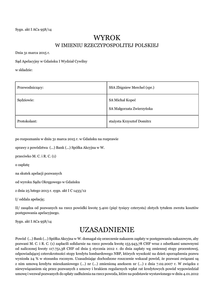 Sygn. akt I ACa 958/14 WYROK W IMIENIU RZECZYPOSPOLITEJ POLSKIEJ Dnia 31 marca 2015 r. Sąd Apelacyjny w Gdańsku I Wydział Cywilny w składzie: Przewodniczący: SSA Zbigniew Merchel (spr.) Sędziowie: SA Michał Kopeć SA Małgorzata Zwierzyńska Protokolant: stażysta Krzysztof Domitrz po rozpoznaniu w dniu 31 marca 2015 r. w Gdańsku na rozprawie sprawy z powództwa (...) Bank (...) Spółka Akcyjna w W. przeciwko M. C. i R. C. (1) o zapłatę na skutek apelacji pozwanych od wyroku Sądu Okręgowego w Gdańsku z dnia 25 lutego 2013 r. sygn. akt I C 1433/12 I/ oddala apelację; II/ zasądza od pozwanych na rzecz powódki kwotę 5.400 (pięć tysięcy czterysta) złotych tytułem zwrotu kosztów postępowania apelacyjnego. Sygn. akt I ACa 958/14 UZASADNIENIE Powód (...) Bank (...) Spółka Akcyjna w W. domagał się orzeczenie nakazem zapłaty w postępowaniu nakazowym, aby pozwani M. C. i R. C. (1) zapłacili solidarnie na rzecz powoda kwotę 153.943,78 CHF wraz z odsetkami umownymi od naliczonej kwoty 117.751,38 CHF od dnia 5 stycznia 2012 r. do dnia zapłaty wg zmiennej stopy procentowej, odpowiadającej czterokrotności stopy kredytu lombardowego NBP, których wysokość na dzień sporządzenia pozwu wyniosła 24 % w stosunku rocznym. Uzasadniając dochodzone roszczenie wskazał powód, że pozwani związani są z nim umową kredytu mieszkaniowego (...) nr (...) zmienioną aneksem nr (...) z dnia 7.02.2007 r. W związku z niewywiązaniem się przez pozwanych z umowy i brakiem regularnych wpłat rat kredytowych powód wypowiedział umowę i wezwał pozwanych do spłaty zadłużenia na rzecz powoda, które na podstawie wystawionego w dniu 4.01.2012 r. wyciągu z ksiąg Banku (...)/2012 r. wynosiło 117.751,38 CHF tytułem kapitału, 36.192,40 CHF z tytułu odsetek umownych za okres od dnia 5.09.2010 r. do 4.01.2012 r. W niniejszym procesie powód domagał się dodatkowo dalszych odsetek umownych od naliczonej kwoty 117.751,38 CHF od dnia 5 stycznia 2012 r. do dnia zapłaty wg zmiennej stopy procentowej, odpowiadającej czterokrotności stopy kredytu lombardowego NBP, których wysokość na dzień sporządzenia pozwu wyniosła 24 % w stosunku rocznym. 26 czerwca 2012 r. Sąd Okręgowy w Gdańsku w sprawie sygn. akt I Nc 123/12 wydał nakaz zapłaty w postępowaniu upominawczym, zgodnie z żądaniem pozwu. Od powyższego orzeczenia pozwani M. C. i R. C. (1) złożyli sprzeciw wnosząc o oddalenie powództwa i zasądzenie od powoda na rzecz pozwanych kosztów procesu. Wskazali, że strony zawarły ugodę pozasądową, która określała warunki spłaty zaległości z tytułu umowy kredytu mieszkaniowego (...). Wedle ich twierdzeń, na podstawie zawartej ugody pozwani zobowiązali się spłacić należność na rzecz powoda w wysokości 250.000 zł. Nadto, powódka zobowiązała się dochodzić odsetek od w/w kwoty, których wysokość nie miała przekraczać 24 % do dnia 31 marca 2012 r. Ze względu na trudną sytuację materialną na spełnienie całego świadczenia został wyznaczony natomiast termin do września. Nadto podnieśli, że przez cały czas podejmowali starania, by wywiązać się z zobowiązania. W tym celu poszukiwali potencjalnych zainteresowanych nieruchomością znajdującą się przy ul. (...) i nawet uzyskali list intencyjny od firmy (...), który miał stanowić zabezpieczenie kredytu. Działanie powódki wprowadzało ich w błąd. Z jednej strony zawierała ona bowiem ugody i sugerowała konieczność restrukturyzacji, a z drugiej strony wystosowała monity i kierowała sprawę na drogę postępowania sądowego. Nadto wskazali, że odsetki miały być naliczane dopiero po dniu 31.05.2012 r. a nie od 5.01.2012 r. Wskazali także, że działanie powódki jest dodatkowo sprzeczne z naturą stosunku prawnego oraz zasadami współżycia społecznego. Odsetki, które były wzięte na poziomie 1 CHF = 2,20 zł obecnie wynoszą 3,90 zł. Wyrokiem z dnia 25 lutego 2013 r. Sąd Okręgowy w Gdańsku uwzględnił powództwo i zasądził od pozwanych M. C. i R. C. (1) solidarnie na rzecz powoda (...) Bank (...) S.A. w W. kwotę 153.943,78 CHF wraz z odsetkami umownymi liczonymi od kwoty 117.751, 38 CHF od dnia 5 stycznia 2012 r. do dnia zapłaty według zmiennej stopy procentowej odpowiadającej czterokrotności stopy kredytu lombardowego NBP, których wysokość na dzień sporządzenia pozwu wynosi 24% w stosunku rocznym, a nadto zasądził od pozwanych solidarnie na rzecz powoda kwotę 29.617 zł tytułem zwrotu kosztów procesu. Sąd Okręgowy ustalił następujący stan faktyczny: W dniu 21.12.2006 r. powód (...) Bank (...) Spółka Akcyjna w W. zawarł z pozwanymi M. C. oraz R. C. (1) umowę kredytu mieszkaniowego (...) hipoteczny nr (...) w wysokości 124.953,89 CHF na finansowanie zakupu działek budowlanych nr (...) o łącznej powierzchni 6.422,00 m( 2) w miejscowości S. przy ul. (...) od (...) z przeznaczeniem na potrzeby własne. Na podstawie tej umowy pozwani zobowiązali się do spłaty kapitału wraz z odsetkami w ratach kapitałowo - odsetkowych. Zgodnie z § 6 (...) SA był uprawniony do pobierania odsetek od kredytu w walucie kredytu według zmiennej stopy procentowej, w stosunku rocznym, której wysokość jest ustalana w dniu rozpoczynającym pierwszy i kolejne trzymiesięczne okresy obowiązywania stawki referencyjnej, jako suma stawki referencyjnej i marży. Spłata zadłużenia następować miała w drodze potrącenia przez (...) SA swoich wierzytelności z tytułu udzielonego kredytu z rachunku oszczędnościowo - rozliczeniowego kredytobiorcy. Zgodnie z § 23 ust. 1 umowy powód miał przyznane uprawnienie do wypowiedzenia umowy kredytu w części dotyczącej warunków spłaty w przypadku niedokonania spłaty dwóch kolejnych rat w terminach określonych przez (...) SA w wysłanych do kredytobiorcy dwóch kolejnych zawiadomieniach, naruszenia przez kredytobiorcę postanowień umowy, czy wykorzystania kredytu niezgodnie z celem określonym w umowie. W