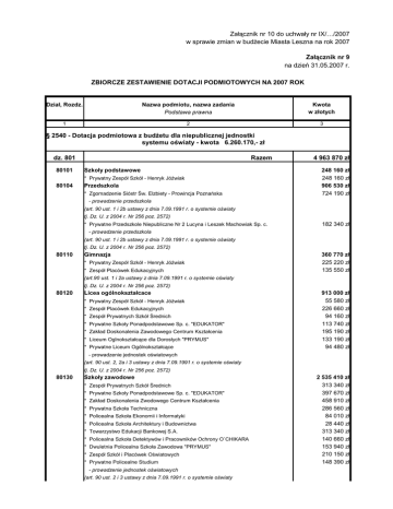 Załącznik nr 10 do uchwały nr IX/…/2007 w sprawie zmian w budŜecie Miasta Leszna na rok 2007 Załącznik nr 9 na dzień 31.05.2007 r. ZBIORCZE ZESTAWIENIE DOTACJI PODMIOTOWYCH NA 2007 ROK Dział, Rozdz. Nazwa podmiotu, nazwa zadania Podstawa prawna Kwota w złotych 1 2 3 § 2540 - Dotacja podmiotowa z budŜetu dla niepublicznej jednostki systemu oświaty - kwota 6.260.170,- zł dz. 801 80101 Razem Szkoły podstawowe * Prywatny Zespół Szkół - Henryk Jóźwiak 80104 Przedszkola * Zgomadzenie Sióstr Św. Elzbiety - Prowincja Poznańska 4 963 870 zł 248 160 zł 248 160 zł 906 530 zł 724 190 zł - prowadzenie przedszkola (art. 90 ust. 1 i 2b ustawy z dnia 7.09.1991 r. o systemie oświaty tj. Dz. U. z 2004 r. Nr 256 poz. 2572) * Prywatne Przedszkole Niepubliczne Nr 2 Lucyna i Leszek Machowiak Sp. c. 182 340 zł - prowadzenie przedszkola (art. 90 ust. 1 i 2b ustawy z dnia 7.09.1991 r. o systemie oświaty tj. Dz. U. z 2004 r. Nr 256 poz. 2572) 80110 Gimnazja * Prywatny Zespół Szkół - Henryk Jóźwiak * Zespół Placówek Edukacyjnych 360 770 zł 225 220 zł 135 550 zł (art.90 ust. 1 i 2a ustawy z dnia 7.09.1991 r. o systemie oświaty tj. Dz. U. z 2004 r. Nr 256 poz. 2572) 80120 Licea ogólnokształcace * Prywatny Zespół Szkół - Henryk Jóźwiak * Zespół Placówek Edukacyjnych * Zespół Prywatnych Szkół Średnich * Prywatne Szkoły Ponadpodstawowe Sp. c. "EDUKATOR" * Zakład Doskonalenia Zawodowego Centrum Kształcenia * Liceum Oglnokształcące dla Dorosłych "PRYMUS" * Prywatne Liceum Ogólnokształcące 913 000 zł 55 580 zł 226 660 zł 94 160 zł 113 740 zł 195 190 zł 133 190 zł 94 480 zł - prowadzenie jednostek oświatowych (art. 90 ust. 2, 2a i 3 ustawy z dnia 7.09.1991 r. o systemie oświaty tj. Dz. U. z 2004 r. Nr 256 poz. 2572) 80130 Szkoły zawodowe * Zespół Prywatnych Szkół Średnich * Prywatne Szkoły Ponadpodstawowe Sp. c. "EDUKATOR" * Zakład Doskonalenia Zwodowego Centrum Kształcenia * Prywatna Szkoła Techniczna * Policealna Szkoła Ekonomii i Informatyki * Policealna Szkoła Architektury i Budownictwa * Towarzystwo Edukacji Bankowej S.A. * Policealna Szkoła Detektywów i Pracowników Ochrony O`CHIKARA * Dwuletnia Policealna Szkoła Zawodowa "PRYMUS" * Zespół Szkół i Placówek Oświatowych * Prywatne Policealne Studium - prowadzenie jednostek oświatowych (art. 90 ust. 2 i 3 ustawy z dnia 7.09.1991 r. o systemie oświaty 2 535 410 zł 313 340 zł 397 670 zł 458 910 zł 286 560 zł 84 010 zł 28 440 zł 313 340 zł 140 660 zł 153 940 zł 210 150 zł 148 390 zł tj. Dz. U. z 2004 r. Nr 256 poz. 2572) 1 2 dz. 854 3 Razem 85402 Specjalne ośrodki wychowawcze 85402 * Ośrodek Rehabilitacyjno - Edukacyjno - Wychowawczy w Lesznie 1 296 300 zł 1 296 300 zł 1 296 300 zł - prowadzenie działalności rehabilitacyjno-wychowawczej (art. 90 ust. 3a ustawy z dnia 7.09.1991 r. o systemie oświaty tj. Dz. U. z 2004 r. Nr 256 poz. 2572) § 2480 - Dotacja podmiotowa z budŜetu dla samorządowej instytucji kultury - kwota 2.919.200,- zł dz. 921 Razem 92109 * Miejski Ośrodek Kultury w Lesznie 92110 * Miejskie Biuro Wystaw Artystycznych w Lesznie 92116 * Miejska Biblioteka Publiczna w Lesznie 2 919 200 zł 999 200 zł 250 000 zł 1 670 000 zł