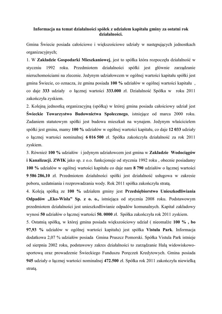 Informacja na temat działalności spółek z udziałem kapitału gminy za ostatni rok działalności. Gmina Świecie posiada całościowe i większościowe udziały w następujących jednostkach organizacyjnych; 1. W Zakładzie Gospodarki Mieszkaniowej, jest to spółka która rozpoczęła działalność w styczniu 1992 roku. Przedmiotem działalności spółki jest głównie zarządzanie nieruchomościami na zlecenie. Jedynym udziałowcem w ogólnej wartości kapitału spółki jest gmina Świecie, co oznacza, że gmina posiada 100 % udziałów w ogólnej wartości kapitału , co daje 333 udziały o łącznej wartości 333.000 zł. Działalność Spółka w roku 2011 zakończyła zyskiem. 2. Kolejną jednostką organizacyjną (spółką) w której gmina posiada całościowy udział jest Świeckie Towarzystwo Budownictwa Społecznego, istniejące od marca 2000 roku. Zadaniem statutowym spółki jest budowa mieszkań na wynajem. Jedynym właścicielem spółki jest gmina, mamy 100 % udziałów w ogólnej wartości kapitału, co daje 12 033 udziały o łącznej wartości nominalnej 6 016 500 zł. Spółka zakończyła działalność za rok 2011 zyskiem. 3. Również 100 % udziałów i jedynym udziałowcem jest gmina w Zakładzie Wodociągów i Kanalizacji. ZWIK jako sp. z o.o. funkcjonuje od stycznia 1992 roku , obecnie posiadamy 100 % udziałów w ogólnej wartości kapitału co daje nam 8 790 udziałów o łącznej wartości 9 586 286,10 zł. Przedmiotem działalności spółki jest działalność usługowa w zakresie poboru, uzdatniania i rozprowadzania wody. Rok 2011 spółka zakończyła stratą. 4. Koleją spółką ze 100 % udziałem gminy jest Przedsiębiorstwo Unieszkodliwiania Odpadów „Eko-Wisła” Sp. z o. o., istniejąca od stycznia 2008 roku. Podstawowym przedmiotem działalności jest unieszkodliwianie odpadów komunalnych. Kapitał zakładowy wynosi 50 udziałów o łącznej wartości 50. 0000 zł. Spółka zakończyła rok 2011 zyskiem. 5. Ostatnią spółką, w której gmina posiada większościowy udział ( nieomalże 100 % , bo 97,93 % udziałów w ogólnej wartości kapitału) jest spółka Vistula Park. Informacja dodatkowa 2,07 % udziałów posiada Gmina Pruszcz Pomorski. Spółka Vistula Park istnieje od sierpnia 2002 roku, podstawowy zakres działalności to zarządzanie Halą widowiskowosportową oraz prowadzenie Świeckiego Funduszu Poręczeń Kredytowych. Gmina posiada 945 udziały o łącznej wartości nominalnej 472.500 zł. Spółka rok 2011 zakończyła niewielką stratą. Ponadto Gmina posiada mniejszościowe udziały w następujących spółkach: 1. Zakład Usług Komunalnych, jest to spółka istniejąca od września 1995 roku, w której gmina Świecie posiada 100 udziałów o łącznej wartości nominalnej 50.000 zł, co daje 21,97 % udziałów w ogólnej wartości kapitału spółki. Rok 2011 spółka zakończyła zyskiem. 2.Kolejną taką spółką z mniejszościowym udziałem jest spółka Praterm Północ obecnie Dalkia Północ Sp z o.o. Aktualnie gmina posiada 10,81 % udziałów w ogólnej wartości kapitału spółki, co daje 6 405 udziałów o łącznej wartości nominalnej 3.202.500 zł. Spółka rok 2011 zakończyła zyskiem. 3. Ponadto gmina posiada 10 udziałów o łącznej wartości nominalnej 1 525 zł w Spółdzielni Pomóż Sam Sobie oraz 16 akcji o łącznej wartości nominalnej 1.600 zł w Międzykomunalnej Spółce Akcyjnej Municypium, wydawcy czasopisma Wspólnota, a także 4 udziały w Spółdzielni Mieszkaniowej w Świeciu o łącznej wartości 472,55 zł. Brak informacji nt zysku bądź straty w powyższych spółkach.