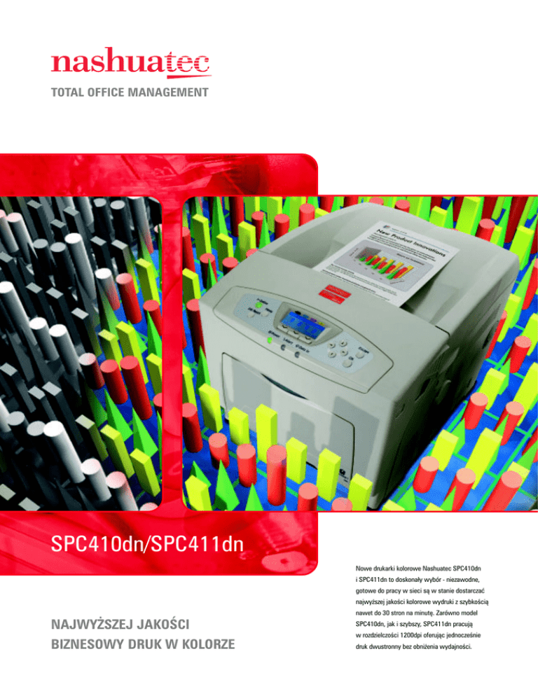 TOTAL OFFICE MANAGEMENT SPC410dn/SPC411dn Nowe drukarki kolorowe Nashuatec SPC410dn i SPC411dn to doskonały wybór - niezawodne, gotowe do pracy w sieci są w stanie dostarczać najwyższej jakości kolorowe wydruki z szybkością NAJWYŻSZEJ JAKOŚCI BIZNESOWY DRUK W KOLORZE nawet do 30 stron na minutę. Zarówno model SPC410dn, jak i szybszy, SPC411dn pracują w rozdzielczości 1200dpi oferując jednocześnie druk dwustronny bez obniżenia wydajności. Specyfikacja techniczna Nashuatec SPC410dn/SPC411dn Technologia druku Szybkość druku Czas druku pierwszej strony Czas nagrzewania Pojemność papieru Pojemność tacy odbiorczej Format druku Gramatura papieru Rodzaje nośników Łatwe zarządzanie papierem SPC410dn/SPC411dn obsługują papier o rozmiarach A4, A5 oraz B5 akceptując takie nośniki, jak etykiety, folie oraz koperty. Pojemność standardowej kasety na papier (550 arkuszy) może zostać powiększona do całkowitej wielkości 1750 arkuszy. Pozwoli to na znacznie dłuższą pracę ciągłą urządzenia i zmniejszy przestoje do minimum. Nadzwyczajna wydajność W nowych drukarkach Nashuatec SPC410dn/SPC411dn znacznie obniżono czas nagrzewania i czas uzyskania pierwszego wydruku. Model SPC410dn oferuje szybkość do 25 wydruków na minutę, podczas gdy SPC411dn aż 30 wydruków na minutę. Co więcej, korzystanie z druku dwustronnego nie wpływa znacząco na wydajność urządzenia, pozwala jednak na znaczne obniżenie zużycia papieru. Wysoka efektywność i redukcja kosztów Wysoka jakość wydruków i wydajność to nie wszystko. Liczą się również niskie koszty. Nowe drukarki Nashuatec SPC410dn/SPC411dn zostały tak skonstruowane, by jak najbardziej obniżyć całkowite koszty użytkowania. Dzięki możliwości zdefiniowania w standardzie do 100 kont użytkownika (do 500 z opcjonalnym modułem) administrator urządzenia zyskuje możliwość ograniczania użytkownikom możliwości drukowania w kolorze. Bezpieczeństwo poufnych danych Wraz z ewolucją urządzeń biurowych coraz większym zagrożeniem staje się utrata, bądź przechwycenie danych. Drukarki Nashuatec SPC410dn/ SPC411dn oferują cały szereg funkcji bezpieczeństwa, chroniących zasoby danych w firmie, są to: filtrowanie IP, restrykcje protokołu oraz różnorakie formy uwierzytelniania. Opcjonalny moduł DOS zapobiega możliwości kradzieży, bądź wycieku danych znajdujących się na dysku twardym drukarki. Współpraca z systemami korporacyjnymi Systemy korporacyjne stawiają przed urządzeniami wysokie wymagania nie tylko ze strony sprzętowej, ale również programowej. Użytkownicy takich systemów jak SAP R/3, Solaris czy HP-UX również oczekują pełnej funkcjonalności urządzeń. Drukarki SPC410dn/SPC411dn posiadają pełne wsparcie dla systemów korporacyjnych umożliwiające korzystanie ze wszystkich dostępnych możliwości. www.nashuatec.pl Źródło zasilania Pobór mocy Wymiary (szer. x głęb. x wys.) Waga specyfikacja kontrolera Procesor Rozdzielczość Pamięć Języki druku Protokoły sieciowe Kompatybilność Interfejsy standardowe Interfejsy opcjonalne laserowa, elektrostatyczna, toner dwuskładnikowy SPC410dn: 25 stron A4 na minutę kolor/mono SPC411dn: 30 stron A4 na minutę kolor/mono do 10 sekund mono i do 15 sekund kolor mniej niż 30 sekund standardowo: 550 arkuszy (kaseta), 100 arkuszy (podajnik ręczny) maksymalnie: 1750 arkuszy standardowo: 500 arkuszy A4 - A5 52-216g/m2 papier zwykły, papier cienki, papier gruby, folie, nalepki, koperty, papier z makulatury ~220/240V, 50/60Hz mniej niż 1,2kW, tryb oszczędzania energii: mniej niż 6W 446 x 589,5 x 487mm mniej niż 50 kg RM7035C (600 MHz) 1200dpi standardowo: 256MB, maksymalnie: 512MB, dysk twardy: 40GB (opcja) RPCS™, PCL5c, PCL6, Adobe® PostScript® 3™, PDF Direct Print, opcja: PictBridge TCP/IP, IPX/SPX, SMB (NetBEUI, NetBIOS przez TCP/IP), AppleTalk, IPP Windows® 95/98/ME/NT4.0/2000/XP/Server 2003 Novell® NetWare® 3.12/3.2/4.1/4.11/5.0/5.1/6/6.5 UNIX Sun® Solaris 2.6/7/8/9, HP-UX 10.x/11.x SCO Openserver 5.06 RedHat® Linux 6.x/7.x/8.x/9.x/Enterprise IBM® AIX 4.3/5L, V5.1/5L, 5.2 Macintosh 8.6-9.2.x (OS X Classic) Macintosh X 10.1 lub późniejsze SAP® R/3® 3.x lub późniejsze Ethernet 10Base-T/100BaseTX, USB 2.0 Wireless LAN IEEE802.11b, Bluetooth, FireWire IEEE1394, dwukierunkowy równoległy IEEE1284, Gigabit Ethernet, USB Host I/F oprogramowanie SmartDevice Monitor™ DeskTop Binder™ V2 Lite Printer Utility dla Macintosh® opcje Dysk twardy 40GB Pamięć 128/256MB SDRAM DIMM Dwukierunkowy IEEE1284 Wireless LAN Bluetooth Gigabit Ethernet USB Host I/F PictBridge Moduł rozszerzenia kont użytkowników (do 500) Kaseta na 2x550 arkuszy papieru Karta VM Wszystkie produkty Nashuatec spełniają normy jakości ISO 9001 oraz ochrony środowiska naturalnego ISO 14001. Zastrzegamy sobie prawo do wprowadzenia zmian w specyfikacji technicznej oraz wyglądzie produktów. Pełna gama produktów pokazana w tej publikacji może nie być zawsze dostępna. Wszystkie marki, nazwy i znaki towarowe należą do ich prawnych właścicieli.