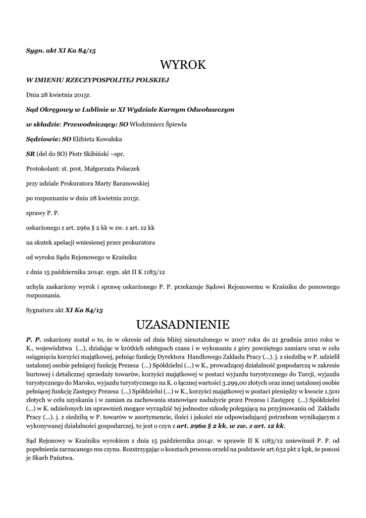 Sygn. akt XI Ka 84/15 WYROK W IMIENIU RZECZYPOSPOLITEJ POLSKIEJ Dnia 28 kwietnia 2015r. Sąd Okręgowy w Lublinie w XI Wydziale Karnym Odwoławczym w składzie: Przewodniczący: SO Włodzimierz Śpiewla Sędziowie: SO Elżbieta Kowalska SR (del do SO) Piotr Skibiński –spr. Protokolant: st. prot. Małgorzata Polaczek przy udziale Prokuratora Marty Baranowskiej po rozpoznaniu w dniu 28 kwietnia 2015r. sprawy P. P. oskarżonego z art. 296a § 2 kk w zw. z art. 12 kk na skutek apelacji wniesionej przez prokuratora od wyroku Sądu Rejonowego w Kraśniku z dnia 15 października 2014r. sygn. akt II K 1183/12 uchyla zaskarżony wyrok i sprawę oskarżonego P. P. przekazuje Sądowi Rejonowemu w Kraśniku do ponownego rozpoznania. Sygnatura akt XI Ka 84/15 UZASADNIENIE P. P. oskarżony został o to, że w okresie od dnia bliżej nieustalonego w 2007 roku do 21 grudnia 2010 roku w K., województwa (...), działając w krótkich odstępach czasu i w wykonaniu z góry powziętego zamiaru oraz w celu osiągnięcia korzyści majątkowej, pełniąc funkcję Dyrektora Handlowego Zakładu Pracy (...). j. z siedzibą w P. udzielił ustalonej osobie pełniącej funkcję Prezesa (...) Spółdzielni (...) w K., prowadzącej działalność gospodarczą w zakresie hurtowej i detalicznej sprzedaży towarów, korzyści majątkowej w postaci wyjazdu turystycznego do Turcji, wyjazdu turystycznego do Maroko, wyjazdu turystycznego na K. o łącznej wartości 3.299,00 złotych oraz innej ustalonej osobie pełniącej funkcję Zastępcy Prezesa (...) Spółdzielni (...) w K., korzyści majątkowej w postaci pieniędzy w kwocie 1.500 złotych w celu uzyskania i w zamian za zachowania stanowiące nadużycie przez Prezesa i Zastępcę (...) Spółdzielni (...) w K. udzielonych im uprawnień mogące wyrządzić tej jednostce szkodę polegającą na przyjmowaniu od Zakładu Pracy (...). j. z siedzibą w P. towarów w asortymencie, ilości i jakości nie odpowiadającej potrzebom wynikającym z wykonywanej działalności gospodarczej, to jest o czyn z art. 296a § 2 kk. w zw. z art. 12 kk. Sąd Rejonowy w Kraśniku wyrokiem z dnia 15 października 2014r. w sprawie II K 1183/12 uniewinnił P. P. od popełnienia zarzucanego mu czynu. Rozstrzygając o kosztach procesu orzekł na podstawie art.632 pkt 2 kpk, że ponosi je Skarb Państwa. Apelację od powyższego wyroku wniósł Prokurator. Zaskarżył wyrok w całości na niekorzyść oskarżonego i zarzucił rozstrzygnięciu: 1. obrazę przepisów postępowania, a mianowicie art. 4 k.p.k., 5 § 2 k.p.k., 7 k.p.k., 366 § 1 k.p.k. oraz 410 k.p.k. polegającą na nieuwzględnieniu przy wydawaniu wyroku całokształtu ujawnionych w toku rozprawy głównej i mających istotne znaczenie dla rozstrzygnięcia sprawy okoliczności, w szczególności wynikających z zeznań D. M., M. W., M. K., M. M. (1), W. M. (1), H. L. i W. M. (2) oraz wyjaśnień i zeznań M. M. (2) i A. S. w zakresie dotyczącym dostaw do spółki (...) towaru w ilości, jakości i terminie mogącym wyrządzić (...) Społem szkodę majątkową, w zamian za które doszło do wręczenia korzyści majątkowych, a także pominięcie zeznań W. M. (2) i D. M. w części dotyczącej roli oskarżonego P. P. w organizowaniu dla D. G. wyjazdów turystycznych w zamian za zachowania mogące wyrządzić szkodę dla kierowanej przez nią jednostki, a ponadto niewłaściwą i jednostronną ocenę poszczególnych dowodów oraz niedostatecznym uwzględnieniu okoliczności niekorzystnych dla oskarżonego i wskazujących na jego sprawstwo, co miało oczywisty wpływ na treść wyroku i w rezultacie spowodowało niesłuszne uniewinnienie oskarżonego P. P. od dokonania zarzucanego mu aktem oskarżenia czynu, 2. błąd w ustaleniach faktycznych przyjętych za podstawę wyroku polegający na wyrażeniu poglądu, że dowody ujawnione na rozprawie i ustalone na ich podstawie okoliczności nie są wystarczające do przyjęcia, że działanie oskarżonego P. P. polegające na obietnicy udzielenia korzyści majątkowej A. S. w zamian za wyrażenie zgody na podjęcie decyzji korzystnej dla spółki (...) w zakresie dotyczącym zwiększonej dostawy towaru nie stanowiło zachowania mogącego wyrządzić (...) Społem szkody majątkowej w rozumieniu art. 296a k.k. w sytuacji, gdy prawidłowa interpretacja umowy współpracy między spółka (...) a (...) Społem, jak też analiza zeznań świadków, w szczególności D. M., M. W., M. K., M. M. (1), W. M. (1), H. L. i M. M. (2) prowadzi do wniosku, że zwiększone dostawy godziły w interes gospodarczy Spółdzielni, co powinno skutkować przyjęciem, że doszło do realizacji znamion czynu określonego w art. 296a § 2 k.k., 3. błąd w ustaleniach faktycznych mający wpływ na treść wyroku, a polegający na wyrażeniu poglądu, że okoliczności ustalone na podstawie dowodów ujawnionych na rozprawie nie są wystarczające dla przypisania oskarżonemu P. P. sprawstwa czynu zabronionego określonego w art. 296a § 2 k.k. polegającego na udzieleniu Prezesowi (...) Spółdzielni (...) w K. korzyści majątkowej w postaci wyjazdów turystycznych o łącznej wartości 3299,00 złotych w sytuacji, gdy z uznanych przez Sąd za wiarygodne dowodów wynika, że przedmiotowe wycieczki zostały sfinansowane przez Spółkę (...), ich finansowanie nie znajdowało odzwierciedlenia w oficjalnej dokumentacji, oskarżony pełnił funkcję dyrektora handlowego spółki, do jego obowiązków należał kontakt z (...) Społem, wymieniony uczestniczył w organizacji tych wyjazdów i pełnił podczas nich rolę „przewodnika”, co powinno skutkować przyjęciem, że oskarżony dopuścił się popełnienia zarzucanego mu czynu. Stawiając powyższe zarzuty Prokurator wniósł na podstawie art.437 kpk o uchylenie zaskarżonego wyroku w całości i przekazanie sprawy do ponownego rozpoznania Sądowi Rejonowemu II Wydział Karny w K.. Sąd Okręgowy zważył co następuje. Apelacja Prokuratora jest zasadna w za