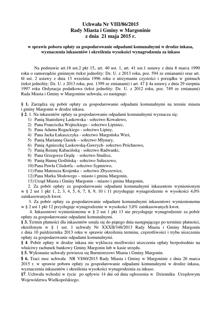 Uchwała Nr VIII/86/2015 Rady Miasta i Gminy w Margoninie z dnia 21 maja 2015 r. w sprawie poboru opłaty za gospodarowanie odpadami komunalnymi w drodze inkasa, wyznaczenia inkasentów i określenia wysokości wynagrodzenia za inkaso Na podstawie art.18 ust.2 pkt 15, art. 40 ust. 1, art. 41 ust.1 ustawy z dnia 8 marca 1990 roku o samorządzie gminnym (tekst jednolity: Dz. U. z 2013 roku, poz. 594 ze zmianami) oraz art. 6l ust. 2 ustawy z dnia 13 września 1996 roku o utrzymaniu czystości i porządku w gminach (tekst jednolity: Dz. U. z 2013 roku, poz. 1399 ze zmianami) i art. 47 § 4a ustawy z dnia 29 sierpnia 1997 roku Ordynacja podatkowa (tekst jednolity: Dz. U. z 2012 roku, poz. 749 ze zmianami) Rada Miasta i Gminy w Margoninie uchwala, co następuje: § 1. Zarządza się pobór opłaty za gospodarowanie odpadami komunalnymi na terenie miasta i gminy Margonin w drodze inkasa. § 2. 1. Na inkasentów opłaty za gospodarowanie odpadami komunalnymi wyznacza się: 1) Panią Stanisławę Laskowska - sołectwo Kowalewo, 2) Pana Franciszka Wojteckiego - sołectwo Lipiniec, 3) Pana Adama Rogackiego - sołectwo Lipiny, 4) Pana Jacka Łukaszczyka - sołectwo Margońska Wieś, 5) Panią Mariannę Gustek – sołectwo Młynary, 6) Panią Agnieszkę Laskowską-Gawrych- sołectwo Próchnowo, 7) Panią Renatę Kabacińską - sołectwo Radwanki, 8) Pana Grzegorza Grędę - sołectwo Studźce, 9) Panią Hannę Goślińską - sołectwo Sułaszewo, 10) Pana Pawła Cilsdorfa - sołectwo Sypniewo, 11) Pana Mateusza Krojenka – sołectwo Zbyszewice, 12) Pana Marka Słodowego – miasto i gmina Margonin, 13) Urząd Miasta i Gminy Margonin – miasto i gmina Margonin, 2. Za pobór opłaty za gospodarowanie odpadami komunalnymi inkasentom wymienionym w § 2 ust 1 pkt 1, 2, 3, 4, 5, 6, 7, 8, 9, 10 i 11 przysługuje wynagrodzenie w wysokości 4,0% zainkasowanych kwot. 3. Za pobór opłaty za gospodarowanie odpadami komunalnymi inkasentowi wymienionemu w § 2 ust 1 pkt 12 przysługuje wynagrodzenie w wysokości 3,0% zainkasowanych kwot. 4. Inkasentowi wymienionemu w § 2 ust 1 pkt 13 nie przysługuje wynagrodzenie za pobór opłaty za gospodarowanie odpadami komunalnymi. § 3. Termin płatności dla inkasentów ustala się do piątego dnia następującego po terminie płatności, określonym w § 1 ust. 1 uchwały Nr XXXII/348/2013 Rady Miasta i Gminy Margonin z dnia 10 października 2013 roku w sprawie określenia terminu, częstotliwości i trybu uiszczenia opłaty za gospodarowanie odpadami komunalnymi. § 4. Pobór opłaty w drodze inkasa nie wyklucza możliwości uiszczenia opłaty bezpośrednio na właściwy rachunek bankowy Gminy Margonin lub w kasie urzędu. § 5. Wykonanie uchwały powierza się Burmistrzowi Miasta i Gminy Margonin. § 6. Traci moc uchwała NR VI/60/2015 Rady Miasta i Gminy w Margoninie z dnia 26 marca 2015 r. w sprawie poboru opłaty za gospodarowanie odpadami komunalnymi w drodze inkasa, wyznaczenia inkasentów i określenia wysokości wynagrodzenia za inkaso. §7. Uchwała wchodzi w życie po upływie 14 dni od dnia ogłoszenia w Dzienniku Urzędowym Województwa Wielkopolskiego. Uzasadnienie do Uchwały Nr VIII/86/2015 Rady Miasta i Gminy w Margoninie z dnia 21 maja 2015 r. w sprawie poboru opłaty za gospodarowanie odpadami komunalnymi w drodze inkasa, wyznaczenia inkasentów i określenia wysokości wynagrodzenia za inkaso Zgodnie z ustawą z dnia 13 września 1996 roku o utrzymaniu czystości i porządku w gminach (tekst jednolity: Dz. U. z 2013 roku, poz. 1399 ze zmianami) gminy zobowiązane są do zorganizowania odbierania odpadów komunalnych od właścicieli nieruchomości, na których zamieszkują mieszkańcy. Na podstawie artykułu 6l ust 2 ustawy o utrzymaniu czystości i porządku w gminach rada gminy w drodze uchwały, może zarządzić pobór opłaty za gospodarowanie odpadami komunalnymi w drodze inkasa oraz wyznaczyć inkasentów i określić wysokość wynagrodzenia za inkaso. Inkasenci wymienieni w § 2 ust. 1 w punktach od 1 do 12 są osobami fizycznym nie związani z jednostkami organizacyjnymi. W przypadku, gdy inkasentem jest osoba fizyczna, rada winna jednoznacznie wskazać inkasenta w taki sposób, aby nie było żadnych wątpliwości na kogo obowiązek inkasenta został nałożony. Natomiast inkasentem wymienionym w § 2 ust.1 punkcie 13 jest Urząd Miasta i Gminy Margonin jako samorządowa jednostka organizacyjna. W przypadku gdy inkasentem jest osoba prawna lub jednostka organizacyjna nieposiadająca osobowości prawnej, rada musi wskazać nazwę tej jednostki. W niniejszej uchwale wymienionym w § 2 ust 1 punkcie 13 inkasentem jest urząd, w związku z tym to kierownik jednostki jest uprawniony do wyznaczenia osoby, która w imieniu inkasenta będzie pobierała opłatę i do określenia sposobu wynagradzania za te czynności. Wyznaczenie inkasentów udogodni i usprawni proces rozliczenia się za gospodarowanie odpadami komunalnymi mieszkańców z Gminą Margonin. W związku z powyższym podjęcie przedmiotowej uchwały jest uzasadnione.