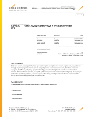 Szkolenie Compendium CE JĘZYK C++ - MODELOWANIE OBIEKTOWE Z WYKORZYSTANIEM UML Strona 1 z 5 Szkolenie: Compendium CE JęZYK C++ - MODELOWANIE OBIEKTOWE Z WYKORZYSTANIEM UML FORMA SZKOLENIA MATERIAŁY CENA Stacjonarne Tradycyjne 3200 PLN NETTO* Stacjonarne Tablet ctab 3600 PLN NETTO* Metoda dlearning Tradycyjne 3200 PLN NETTO* Metoda dlearning Tablet ctab 3200 PLN NETTO* *(+VAT zgodnie z obowiązującą stawką w dniu wystawienia faktury) INFORMACJE DODATKOWE Czas trwania szkolenia 5 dni Lokalizacje Kraków - ul. Tatarska 5, II piętro, godz. 9:00 - 16:00 Warszawa - ul. Bielska 17, godz. 9:00 - 16:00 OPIS SZKOLENIA Dzięki temu kursowi: poznasz język UML, który wprowadził porządek w skomplikowanym procesie projektowania, oraz podstawowe koncepcje inżynierii oprogramowania. Nauczysz się zarządzać procesem tworzenia oprogramowania, zbierać oraz analizować wymagania, identyfikować podsystemy, specyfikować interfejsy oraz testować. Znajdziesz tu wszystko na temat zarządzania zmianami. W trakcie szkolenia sprawdzisz, jak wygląda cykl życia oprogramowania oraz jak zarządzać konfiguracją. Nauczysz się jak przekształcać specyfikację projektową w program napisany w C++, który przetestujesz podczas budowania kolejnych modułów stosując stosowną metodologię należącą do "metod zwinnych". PLAN SZKOLENIA - Zaawansowane programowanie w języku C++ wraz z wykorzystaniem biblioteki STL - Standard C++11 - Wyrażenia lambda - Obsługa wyjątków Compendium Centrum Edukacyjne sp. z o.o. ul. Tatarska 5, 30-103 Kraków, tel.: (12) 298 47 77 ul. Bielska 17, 02-394 Warszawa, tel.: (22) 417 41 70 Bank BPH Spółka Akcyjna Oddział w Krakowie Numer konta: 74 1060 0076 0000 3210 0022 6028 Szkolenie Compendium CE JĘZYK C++ - MODELOWANIE OBIEKTOWE Z WYKORZYSTANIEM UML Strona 2 z 5 - Współbieżność i wielowątkowość - Wprowadzenie do inżynierii oprogramowania - Rozwiązywanie problemów a modelowanie - Zarządzanie projektami - Proces wytwarzana oprogramowania - Opis języka UML - Składnia i semantyka języka - Zastosowanie diagramów - Nakładanie ograniczeń za pomocą języka OCL - Implementacja składni UML w języku C++ - Diagramy i ich organizacja - Reguły notacji diagramów - Klasa diagramów strukturalnoopisowych - Diagramy klas - Diagramy komponentów Compendium Centrum Edukacyjne sp. z o.o. ul. Tatarska 5, 30-103 Kraków, tel.: (12) 298 47 77 ul. Bielska 17, 02-394 Warszawa, tel.: (22) 417 41 70 Bank BPH Spółka Akcyjna Oddział w Krakowie Numer konta: 74 1060 0076 0000 3210 0022 6028 Szkolenie Compendium CE JĘZYK C++ - MODELOWANIE OBIEKTOWE Z WYKORZYSTANIEM UML Strona 3 z 5 - Diagramy pakietów - Diagramy obiektów - Diagramy złożone - Klasa diagramów behawioralnych - Diagramy stanów - Diagramy interakcji - Diagramy przebiegów czasowych - Diagramy maszyny stanów - Zasady łączenia diagramów w złożone obiekty - Architektura sterowana modelem (MDA) - Modelowanie w języku UML - Systemy i ich modele - Abstrakcyjne typy danych i ich instancje - Zdarzenia i komunikaty - Modelowanie zorientowane obiektowo - Wzorce projektowe w modelowaniu Compendium Centrum Edukacyjne sp. z o.o. ul. Tatarska 5, 30-103 Kraków, tel.: (12) 298 47 77 ul. Bielska 17, 02-394 Warszawa, tel.: (22) 417 41 70 Bank BPH Spółka Akcyjna Oddział w Krakowie Numer konta: 74 1060 0076 0000 3210 0022 6028 Szkolenie Compendium CE JĘZYK C++ - MODELOWANIE OBIEKTOWE Z WYKORZYSTANIEM UML Strona 4 z 5 - Projektowanie interfejsów - Prototypowanie i falsyfikacja - Zasady organizacji projektów - Zbieranie wymagań projektowych - Analiza wymagań - Projektowanie modelu systemu - Odwzorowanie modelu na kod języka C++ - Testowanie systemu - Wdrożenie i konserwacja systemu - Zarządzanie konfiguracją systemu - Wprowadzanie poprawek i rozszerzeń - Zarządzanie projektem - Cykl życia oprogramowania - Informacje uzupełniające - Opis języka OCL - Tablice decyzyjne Compendium Centrum Edukacyjne sp. z o.o. ul. Tatarska 5, 30-103 Kraków, tel.: (12) 298 47 77 ul. Bielska 17, 02-394 Warszawa, tel.: (22) 417 41 70 Bank BPH Spółka Akcyjna Oddział w Krakowie Numer konta: 74 1060 0076 0000 3210 0022 6028 Szkolenie Compendium CE JĘZYK C++ - MODELOWANIE OBIEKTOWE Z WYKORZYSTANIEM UML Strona 5 z 5 WYMAGANIA DLA UCZESTNIKA - Znajomości języka C++ w podstawowym zakresie. - Doświadczenia w projektowania oprogramowania na podstawowym poziomie. CERTYFIKATY Uczestnicy szkolenia otrzymują certyfikat wystawiony imiennie oraz na firmę, sygnowany przez Compendium Centrum Edukacyjne. PROWADZĄCY Wykładowca Compendium Centrum Edukacyjnego. Compendium Centrum Edukacyjne sp. z o.o. ul. Tatarska 5, 30-103 Kraków, tel.: (12) 298 47 77 ul. Bielska 17, 02-394 Warszawa, tel.: (22) 417 41 70 Bank BPH Spółka Akcyjna Oddział w Krakowie Numer konta: 74 1060 0076 0000 3210 0022 6028