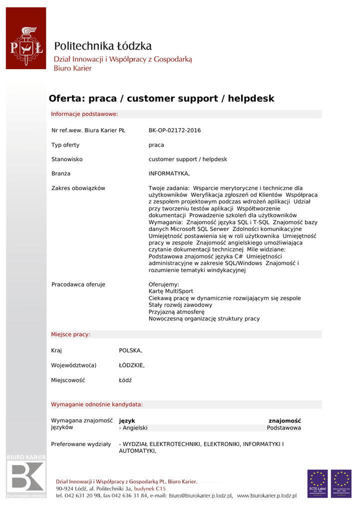 Oferta: praca / customer support / helpdesk Informacje podstawowe: Nr ref.wew. Biura Karier PŁ BK-OP-02172-2016 Typ oferty praca Stanowisko customer support / helpdesk Branża INFORMATYKA, Zakres obowiązków Twoje zadania: Wsparcie merytoryczne i techniczne dla użytkowników Weryfikacja zgłoszeń od Klientów Współpraca z zespołem projektowym podczas wdrożeń aplikacji Udział przy tworzeniu testów aplikacji Współtworzenie dokumentacji Prowadzenie szkoleń dla użytkowników Wymagania: Znajomość języka SQL i T-SQL Znajomość bazy danych Microsoft SQL Serwer Zdolności komunikacyjne Umiejętność postawienia się w roli użytkownika Umiejętność pracy w zespole Znajomość angielskiego umożliwiająca czytanie dokumentacji technicznej Mile widziane: Podstawowa znajomość języka C# Umiejętności administracyjne w zakresie SQL/Windows Znajomość i rozumienie tematyki windykacyjnej Pracodawca oferuje Oferujemy: Kartę MultiSport Ciekawą pracę w dynamicznie rozwijającym się zespole Stały rozwój zawodowy Przyjazną atmosferę Nowoczesną organizację struktury pracy Miejsce pracy: Kraj POLSKA, Województwo(a) ŁÓDZKIE, Miejscowość Łódź Wymaganie odnośnie kandydata: Wymagana znajomość języków język - Angielski Preferowane wydziały - WYDZIAŁ ELEKTROTECHNIKI, ELEKTRONIKI, INFORMATYKI I AUTOMATYKI, znajomość Podstawowa Preferowane kierunki dowolne Dane kontaktowe: Nazwa firmy/Pracodawcy Kraj Województwo Miasto Adres Kod pocztowy Email Bakk Sp. z o.o. POLSKA MAZOWIECKIE Warszawa ul. Ciołka 10 01-402 [email protected] Sposób aplikacji: cv Data umieszczenia: Oferta ważna od 26-09-2016 do 26-09-2017 Politechnika Łódzka, jest wpisana pod numerem 2414 do rejestru podmiotów prowadzących agencje zatrudnienia.