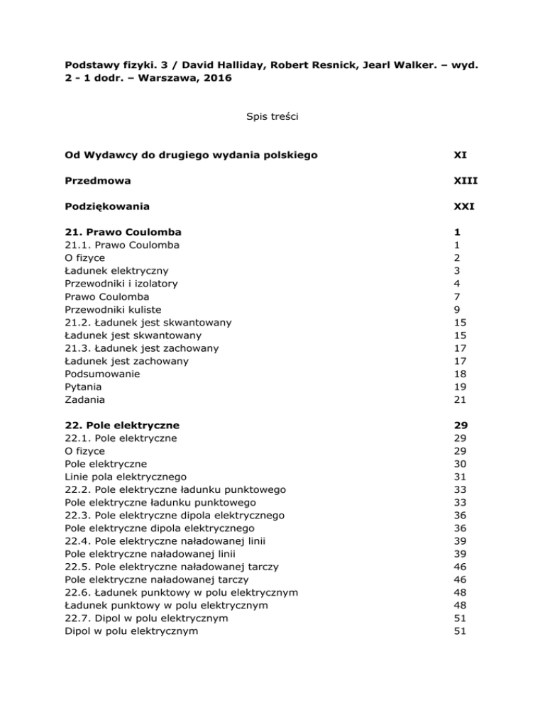 Podstawy fizyki. 3 / David Halliday, Robert Resnick, Jearl Walker. – wyd. 2 - 1 dodr. – Warszawa, 2016 Spis treści Od Wydawcy do drugiego wydania polskiego XI Przedmowa XIII Podziękowania XXI 21. Prawo Coulomba 21.1. Prawo Coulomba O fizyce Ładunek elektryczny Przewodniki i izolatory Prawo Coulomba Przewodniki kuliste 21.2. Ładunek jest skwantowany Ładunek jest skwantowany 21.3. Ładunek jest zachowany Ładunek jest zachowany Podsumowanie Pytania Zadania 1 1 2 3 4 7 9 15 15 17 17 18 19 21 22. Pole elektryczne 22.1. Pole elektryczne O fizyce Pole elektryczne Linie pola elektrycznego 22.2. Pole elektryczne ładunku punktowego Pole elektryczne ładunku punktowego 22.3. Pole elektryczne dipola elektrycznego Pole elektryczne dipola elektrycznego 22.4. Pole elektryczne naładowanej linii Pole elektryczne naładowanej linii 22.5. Pole elektryczne naładowanej tarczy Pole elektryczne naładowanej tarczy 22.6. Ładunek punktowy w polu elektrycznym Ładunek punktowy w polu elektrycznym 22.7. Dipol w polu elektrycznym Dipol w polu elektrycznym 29 29 29 30 31 33 33 36 36 39 39 46 46 48 48 51 51 Podsumowanie Pytania Zadania 55 56 58 23. Prawo Gaussa 23.1. Strumień pola elektrycznego O fizyce Strumień pola elektrycznego 23.2. Prawo Gaussa Prawo Gaussa Prawo Gaussa a prawo Coulomba 23.3. Izolowany przewodnik naładowany Izolowany przewodnik naładowany 23.4. Zastosowanie prawa Gaussa: symetria walcowa Zastosowanie prawa Gaussa: symetria walcowa 23.5. Zastosowanie prawa Gaussa: symetria płaszczyznowa Zastosowanie prawa Gaussa: symetria płaszczyznowa 23.6. Zastosowanie prawa Gaussa: symetria sferyczna Zastosowanie prawa Gaussa: symetria sferyczna Podsumowanie Pytania Zadania 67 67 67 69 74 74 76 79 79 83 83 86 86 89 89 91 92 93 24. Potencjał elektryczny 24.1. Potencjał elektryczny O fizyce Potencjał elektryczny i elektryczna energia potencjalna Ruch w polu elektrycznym 24.2. Powierzchnie ekwipotencjalne a pole elektryczne Powierzchnie ekwipotencjalne Obliczanie potencjału na podstawie natężenia pola 24.3. Potencjał pola naładowanej cząstki Potencjał pola naładowanej cząstki Potencjał pola układu naładowanych cząstek 24.4. Potencjał pola dipola elektrycznego Potencjał pola dipola elektrycznego Indukowany moment dipolowy 24.5. Potencjał pola ładunku o ciągłym rozkładzie Potencjał pola ładunku o ciągłym rozkładzie Naładowana linia Naładowana tarcza 24.6. Obliczanie natężenia pola na podstawie potencjału Obliczanie natężenia pola na podstawie potencjału 24.7. Elektryczna energia potencjalna układu naładowanych cząstek Elektryczna energia potencjalna układu naładowanych cząstek 102 102 103 103 105 103 109 110 113 114 115 117 117 118 119 119 120 121 122 122 124 124 24.8. Potencjał izolowanego naładowanego przewodnika Potencjał izolowanego naładowanego przewodnika Wyładowanie iskrowe z naładowanego przewodnika Izolowany przewodnik w zewnętrznym polu elektrycznym Podsumowanie Pytania Zadania 128 128 129 129 130 131 133 25. Pojemność elektryczna 25.1. Pojemność elektryczna O fizyce Pojemność elektryczna Ładowanie kondensatora 25.2. Obliczanie pojemności elektrycznej Obliczanie pojemności elektrycznej 25.3. Kondensatory połączone równolegle i szeregowo Kondensatory połączone równolegle i szeregowo 25.4. Energia zmagazynowana w polu elektrycznym Energia zmagazynowana w polu elektrycznym 25.5. Kondensator z dielektrykiem Kondensator z dielektrykiem Dielektryki: obraz mikroskopowy 25.6. Dielektryki i prawo Gaussa Dielektryki i prawo Gaussa Podsumowanie Pytania Zadania 143 143 143 144 145 146 146 151 151 157 157 160 161 16З 165 165 168 169 170 26. Prąd elektryczny i opór elektryczny 26.1. Prąd elektryczny O fizyce Prąd elektryczny 26.2. Gęstość prądu elektrycznego Gęstość prądu 26.3. Opór elektryczny i opór elektryczny właściwy Opór elektryczny i opór elektryczny właściwy 26.4. Prawo Ohma Prawo Ohma Prawo Ohma — obraz mikroskopowy 26.5. Moc w obwodach elektrycznych, półprzewodniki, nadprzewodniki Moc w obwodach elektrycznych Półprzewodniki Nadprzewodniki Podsumowanie Pytania 178 178 178 179 182 182 187 187 191 192 193 195 196 198 200 200 201 Zadania 203 27. Obwody elektryczne 27.1. Obwody elektryczne o jednym oczku O fizyce „Pompowanie" ładunków Praca, energia i SEM Obliczanie natężenia prądu w obwodzie o jednym oczku Inne obwody o jednym oczku Różnica potencjałów pomiędzy dwoma punktami 27.2. Obwody elektryczne o wielu oczkach Obwody o wielu oczkach 27.3. Amperomierz i woltomierz Amperomierz i woltomierz 27.4. Obwody RC Obwody RC Podsumowanie Pytania Zadania 210 210 211 211 212 214 216 218 222 223 230 230 231 232 237 237 239 28. Pole magnetyczne 28.1. POLE MAGNETYCZNE I DEFINICJA WEKTORA В O fizyce Co wytwarza pole magnetyczne? Definicja wektora В 28.2. Pola skrzyżowane: odkrycie elektronu Pola skrzyżowane: odkrycie elektronu 28.3. Pola skrzyżowane: zjawisko Halla Pola skrzyżowane: zjawisko Halla 28.4. Ruch cząstek naładowanych po okręgu w polu magnetycznym Ruch cząstek naładowanych po okręgu w polu magnetycznym Tory śrubowe 28.5. Cyklotrony i synchrotrony Cyklotrony i synchrotrony Synchrotron protonów 28.6. Siła magnetyczna działająca na przewodnik z prądem Siła magnetyczna działająca na przewodnik z prądem 28.7. Moment siły działający na ramkę z prądem Moment siły działający na ramkę z prądem 28.8. Dipolowy moment magnetyczny Dipolowy moment magnetyczny Podsumowanie Pytania Zadania 251 251 251 252 253 258 258 260 261 265 265 267 269 269 271 272 272 275 275 277 278 281 281 283 29. Pole magnetyczne wywołane przepływem prądu 29.1. Pole magnetyczne wywołane przepływem prądu O fizyce Obliczanie indukcji magnetycznej pola wywołanego przepływem prądu 29.2. Siły działające między dwoma równoległymi przewodami z prądem Siły działające między dwoma równoległymi przewodami z prądem 29.3. PRAWO AMPERE'A Prawo Ampere'a 29.4. Solenoidy i toroidy Solenoidy i tor