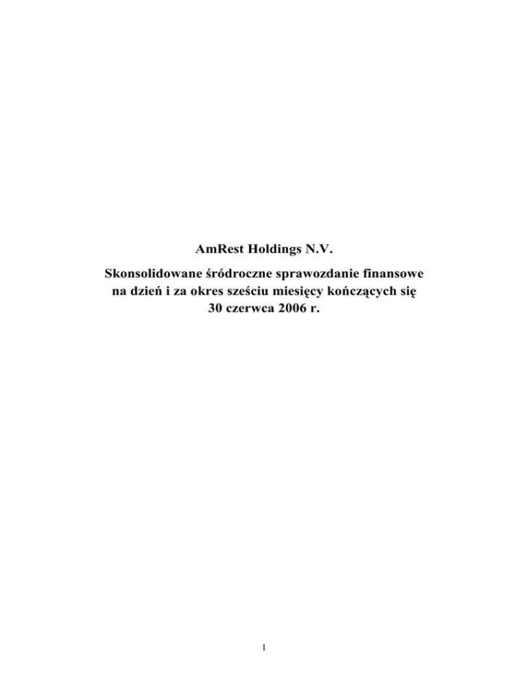 AmRest Holdings N.V. Skonsolidowane śródroczne sprawozdanie finansowe na dzień i za okres sześciu miesięcy kończących się 30 czerwca 2006 r. 1 AmRest Holdings N.V. Spis treści: Strona Skonsolidowany śródroczny rachunek zysków i strat 3 Skonsolidowany śródroczny bilans 4 Skonsolidowany śródroczny rachunek przepływów pienięŜnych 5 Skonsolidowane śródroczne zestawienie zmian w kapitale własnym 6 Noty do skonsolidowanego śródrocznego sprawozdania finansowego 7 2 AmRest Holdings N.V. Skonsolidowany śródroczny rachunek zysków i strat za okres 6 miesięcy kończący się 30 czerwca 2006 Noty 2006 W tysiącach złotych 2005 (po przekształceniu) Przychody z działalności restauracji 3 Koszty bezpośrednie działalności restauracji: 5 280 009 227 863 Koszty artykułów Ŝywnościowych (94 470) (76 851) Bezpośrednie koszty marketingu (14 157) (12 515) Bezpośrednie koszty amortyzacji (18 448) (14 096) Koszty wynagrodzeń oraz świadczeń na rzecz pracowników (53 215) (42 247) Koszty opłat licencyjnych (franczyzowych) (16 602) (13 583) Koszty najmu oraz pozostałe koszty operacyjne Koszty działalności restauracji razem Zysk brutto na sprzedaŜy (48 874) (39 402) (245 766) (198 694) 34 243 29 169 Koszty ogólnego zarządu 5 (17 191) (18 602) Koszty amortyzacji (ogólnego zarządu) 5 (1 004) (658) Pozostałe przychody operacyjne 6 1 646 2 252 Zysk/(strata) ze zbycia niefinansowych aktywów trwałych 10 2 213 (717) Aktualizacja wartości aktywów 5 (1 495) (911) - (1 937) 18 412 8 596 Koszty emisji akcji na rynku pierwotnym Zysk z działalności operacyjnej Przychody finansowe 3,7 6 149 1 917 Koszty finansowe 3,8 (2 825) (6 092) Udział w zyskach jednostek stowarzyszonych 3,30 346 99 22 082 4 520 3,9 (3 131) 3 434 3 18 951 7 954 9 Zysk przed opodatkowaniem Podatek dochodowy Zysk netto Przypadający na: Udziały mniejszości Akcjonariuszy jednostki dominującej Podstawowy i rozwodniony zysk na jedną akcję w złotych 28 42 24 18 909 7 930 1,40 0,70 Skonsolidowany rachunek zysków i strat naleŜy analizować łącznie z notami, które stanowią integralną część skonsolidowanego sprawozdania finansowego 3 AmRest Holdings N.V. Skonsolidowany śródroczny bilans na dzień 30 czerwca 2006 oraz 31 grudnia 2005 Noty 2006 w tysiącach złotych 2005 (po przekształceniu) Aktywa Rzeczowy majątek trwały 10 184 626 174 141 Wartości niematerialne 11 15 205 16 280 Wartość firmy 12 23 757 4 765 940 574 Pozostałe aktywa długoterminowe Inwestycje długoterminowe w jednostkach stowarzyszonych 3, 30 13 18 468 17 342 Aktywa z tytułu odroczonego podatku dochodowego od osób prawnych 9 10 358 11 540 253 354 224 642 Aktywa trwałe razem Zapasy 14 7 416 5 973 NaleŜności z tytułu dostaw i usług oraz pozostałe naleŜności 15 9 481 13 463 1 463 5 282 NaleŜności z tytułu podatku dochodowego od osób prawnych Pozostałe aktywa obrotowe 16 5 622 4 788 Środki pienięŜne i ich ekwiwalenty 17 20 613 31 575 Aktywa przeznaczone do sprzedaŜy 18 1 700 3 219 46 295 64 300 299 649 288 942 Aktywa obrotowe razem Aktywa razem 3 Kapitał własny 19 Kapitał podstawowy 519 519 Kapitały zapasowe 218 834 218 640 Straty z lat ubiegłych (95 514) (117 641) Zysk netto 18 909 22 127 RóŜnice kursowe z przeliczenia (3 337) (574) 139 411 123 071 62 20 139 473 123 091 20 73 590 80 440 2,25 3 429 3 237 825 791 Kapitał własny przypadający na akcjonariuszy jednostki dominującej Udziały mniejszości Kapitały razem Zobowiązania Kredyty i poŜyczki długoterminowe Zobowiązania z tytułu leasingu finansowego Zobowiązania z tytułu wynagrodzeń oraz świadczeń na rzecz pracowników 21 Rezerwy 22 4 547 4 690 Zobowiązanie z tytułu podatku odroczonego Pozostałe zobowiązania długoterminowe 9 23 1 012 2 477 1 263 2 168 85 880 92 589 9 362 18 321 63 45 64 871 54 896 74 296 73 262 160 176 165 851 299 649 288 942 Zobowiązania długoterminowe razem Kredyty i poŜyczki krótkoterminowe 20 Zobowiązania z tytułu leasingu finansowego 2,25 Zobowiązania z tytułu dostaw i usług oraz pozostałe zobowiązania 24 Zobowiązania krótkoterminowe razem Zobowiązania razem Pasywa razem 3 Skonsolidowany bilans naleŜy analizować łącznie z notami, które stanowią integralną część skonsolidowanego sprawozdania finansowego 4 AmRest Holdings N.V. Skonsolidowany śródroczny rachunek przepływów pienięŜnych za okres 6 miesięcy kończący się 30 czerwca 2006 Noty 2006 w tysiącach złotych 2005 (po przekształceniu) Przepływy środków pienięŜnych z działalności operacyjnej Zysk przed opodatkowaniem Korekty: Zysk z udziałów w jednostek stowarzyszonych Amortyzacja wartości niematerialnych i prawnych Amortyzacja rzeczowych aktywów trwałych Koszty odsetek, netto (Zyski)/straty z tytułu róŜnic kursowych na działalności finansowej (Zyski)/stratay ze zbycia niefinansowych aktywów trwałych Aktualizacja wartości niefinansowych aktywów trwałych Koszty dotyczące płatności w formie akcji własnych Umorzenie poŜyczki Zmiany stanu kapitału obrotowego: Zmiana stanu naleŜności Zmiana stanu zapasów Zmiana stanu pozostałych aktywów Zmiana stanu zobowiązań oraz pozostałych zobowiązań Zmiana stanu rezerw i zobowiązań z tytułu wynagrodzeń oraz świadczeń na rzecz pracowników 22 082 4 520 (346) 2 815 16 637 2 009 (2 544) (2 213) 1 404 194 (3 396) (99) 1 051 13 703 4 307 779 717 911 66 - 8 159 (53) (1 891) 7 147 79 251 (7 583) (2 646) (2 498) (1 340) (1 671) (1 374) (3 110) 41 351 2 648 (3 406) 271 14 229 Przepływy pienięŜne netto z działalności inwestycyjnej (20 235) 3 952 (19 890) (486) (10) (36 669) (6 581) 1 932 6 (19 405) (380) (24 428) Przepływy środków pienięŜnych z działalności finansowej Wpływy z wydania akcji Wpływy z tytułu zaciągniętych kredytów i poŜyczek Spłaty kredytów i poŜyczek Spłata zobowiązań z tyt. leasingu finansowego 5 643 (20 693) (210) 77 866 154 344 (214 716) (166) Przepływy pienięŜne netto z działalności finansowej (15 260