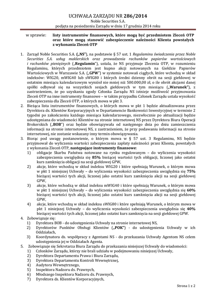 UCHWAŁA ZARZĄDU NR 286/2014 Noble Securities S.A. podjęta na posiedzeniu Zarządu w dniu 17 grudnia 2014 roku w sprawie: listy instrumentów finansowych, które mogą być przedmiotem Zleceń OTP oraz które mogą stanowić zabezpieczenie należności Klienta powstałych z wykonania Zleceń OTP 1. Zarząd Noble Securities S.A. („NS”), na podstawie § 57 ust. 1 Regulaminu świadczenia przez Noble Securities S.A. usług maklerskich oraz prowadzenia rachunków papierów wartościowych i rachunków pieniężnych („Regulamin”), ustala, że NS przyjmuje Zlecenia OTP, w rozumieniu Regulaminu, których przedmiotem jest kupno akcji notowanych na Giełdzie Papierów Wartościowych w Warszawie S.A. („GPW”) w systemie notowań ciągłych, które wchodzą w skład indeksów: WIG20, mWIG40 lub sWIG80 i których średni dzienny obrót na sesji giełdowej w ostatnim miesiącu kalendarzowym wyniósł nie mniej niż 500.000,00 zł, o ile obrót akcjami danej spółki odbywał się na wszystkich sesjach giełdowych w tym miesiącu („Warunek”), z zastrzeżeniem, że po uzyskaniu zgody Członka Zarządu NS istnieje możliwość przyjmowania Zleceń OTP na inne instrumenty finansowe – w takim przypadku Członek Zarządu ustala wysokość zabezpieczenia dla Zleceń OTP, o których mowa w pkt 3. 2. Bieżąca lista instrumentów finansowych, o których mowa w pkt 1 będzie aktualizowana przez Dyrektora ds. Klientów Korporacyjnych w Departamencie Bankowości Inwestycyjnej w terminie 2 tygodni po zakończeniu każdego miesiąca kalendarzowego, niezwłocznie po aktualizacji będzie udostępniana do wiadomości Klientów na stronie internetowej NS przez Dyrektora Biura Operacji Brokerskich („BOB”) oraz będzie obowiązywała od następnego dnia po dniu zamieszczenia informacji na stronie internetowej NS, z zastrzeżeniem, że przy podawaniu informacji na stronie internetowej, nie zostanie wskazany inny termin obowiązywania. 3. Biorąc pod uwagę postanowienie, o którym mowa w § 57 ust. 3 Regulaminu, NS będzie przyjmował do wyliczenia wartości zabezpieczenia zapłaty należności przez Klienta, powstałych z wykonania Zleceń OTP, następujące instrumenty finansowe: 1) obligacje Skarbu Państwa notowane na rynku regulowanym – do wyliczenia wysokości zabezpieczenia uwzględnia się 85% bieżącej wartości tych obligacji, liczonej jako ostatni kurs zamknięcia obligacji na sesji giełdowej GPW, 2) akcje, które wchodzą w skład indeksu WIG20 i które spełniają Warunek, o którym mowa w pkt 1 niniejszej Uchwały – do wyliczenia wysokości zabezpieczenia uwzględnia się 75% bieżącej wartości tych akcji, liczonej jako ostatni kurs zamknięcia akcji na sesji giełdowej GPW, 3) akcje, które wchodzą w skład indeksu mWIG40 i które spełniają Warunek, o którym mowa w pkt 1 niniejszej Uchwały – do wyliczenia wysokości zabezpieczenia uwzględnia się 60% bieżącej wartości tych akcji, liczonej jako ostatni kurs zamknięcia akcji na sesji giełdowej GPW, 4) akcje, które wchodzą w skład indeksu sWIG80 i które spełniają Warunek, o którym mowa w pkt 1 niniejszej Uchwały – do wyliczenia wysokości zabezpieczenia uwzględnia się 40% bieżącej wartości tych akcji, liczonej jako ostatni kurs zamknięcia na sesji giełdowej GPW. 4. Zobowiązuje się: 1) Dyrektora BOB - do udostępnienia Uchwały na stronie internetowej NS, 2) Dyrektorów Punktów Obsługi Klientów („POK”) - do udostępnienia Uchwały w ich Oddziałach, 3) Koordynatora ds. współpracy z Agentami NS - do przekazania Uchwały Agentom NS celem udostępnienia jej w Oddziałach Agenta. 5. Zobowiązuje się Sekretarza Biura Zarządu do przekazania niniejszej Uchwały do wiadomości: 1) Członków Zarządu, którzy nie brali udziału w podejmowaniu niniejszej Uchwały, 2) Dyrektora Departamentu Prawa i Biura Zarządu, 3) Dyrektora Departamentu Kontroli Wewnętrznej, 4) Audytora Wewnętrznego, 5) Inspektora Nadzoru ds. Prawnych, 6) Młodszego Inspektora Nadzoru ds. Prawnych, 7) Dyrektora ds. Klientów Korporacyjnych, Strona 1 z 2 UCHWAŁA ZARZĄDU NR 286/2014 Noble Securities S.A. podjęta na posiedzeniu Zarządu w dniu 17 grudnia 2014 roku 8) Dyrektora BOB, 9) Dyrektora Departamentu Sieci Oddziałów, 10) Dyrektorów POK, 11) Koordynatora ds. współpracy z Agentami NS, 12) pracowników Biura Prawnego. 6. Z dniem wejścia w życie niniejszej Uchwały, traci ważność Uchwała Zarządu NS Nr 190/2014 z 12 sierpnia 2014 r. 7. Uchwała wchodzi w życie z dniem 2 stycznia 2015 r. Liczba Członków Zarządu Liczba obecnych Członków Zarządu Uprawnionych do głosowania Głosów „ZA” Głosów „PRZECIW” Głosów „WSTRZYMUJĄCYCH SIĘ” Imię i nazwisko Dominik Ucieklak Stanowisko p.o. Prezesa Zarządu Norbert Kozioł Wiceprezes Zarządu Iwona Ustach Wiceprezes Zarządu 3 Podpis członka Zarządu Strona 2 z 2